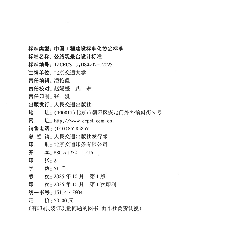 书名:公路观景台设计标准(T/CECS G:D84-02—2025)