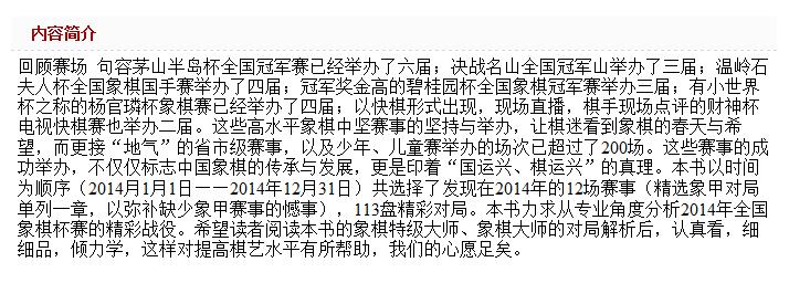 布局撷英 第局五六炮对屏风马… 第局五七炮互进三兵对屏风马边卒右马外盘河… 第局五八炮进三兵对屏风马… 第局中炮直横车七路马对屏风马两头蛇… 第局飞相对右士角炮(一)… 第局飞相对右士角炮(二)… 第二届“财神杯”电视快棋赛 第局广东 庄玉庭 胜 黑龙江 陶汉明 飞相对右过宫炮… 第局湖北 汪洋 胜 浙江 赵鑫鑫 飞相对右士角炮… 第局上海 孙勇征 胜 四川 郑惟桐 中炮七路马对屏风马双炮过河… 第局北京 王天一 胜 上海 谢靖 对兵局… 第局广东 庄玉庭 胜 黑龙江 赵国荣 飞相对右过宫炮… 第局北京 王天一 胜 上海 孙勇征 顺炮缓开车对直车… 第局浙江 于幼华 负 湖北 柳大华 对兵局… 第局湖北 汪洋 胜 广东 庄玉庭 仙人指路对左中炮… 第局湖北 柳大华 负 北京 王天一 飞相对右过宫炮… 第局湖北 汪洋 负 北京 王天一 仙人指路对飞象… 第四届“周庄杯”海峡两岸象棋大师赛 第局内蒙古 王天一 胜 厦门 郑一泓 仙人指路对飞象… 第局上海 谢靖 胜 黑龙江 聂铁文 仙人指路对卒底炮… 第局江苏 王斌 胜 河北 陆伟韬 飞相对右士角炮… 第局北京 蒋川 胜 河北 申鹏 飞相对右士角炮… 第局河南 武俊强 负 内蒙古 王天一 中炮进三兵对屏风马… 第局内蒙古 王天一 胜 广东 许国义 飞相对右士角炮… 第局河北 申鹏 胜 浙江 赵鑫鑫 飞相对左中炮… 第局江苏 王斌 负 四川 郑惟桐 飞相对左过宫炮… 第局厦门 陈鸿盛 胜 内蒙古 洪智 仙人指路对卒底炮… 第局广东 许国义 胜 厦门 郑一泓 中炮对后补列炮… 第局浙江 于幼华 胜 山东 才溢 五七炮进三兵对屏风马… 第局四川 郑惟桐 胜 上海 谢靖 边马对进卒… 第局江苏 徐超 负 内蒙古 王天一 仙人指路对卒底炮… 第局内蒙古 王天一 胜 四川 郑惟桐 飞相对左过宫炮… 第六届“句容茅山半岛杯”全国象棋冠军邀请赛 第局北京 王天一 负 广东 吕钦 五七炮进三兵对屏风马… 第局上海 孙勇征 负 上海 谢靖 过宫炮对进马… 第局内蒙古 洪智 负 内蒙古 王天一 起马对进卒… 第局江苏 徐天红 负 广东 许银川 中炮七路马对屏风马双炮过河… 第局黑龙江 赵国荣 胜 北京 蒋川 仙人指路对卒底炮… 第局黑龙江 陶汉明 胜 浙江 于幼华 中炮七路马对屏风马双炮过河… 第局北京 王天一 胜 黑龙江 赵国荣 仙人指路对卒底炮… 第局北京 蒋川 负 上海 孙勇征 仙人指路对卒底炮… 第局浙江 赵鑫鑫 负 上海 谢靖 五七炮进三兵对屏风马… 第局黑龙江赵国荣 胜 广东吕钦 五七炮进三兵对屏风马… 第局内蒙古 王天一 胜 上海 谢靖 对兵局… “荪湖杯”决战名山全国象棋冠军赛 第局河北 申鹏 胜 上海 谢靖 中炮过河车对屏风马… 第局内蒙古 王天一 胜 江苏 王斌 五七炮进三兵对屏风马… 第局蒙古 王天一 胜 四川 郑惟桐 中炮过河车对屏风马平炮兑车红急进中兵… 第局四川 郑惟桐 胜 上海 谢靖 中炮进三兵对屏风马右横车… 第局广东 许银川 胜 天津 孟辰 中炮边马过河车对屏风马两头蛇… 第局河北 申鹏 胜 黑龙江 赵国荣 中炮过河车对屏风马左象左马盘河… 第局四川 郑惟桐 胜 内蒙古 王天一 仙人指路对卒底炮… 第局浙江 赵鑫鑫 胜 湖北 汪洋 仙人指路对飞象… 第局四川 郑惟桐 胜 浙江 赵鑫鑫 中炮过河车对屏风马左马盘河… 第局广东 许银川 胜 河北 申鹏 飞相对右士角炮… 第局四川 郑惟桐 胜 广东 许银川 对兵局… 世界智力精英运动会象棋选拔赛 第局四川 郑惟桐 胜 大连 赵金成 仙人指路对进马… 第局北京 蒋川 胜 四川 郑惟桐 中炮过河车对屏风马平炮兑车… 第局北京 蒋川 胜 大连 赵金成 中炮进三兵对三步虎… 第局天津 孟辰 负 四川 郑惟桐 仙人指路对卒底炮… 第局四川 郑惟桐 胜 天津 孟辰 五七炮对反宫马… 第六届“杨官璘杯”全国象棋公开赛 第局内蒙古 王天一 胜 黑龙江 陶汉明 仙人指路对卒底炮… 第局黑龙江 陶汉明 负 河南 武俊强 起马对进卒… 第局黑龙江 聂铁文 负 北京 蒋川 仙人指路对卒底炮… 第局内蒙古 王天一 胜 河南 武俊强 飞相对进马… 第局山东 赵金成 胜 北京 张申宏 起马对进卒… 第局厦门 党斐 负 湖北 刘宗泽 仙人指路对卒底炮… 第局山东 李翰林 胜 湖北 刘宗泽 仙人指路对卒底炮… 第局中国棋院杭州分院 刘子健 负 山东 李翰林 五七炮进三兵对屏风马… 第局广西 陈富杰 负 北京 张申宏 仙人指路对卒底炮… 第四届“温岭石夫人杯”全国象棋国手赛 第局湖北 汪洋 负 内蒙古 洪智 飞相对进卒… 第局四川 郑惟桐 胜 内蒙古 洪智 对兵局… 第局黑龙江 赵国荣 负 大体协 王跃飞 仙人指路对卒底炮… 第局四川 郑惟桐 胜 湖北 汪洋 对兵局… 第局内蒙古 洪智 负 广东 吕钦 五七炮进三兵对屏风马… 第局大体协 王跃飞 负 内蒙古 王天一 中炮过河车对屏风马平炮兑车… 第局广东 许银川 负 内蒙古 王天一 飞相对右士角炮… 第六届“淮阴·韩信杯”象棋国际名人赛 第局中国香港 黄学谦 胜 中国 许银川 中炮直横车对屏风马两头蛇… 第局中国 王天一 胜 芬兰 邓明高 起马对进卒… 第局中国 王斌 胜 中国 孙勇征 中炮进三兵对屏风马… 第局中国 孙勇征 负 中国 赵鑫鑫 仙人指路对卒底炮… 第局中国 赵鑫鑫 负 德国 濮方尧 对兵局… 第局中国香港 黄学谦 负 中国 王天一 对兵局… “中骏·黄金海岸杯”第十八届亚洲象棋锦标赛 第局中国 