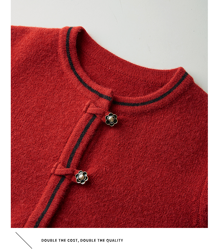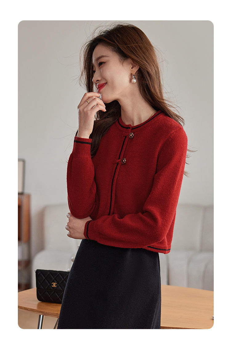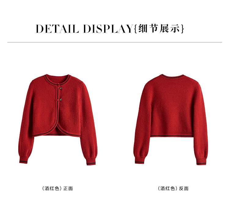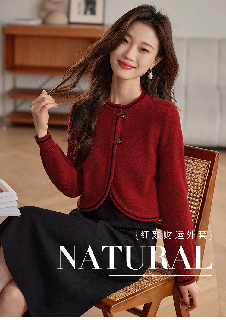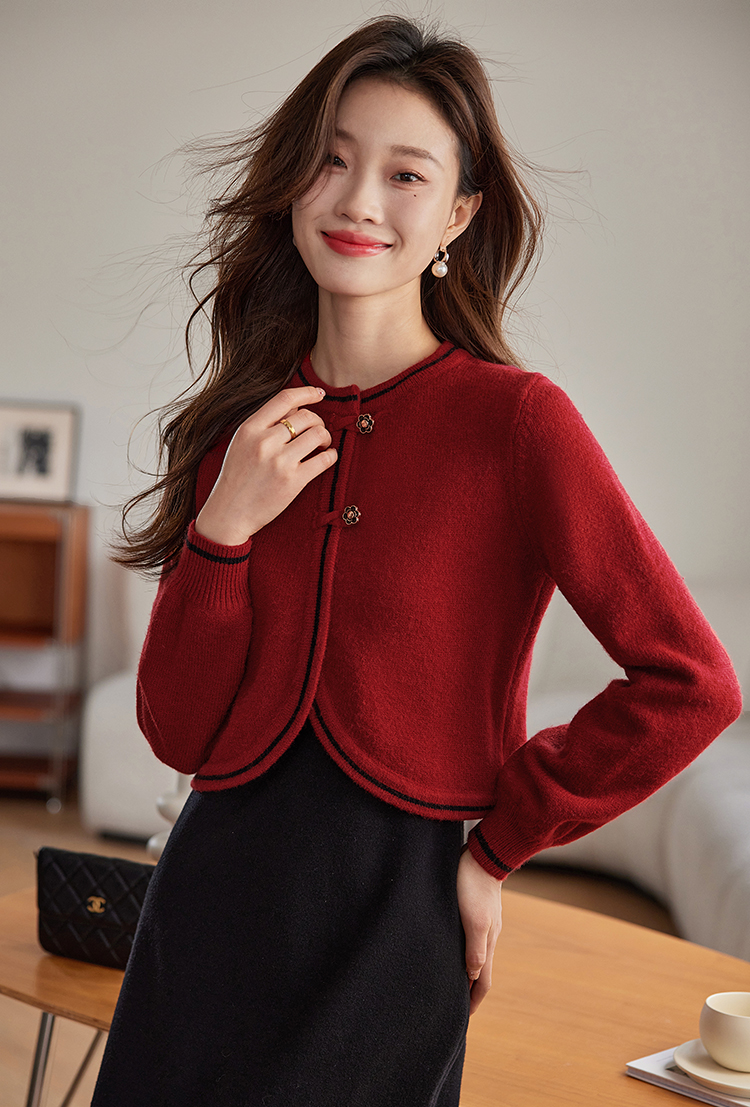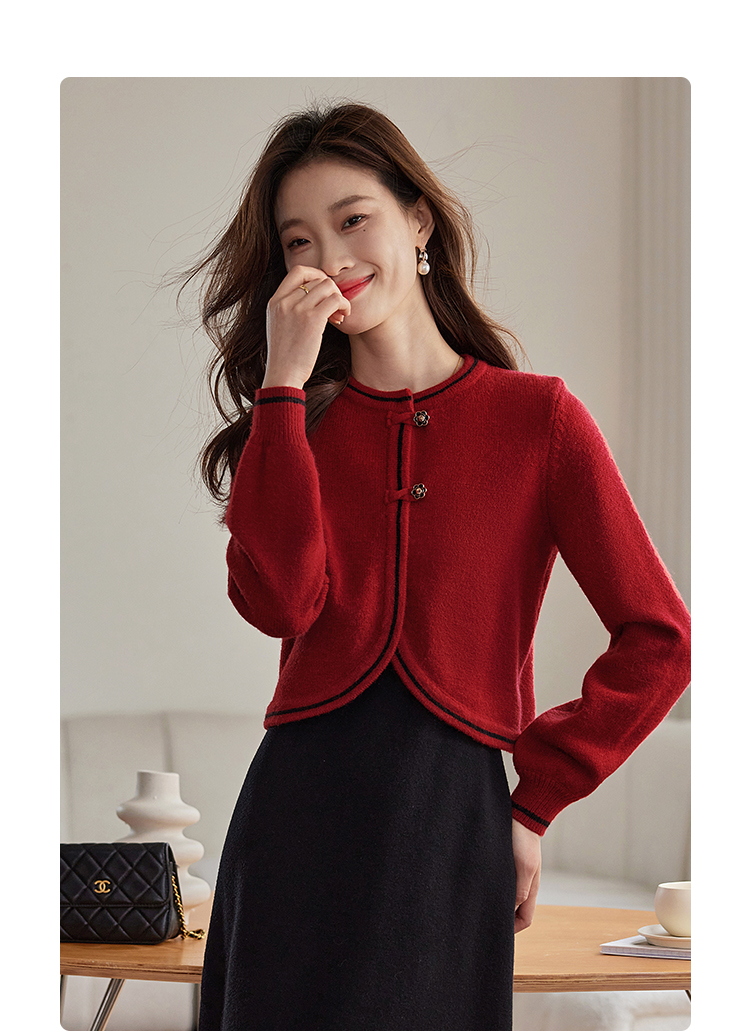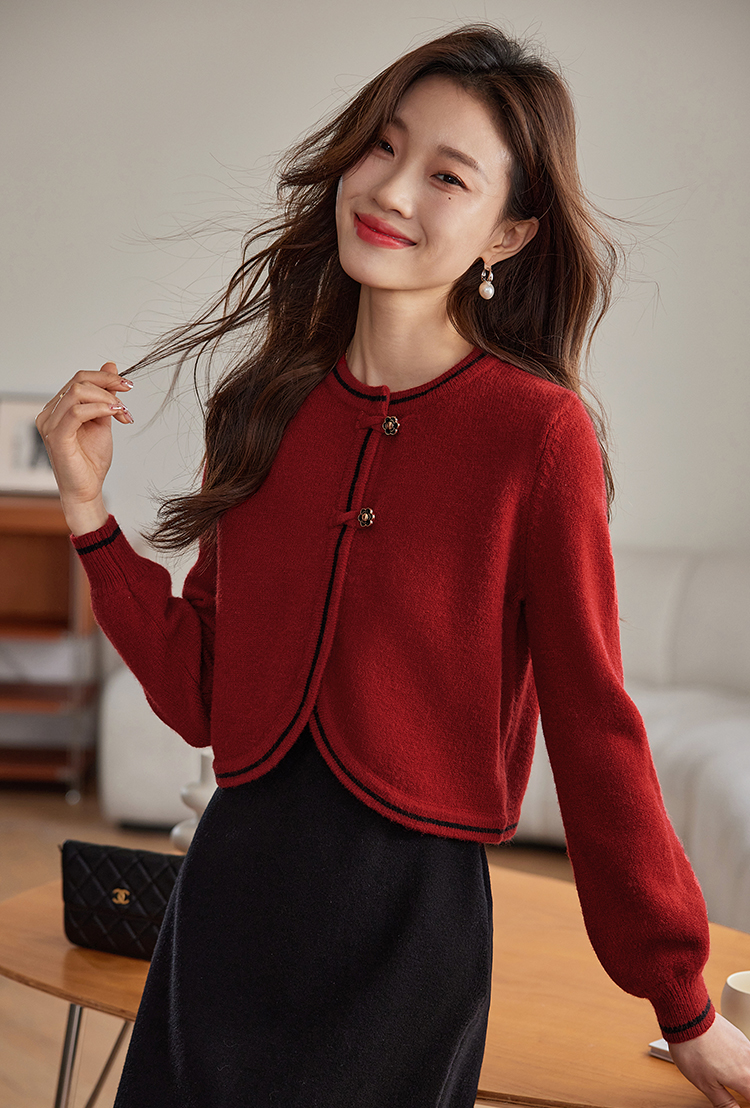 【专属特价】熙世界红色毛衣开衫女短外套新中式轻国风针织衫秋冬