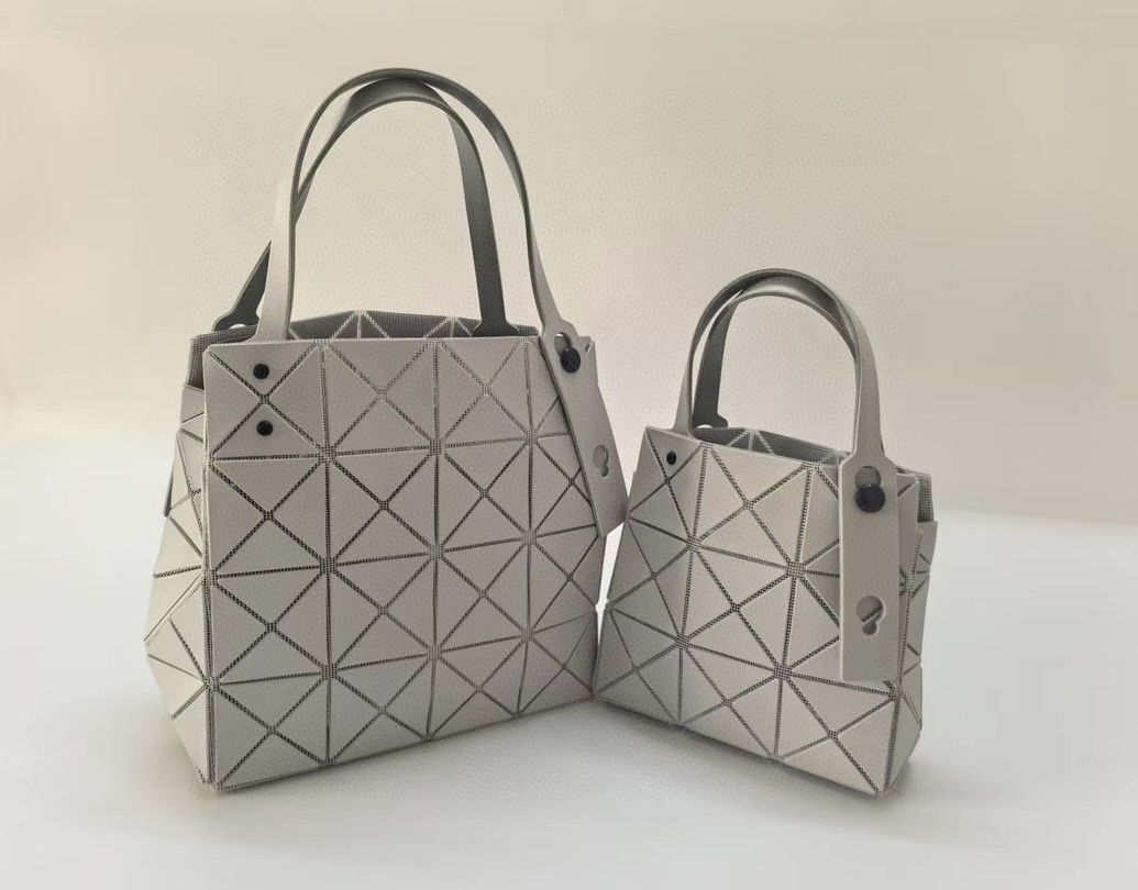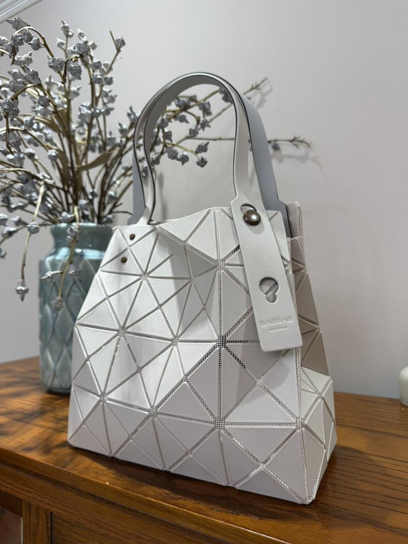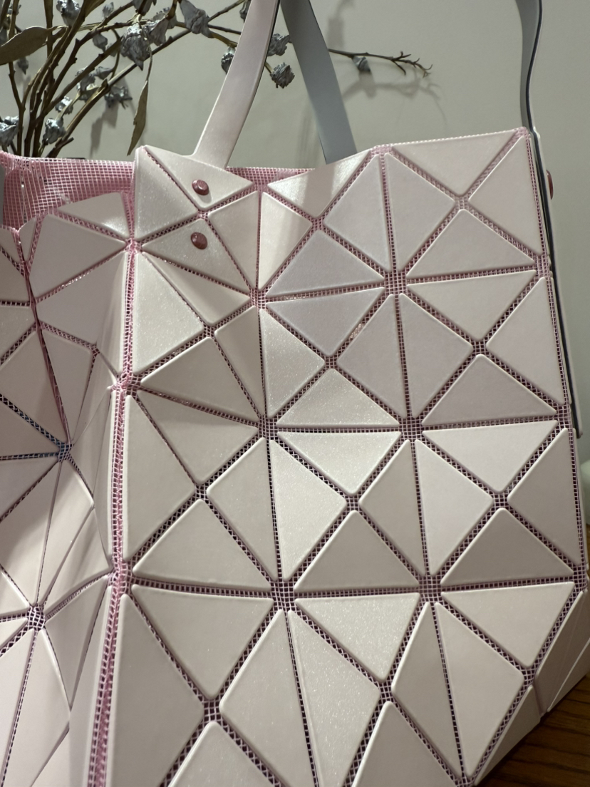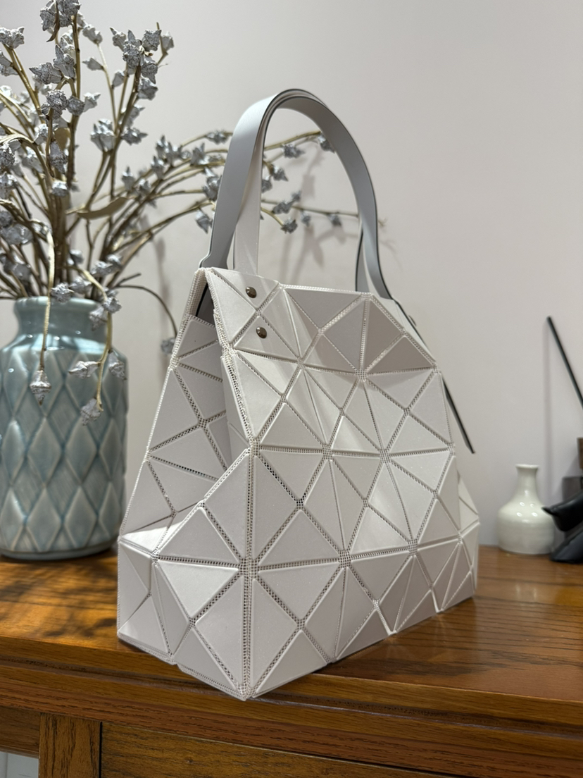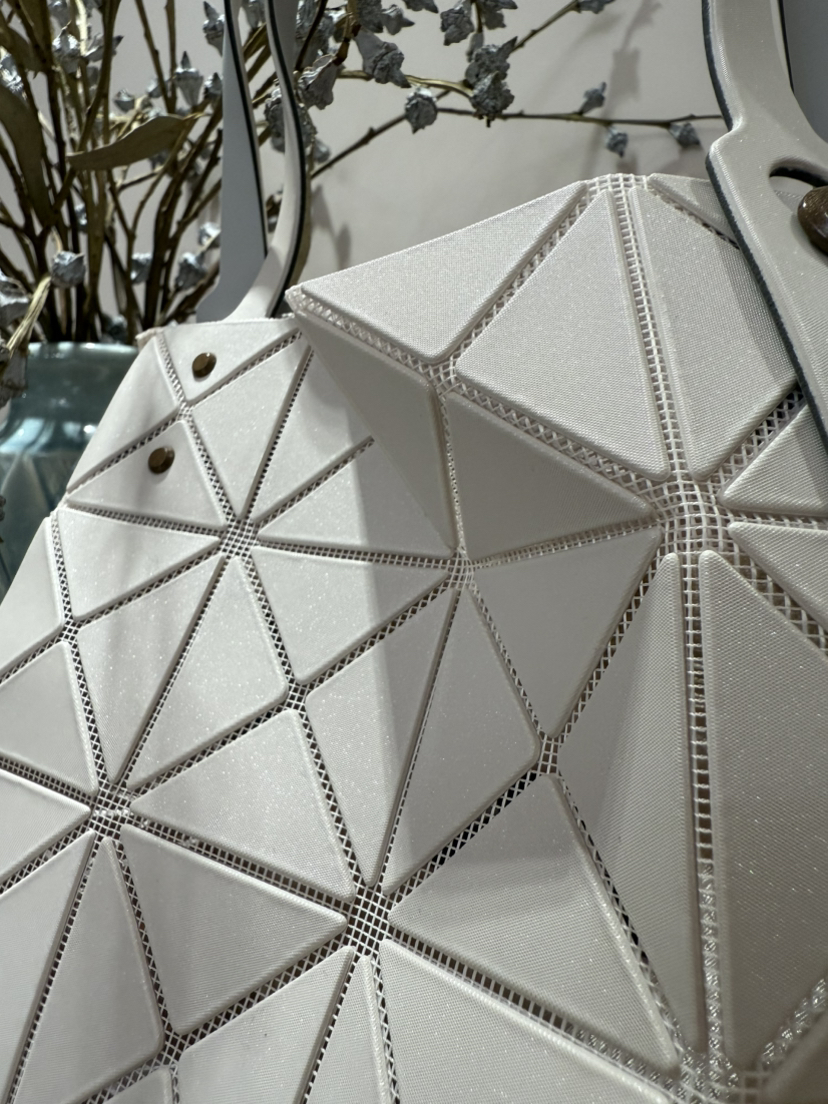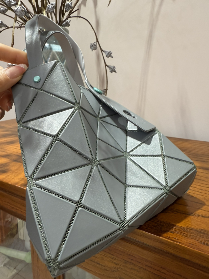 拥有宝雕石刻般的外形,三角的片组合构成了经典手的提包状形。哑光材质耐脏不说,还有细闪钻光。