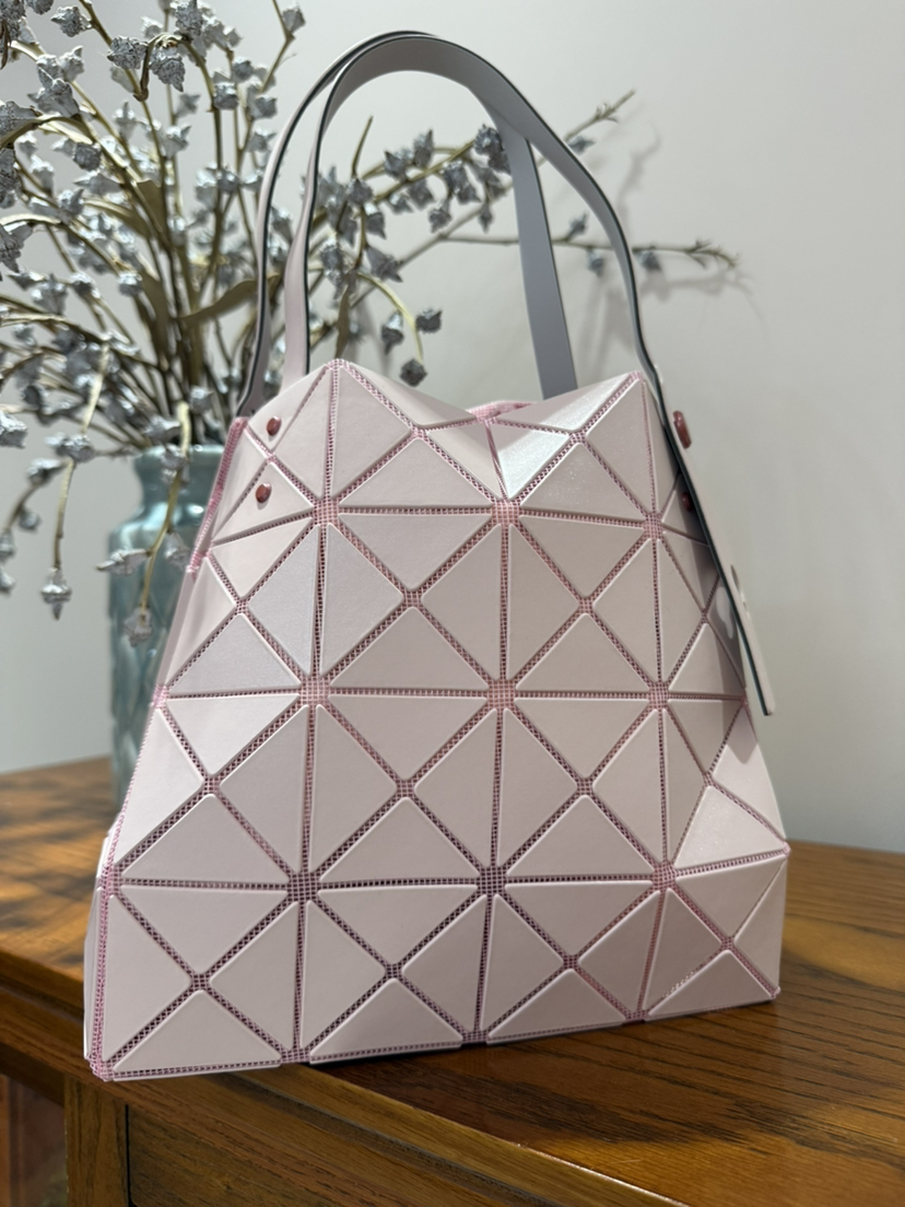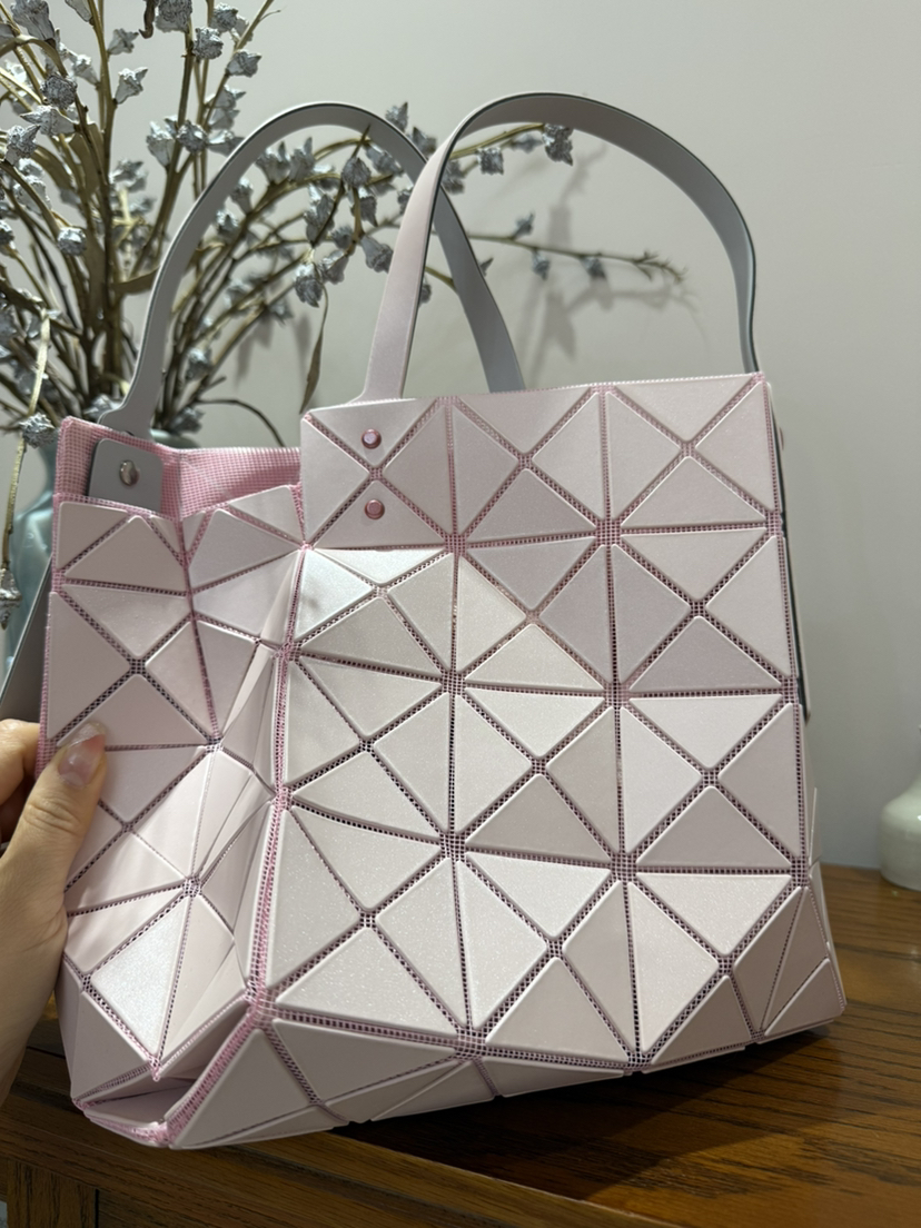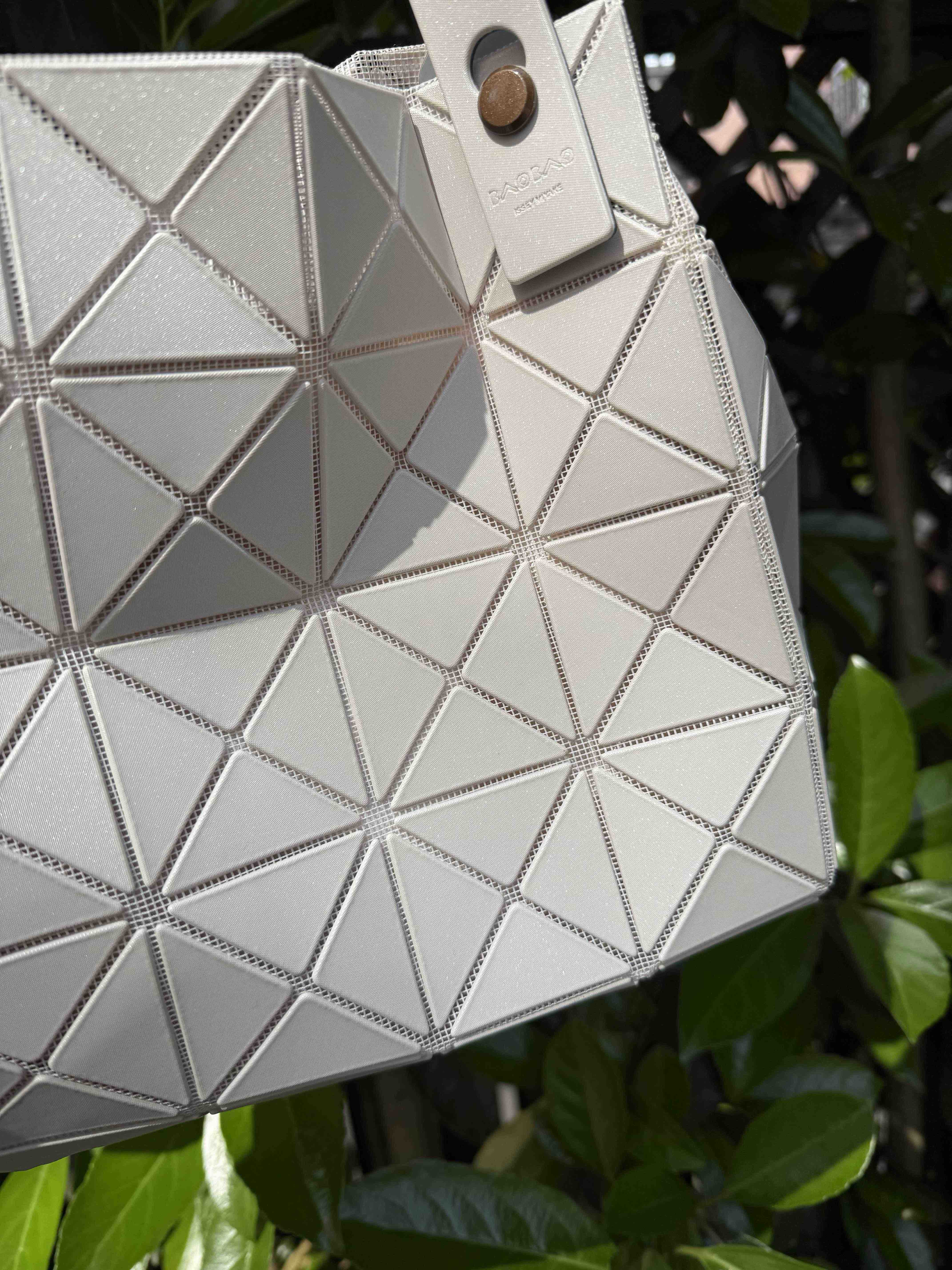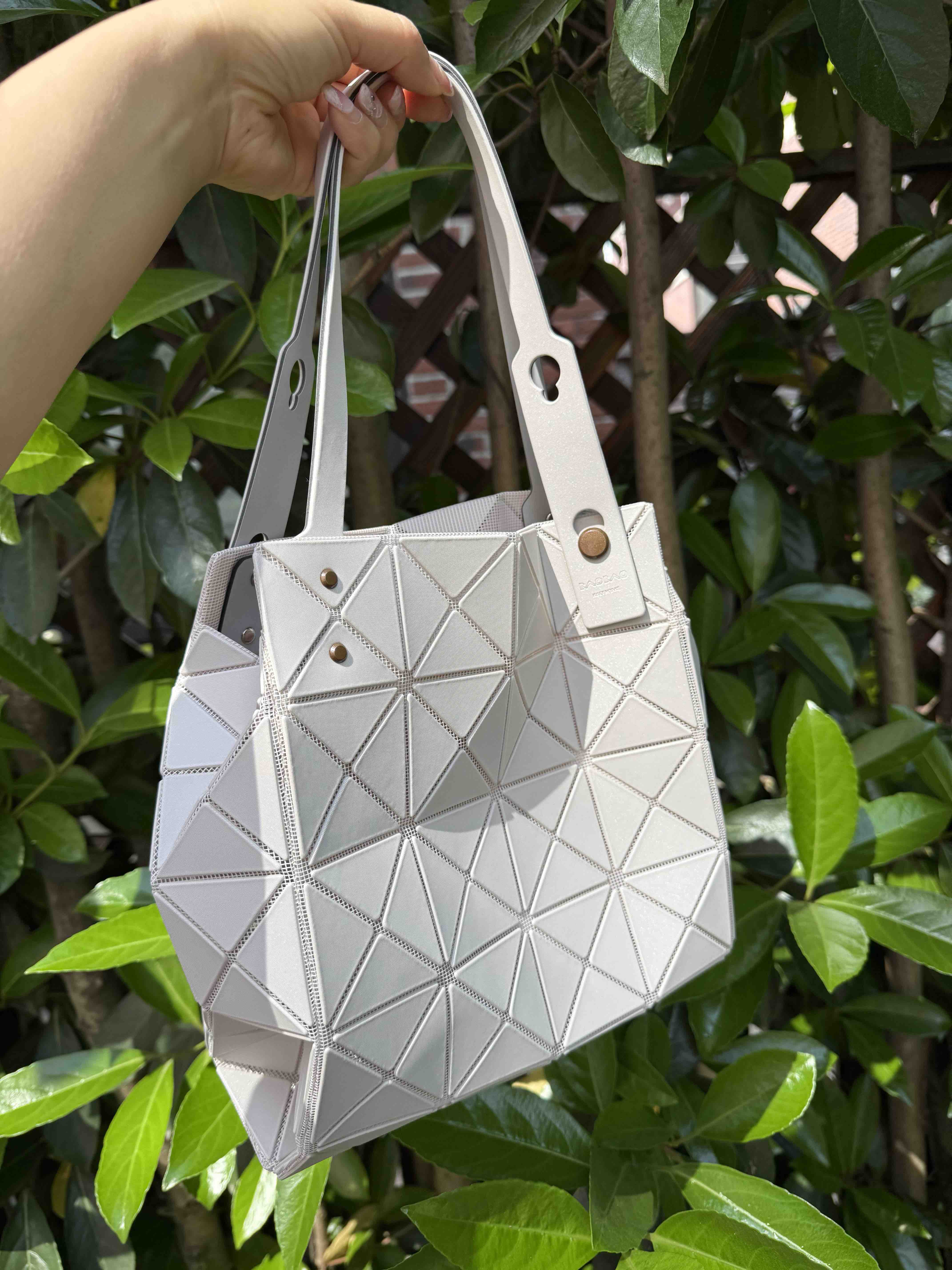 拥有宝雕石刻般的外形,三角的片组合构成了经典手的提包状形。哑光材质耐脏不说,还有细闪钻光。
