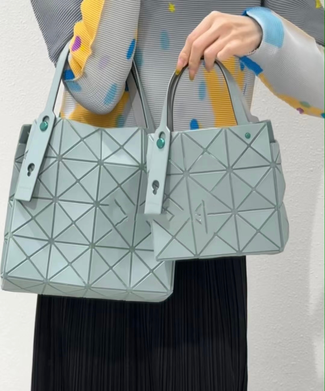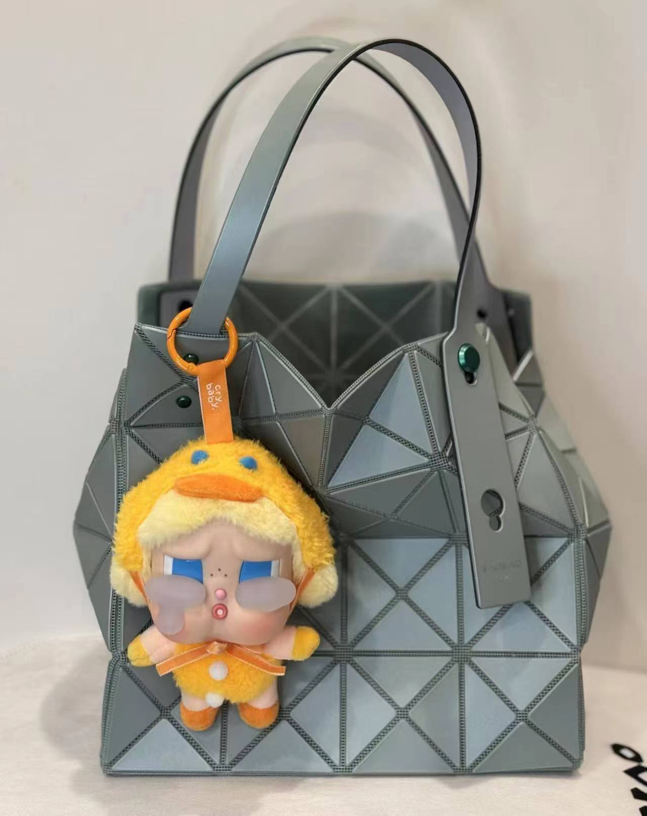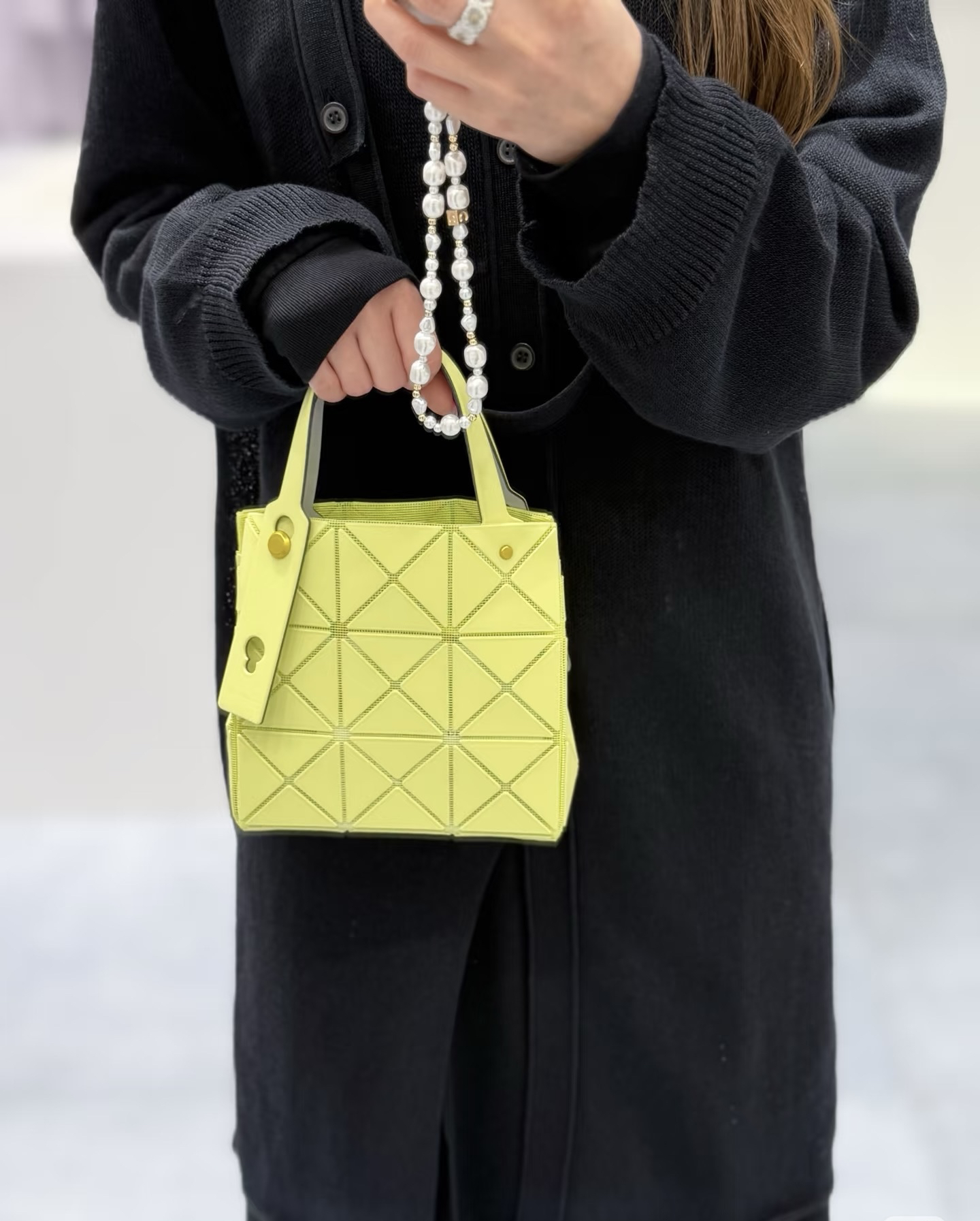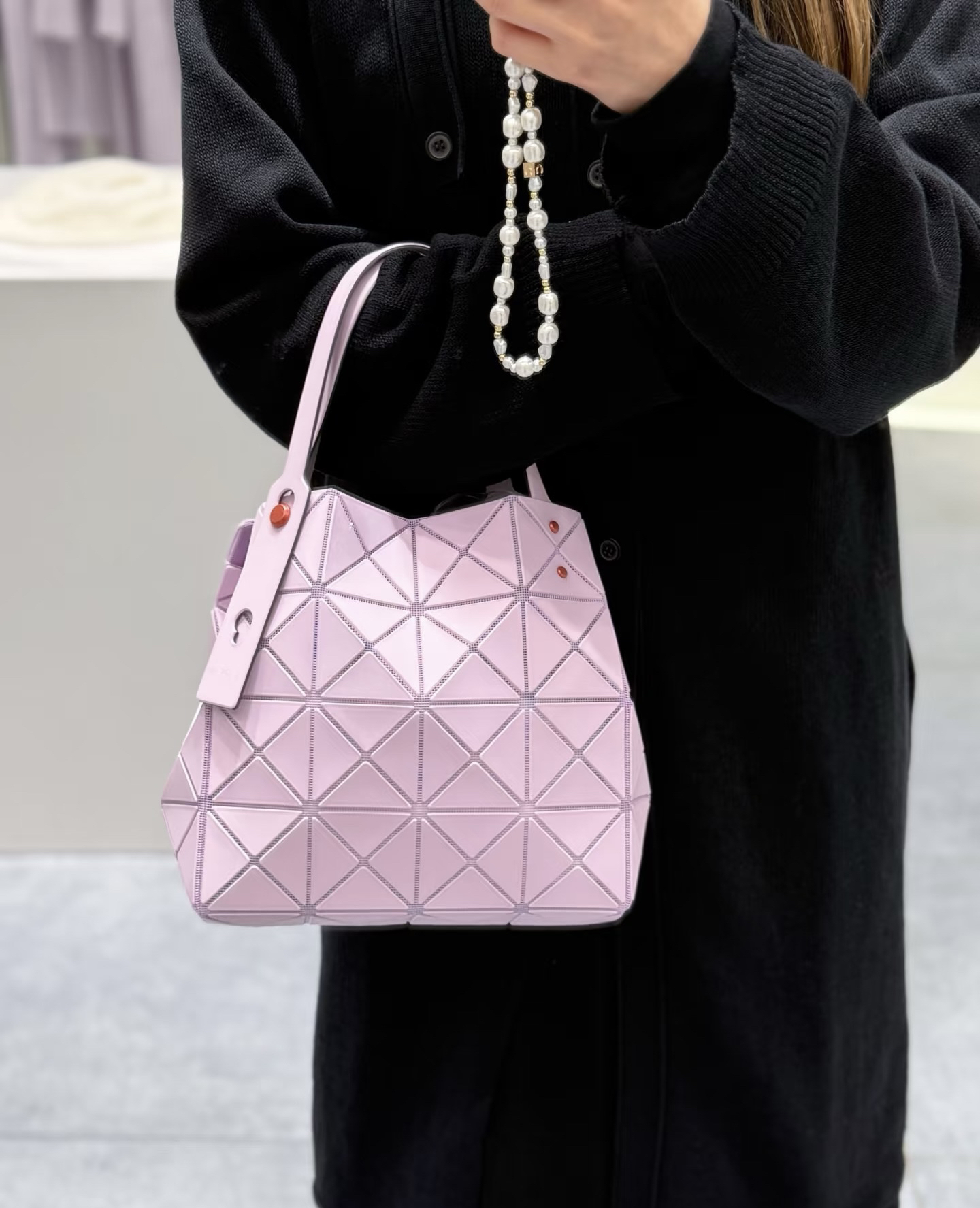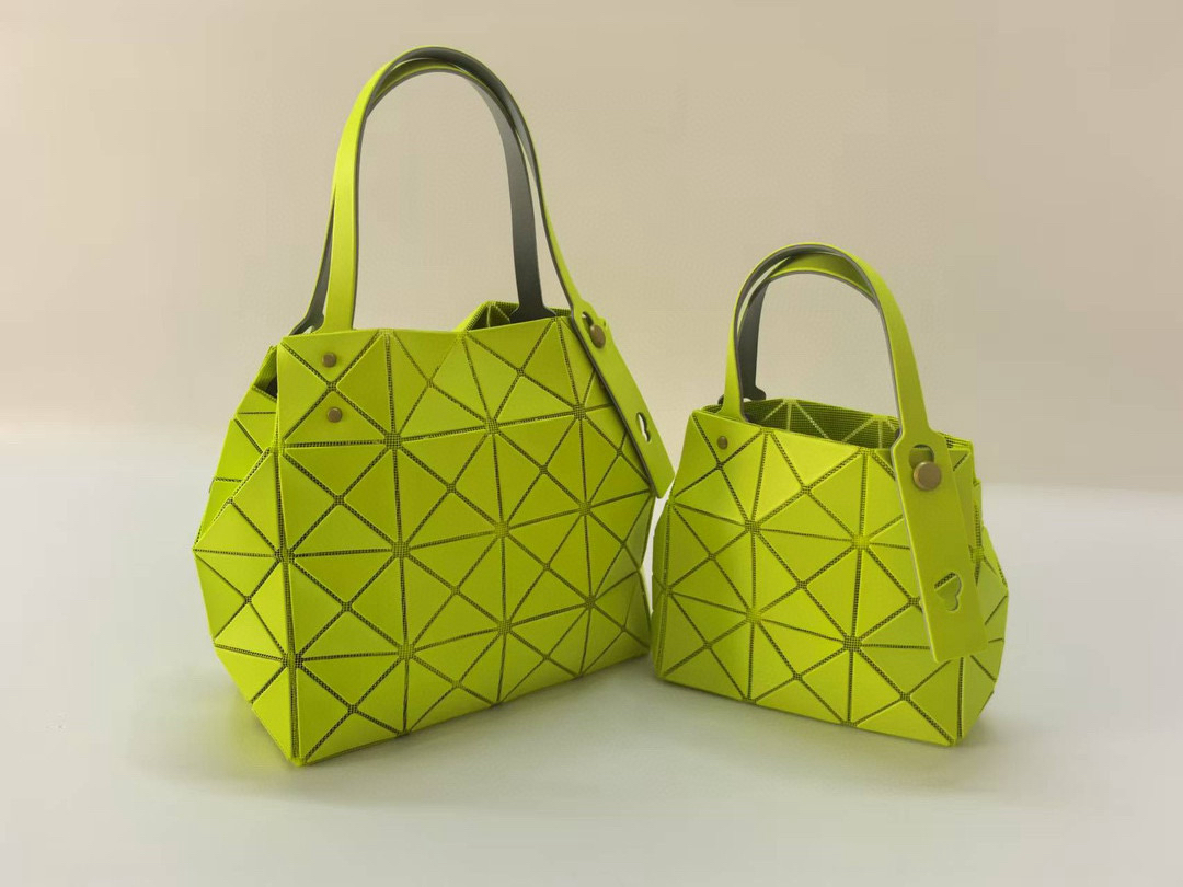 拥有宝雕石刻般的外形,三角的片组合构成了经典手的提包状形。哑光材质耐脏不说,还有细闪钻光。
