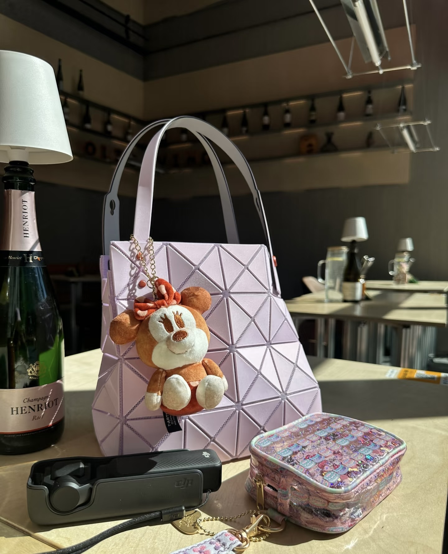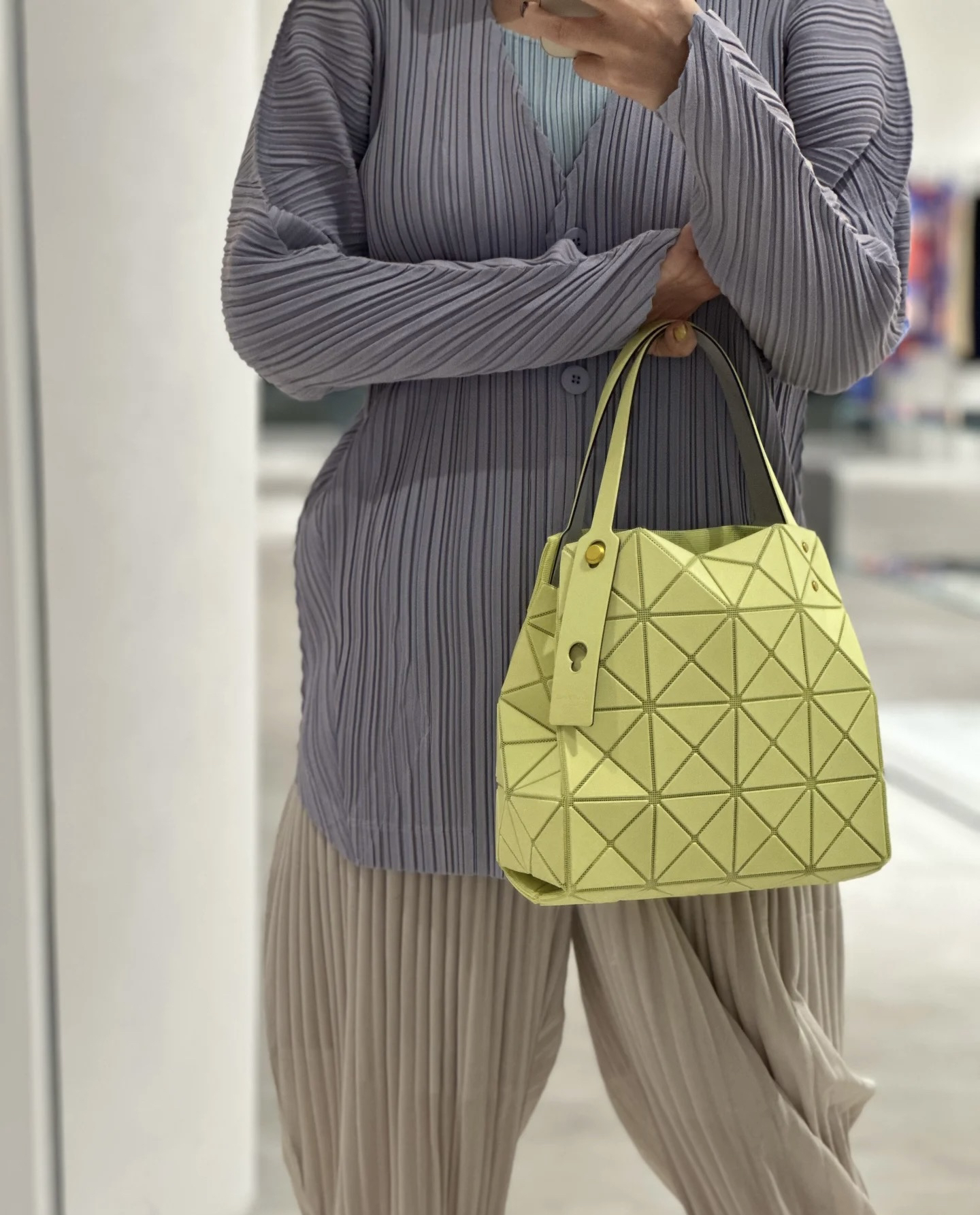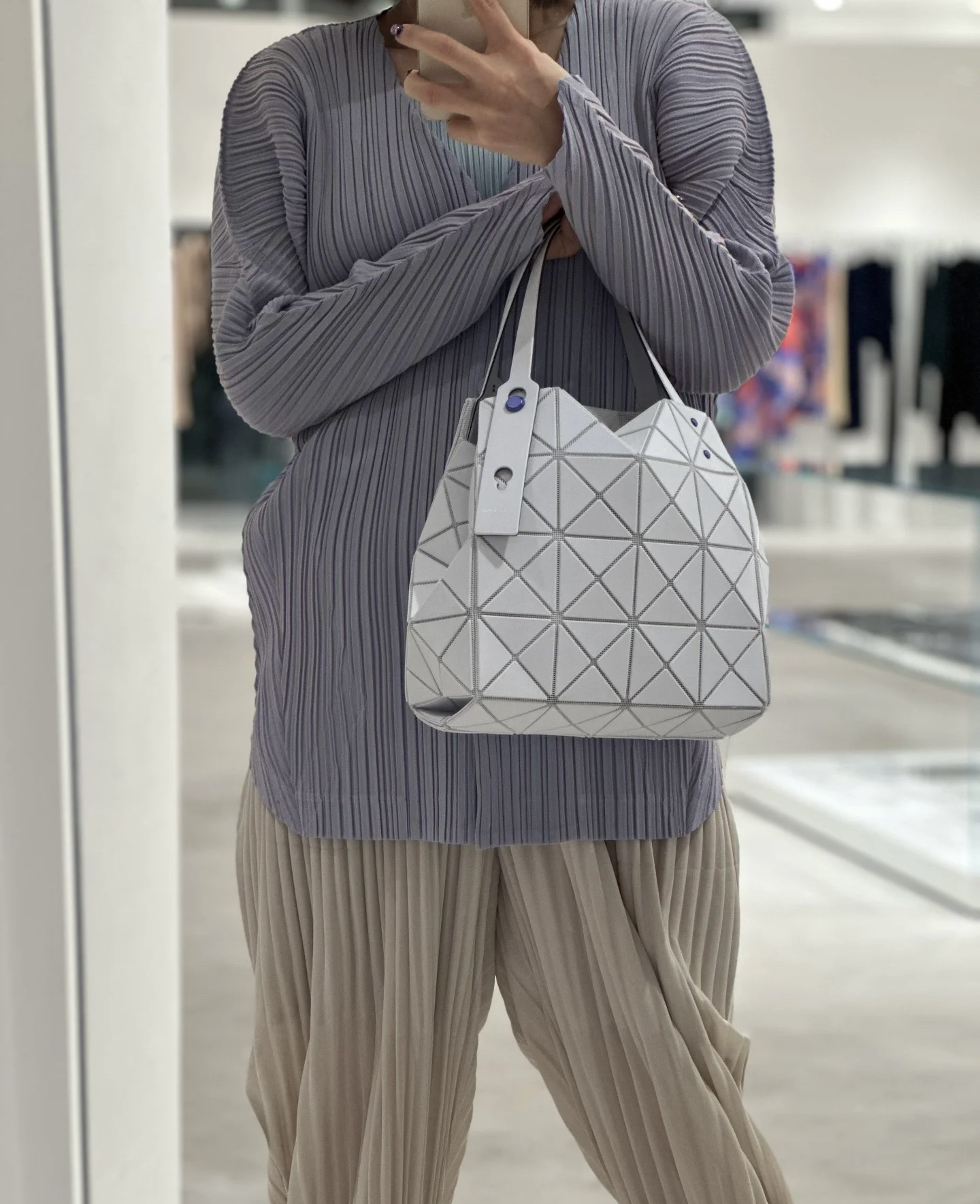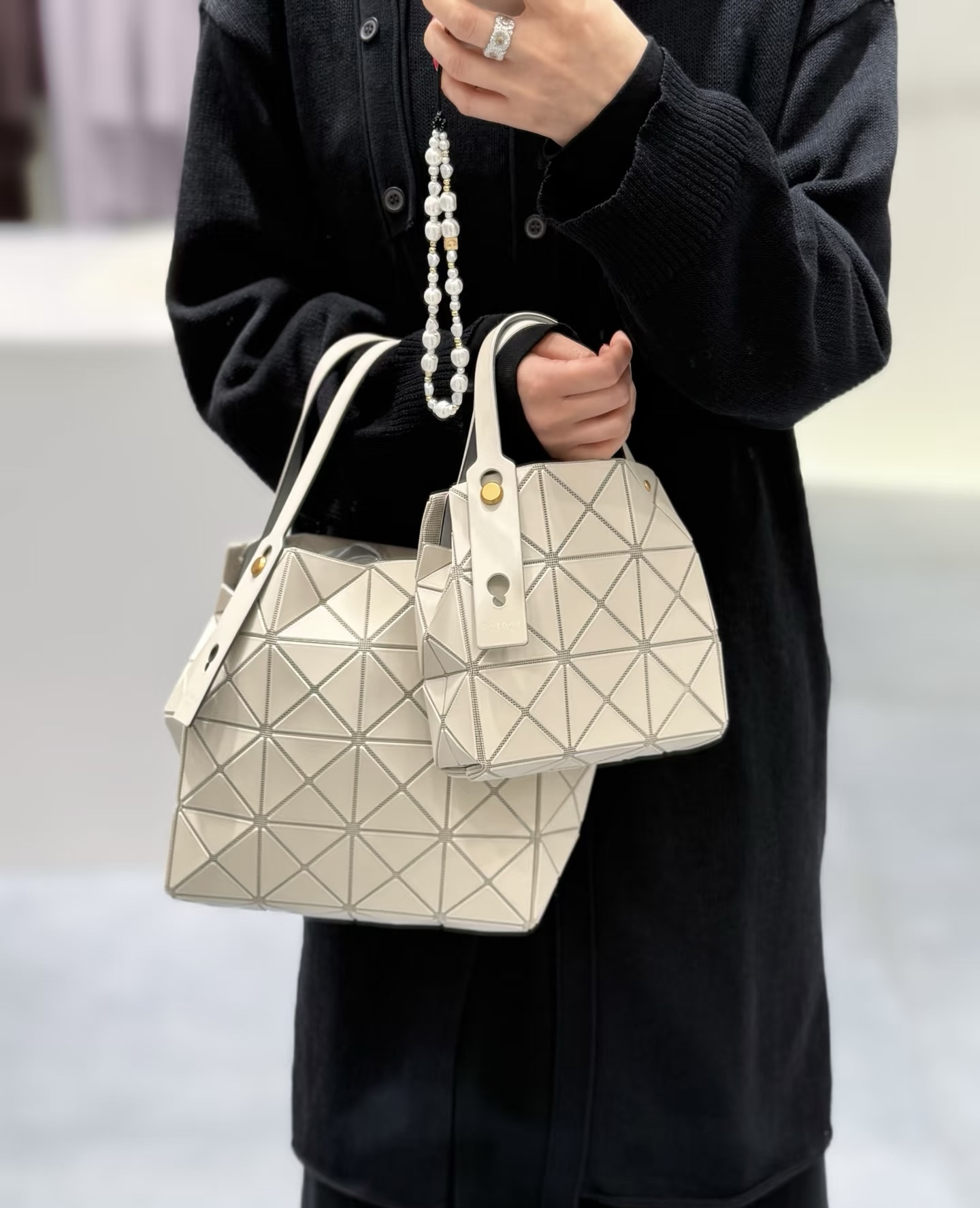 拥有宝雕石刻般的外形,三角的片组合构成了经典手的提包状形。哑光材质耐脏不说,还有细闪钻光。