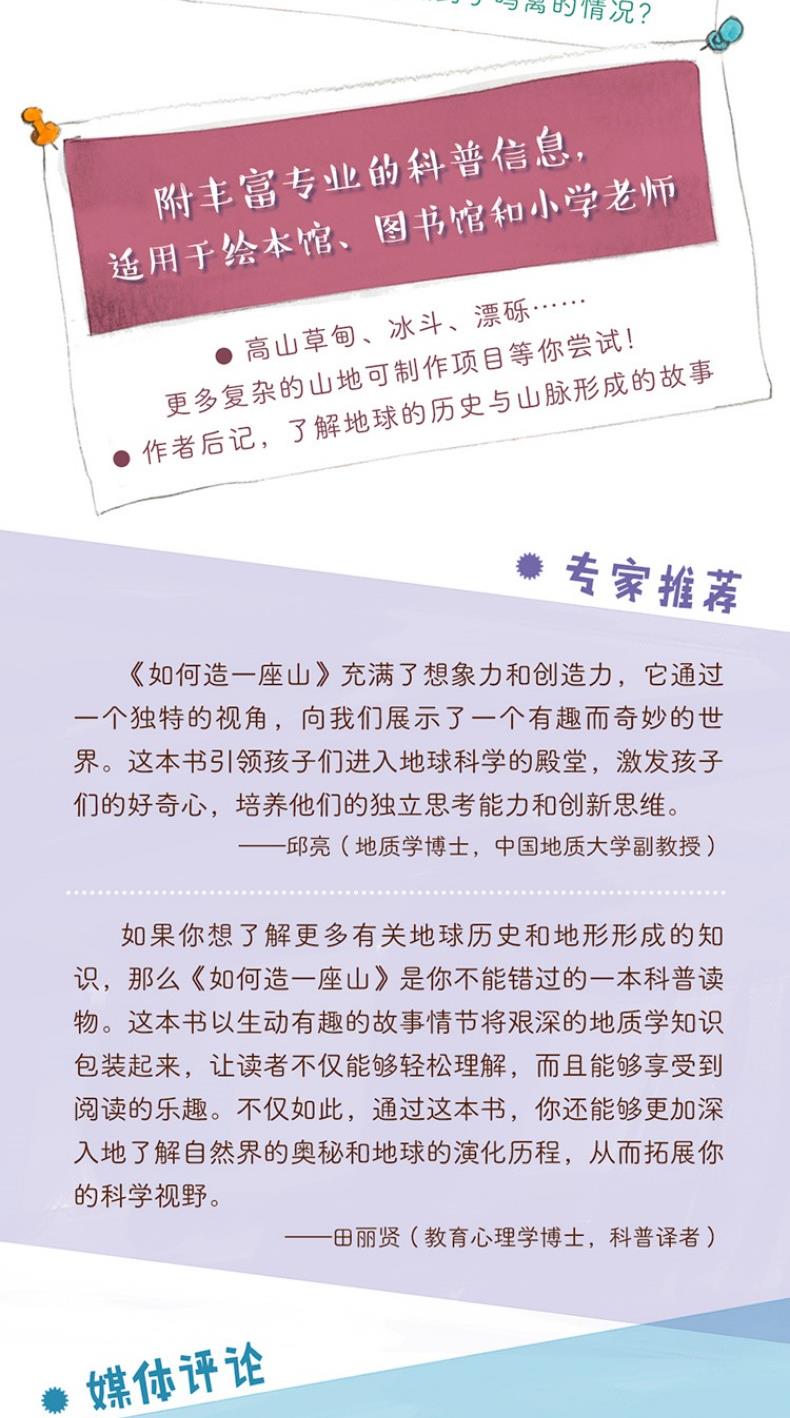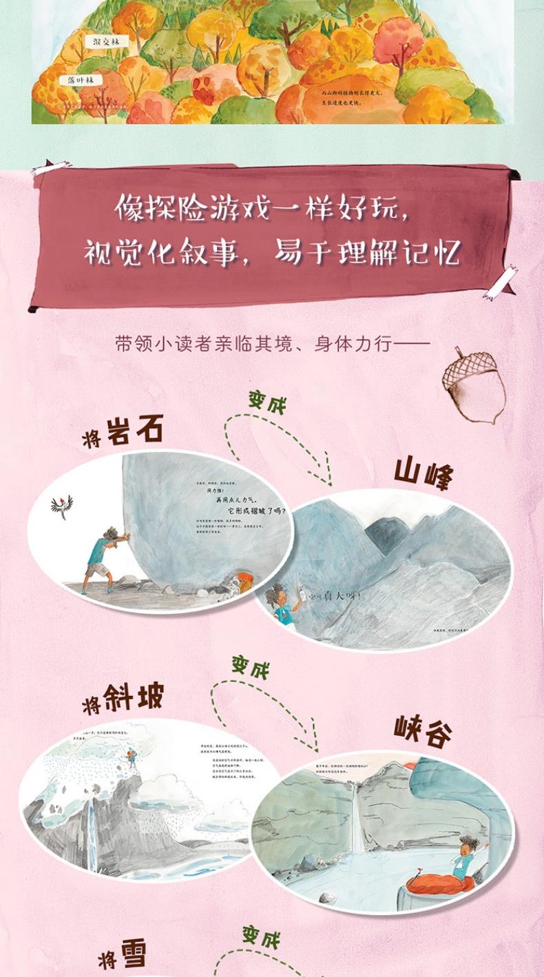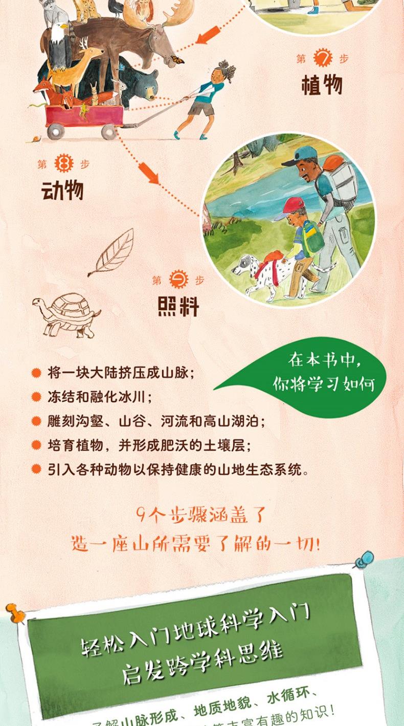 这本科普书形式新奇,互动性强,像探险游戏一样好玩。带领小读者亲临其境、身体力行,将岩石变成山峰、将斜坡变成峡谷、将雪变成冰川!以高度视觉化叙事,探索山脉形成、地质地貌、水循环、气候变化、生态系统等丰富有趣的知识,激发孩子对地球科学的兴趣。