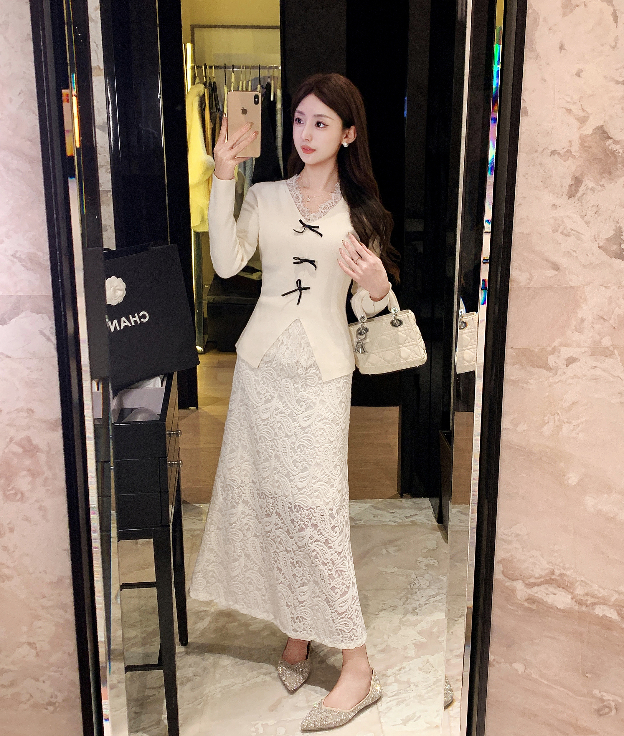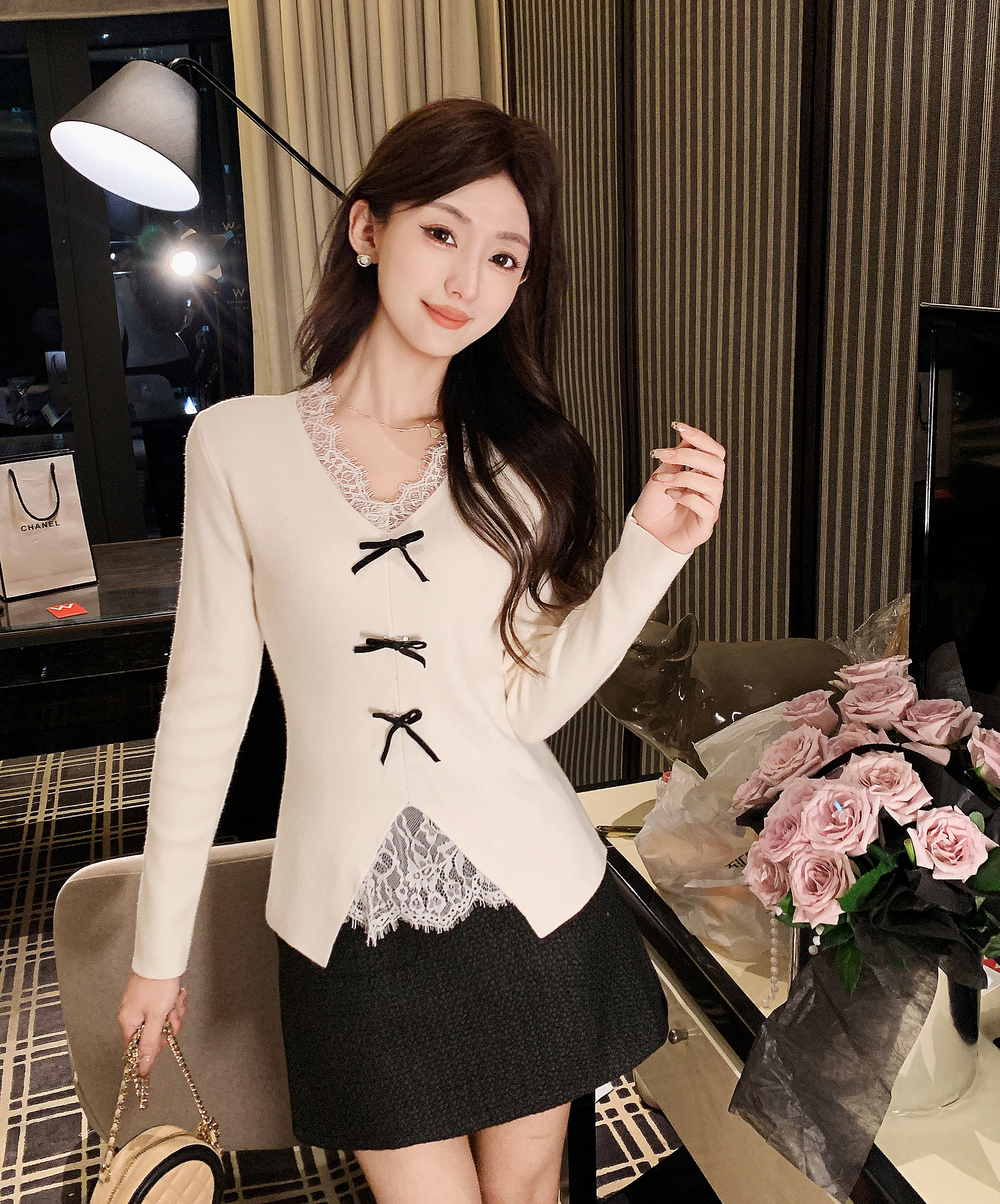 】V领蕾丝拼接百搭温柔针织衫上衣 U2510001