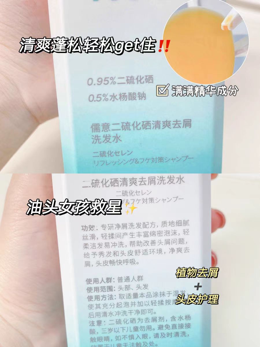 如果日常使用,更建议你们使用这款专为“头屑星人”研发的含0.95%二硫化硒的「儒意二硫化硒清爽去屑洗发水」。