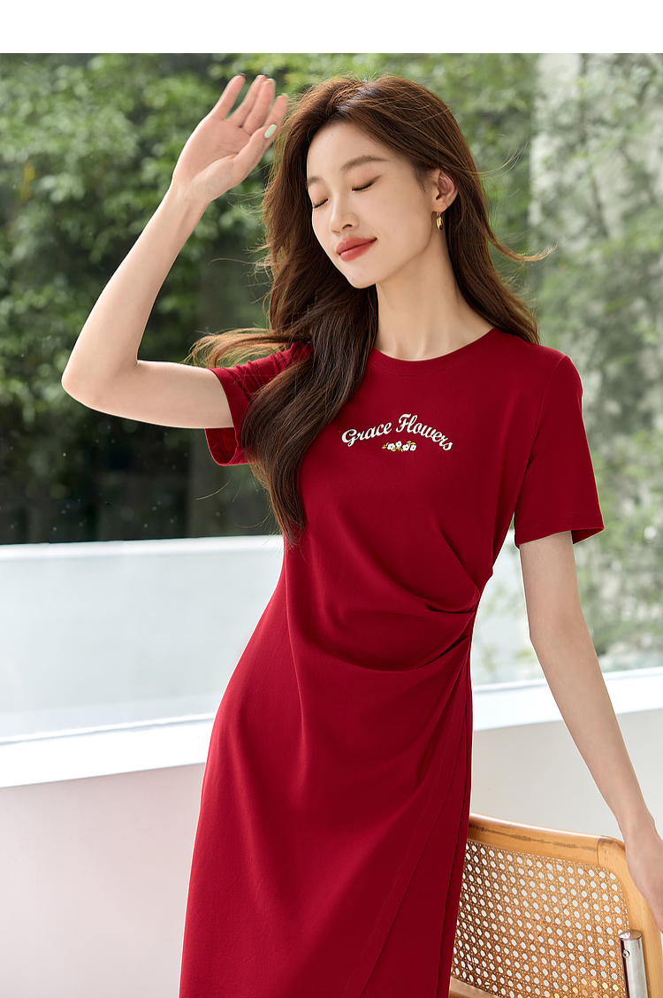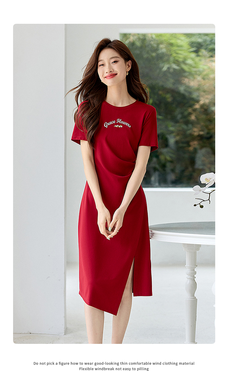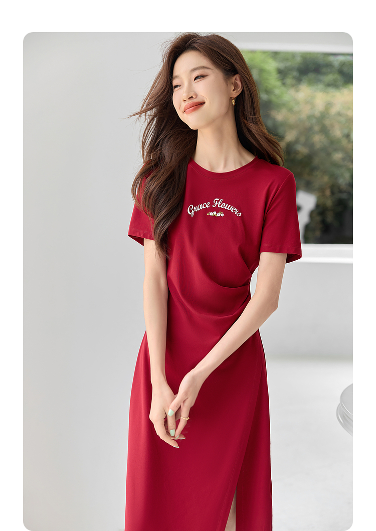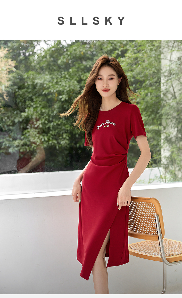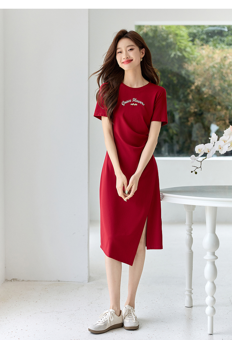 【专属特价】熙世界休闲红色连衣裙夏天新款美式印花短袖修身显瘦开叉T恤裙