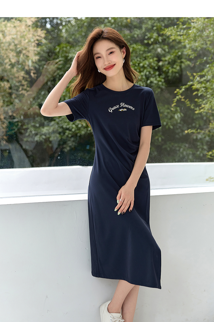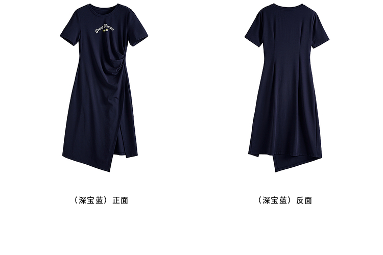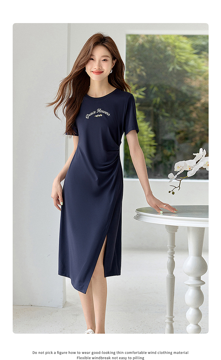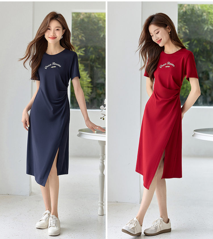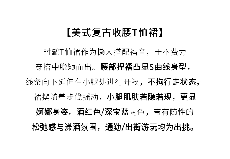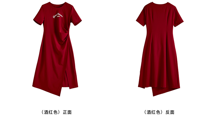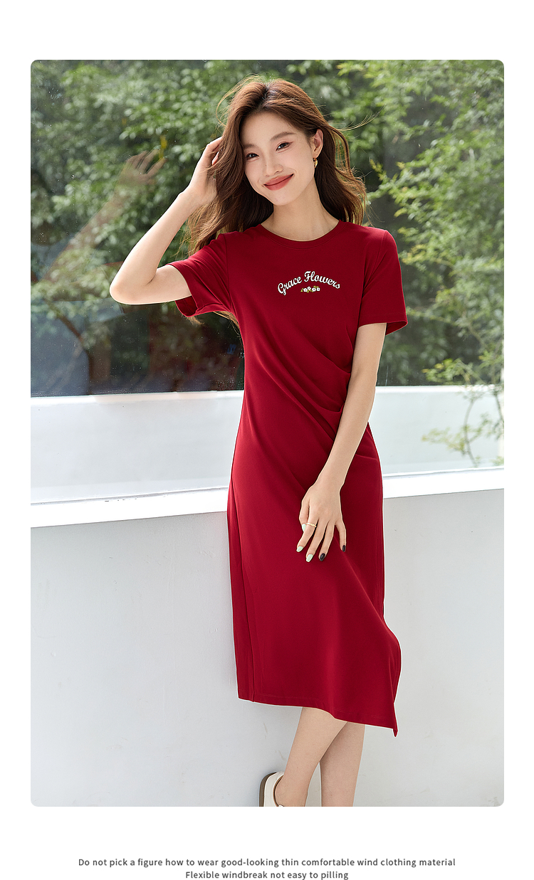 【专属特价】熙世界休闲红色连衣裙夏天新款美式印花短袖修身显瘦开叉T恤裙