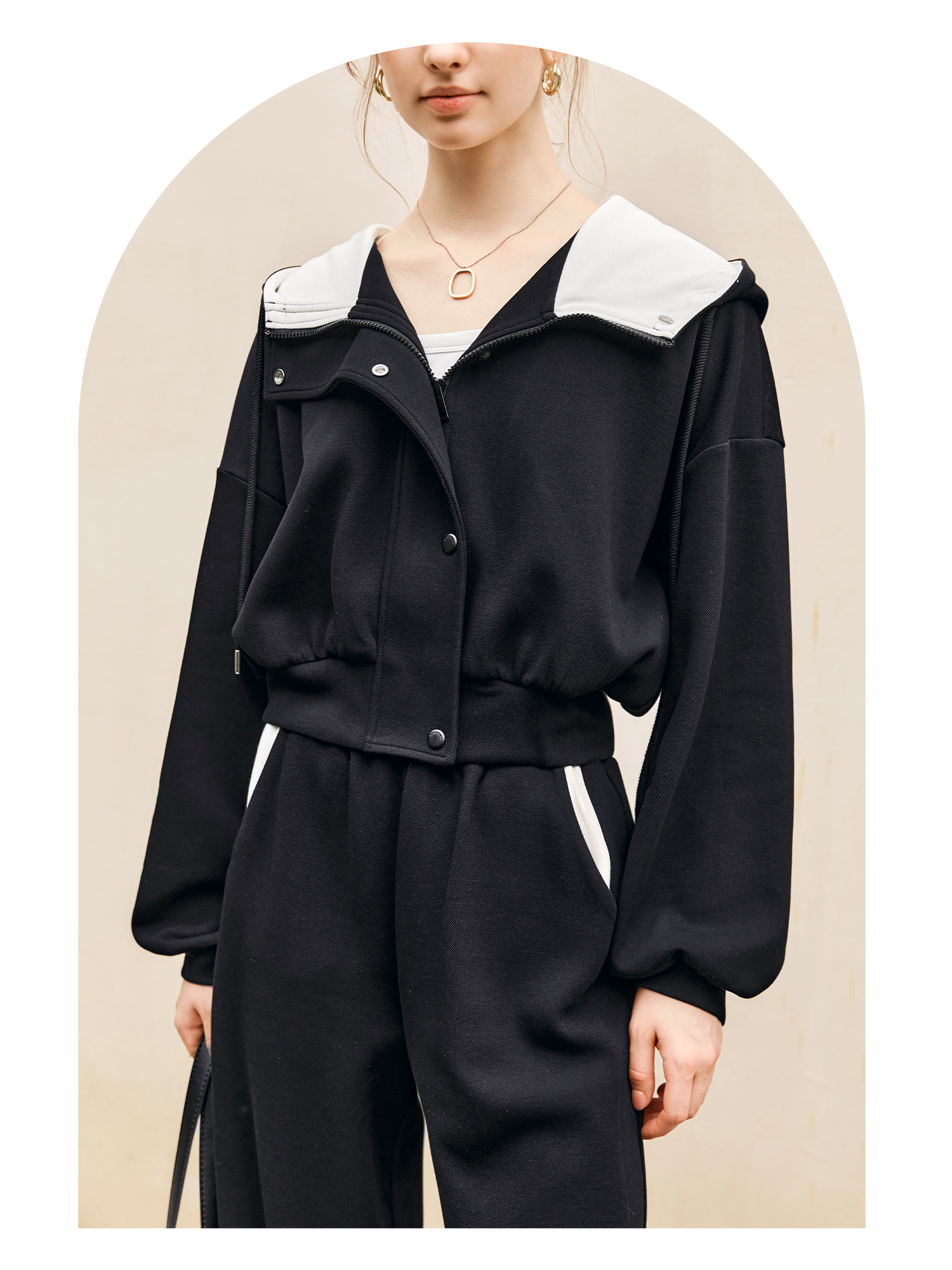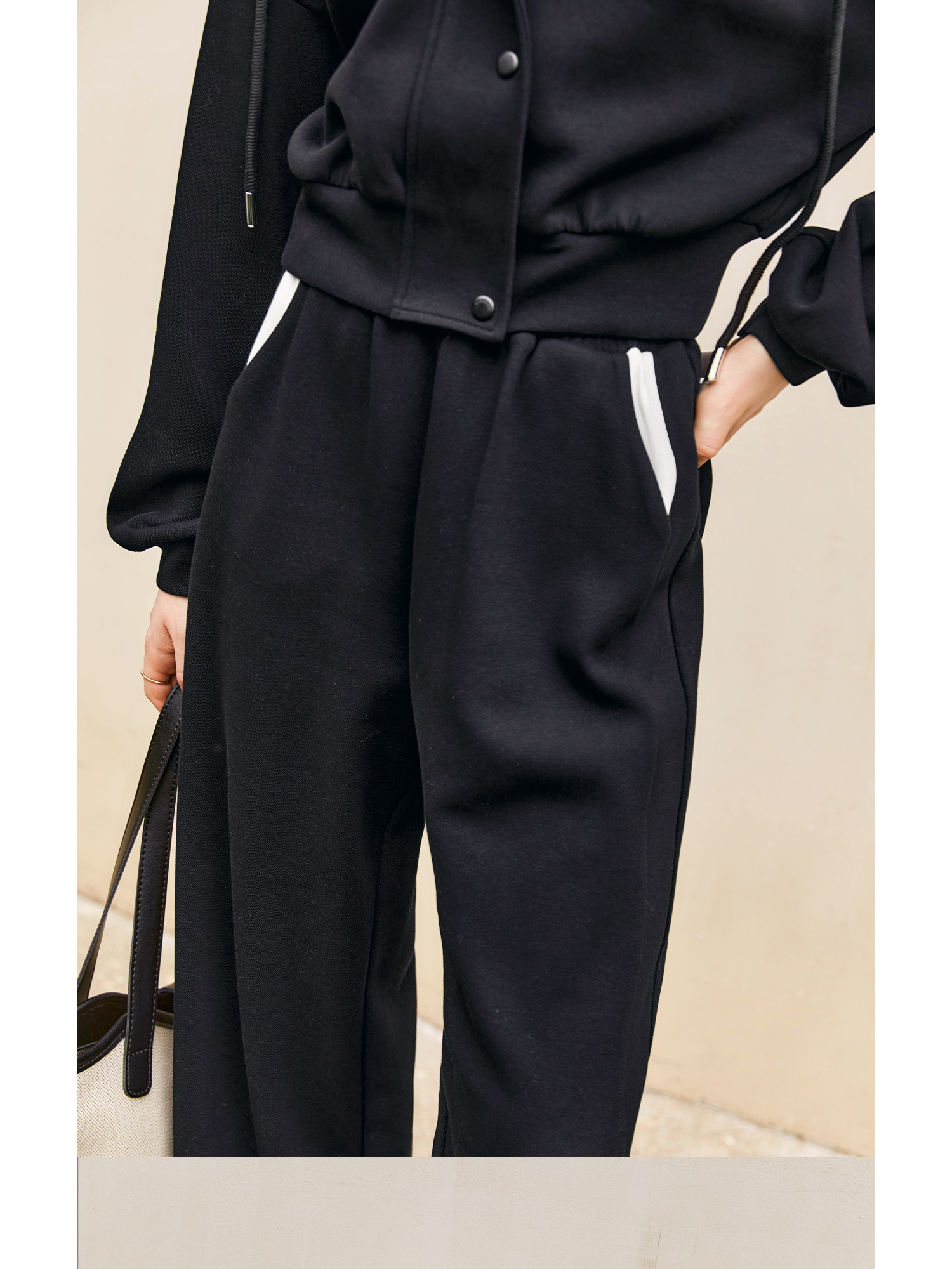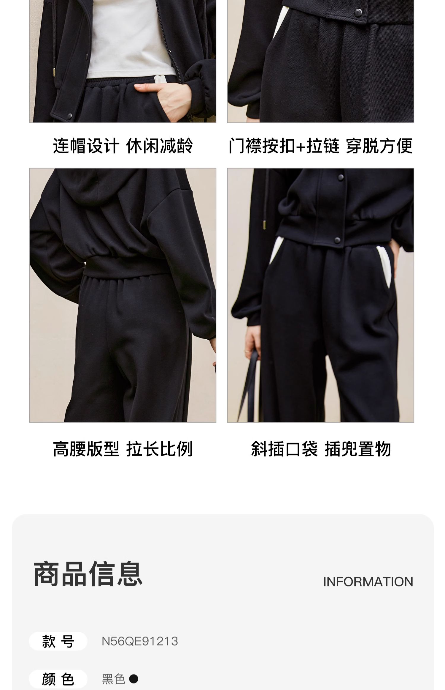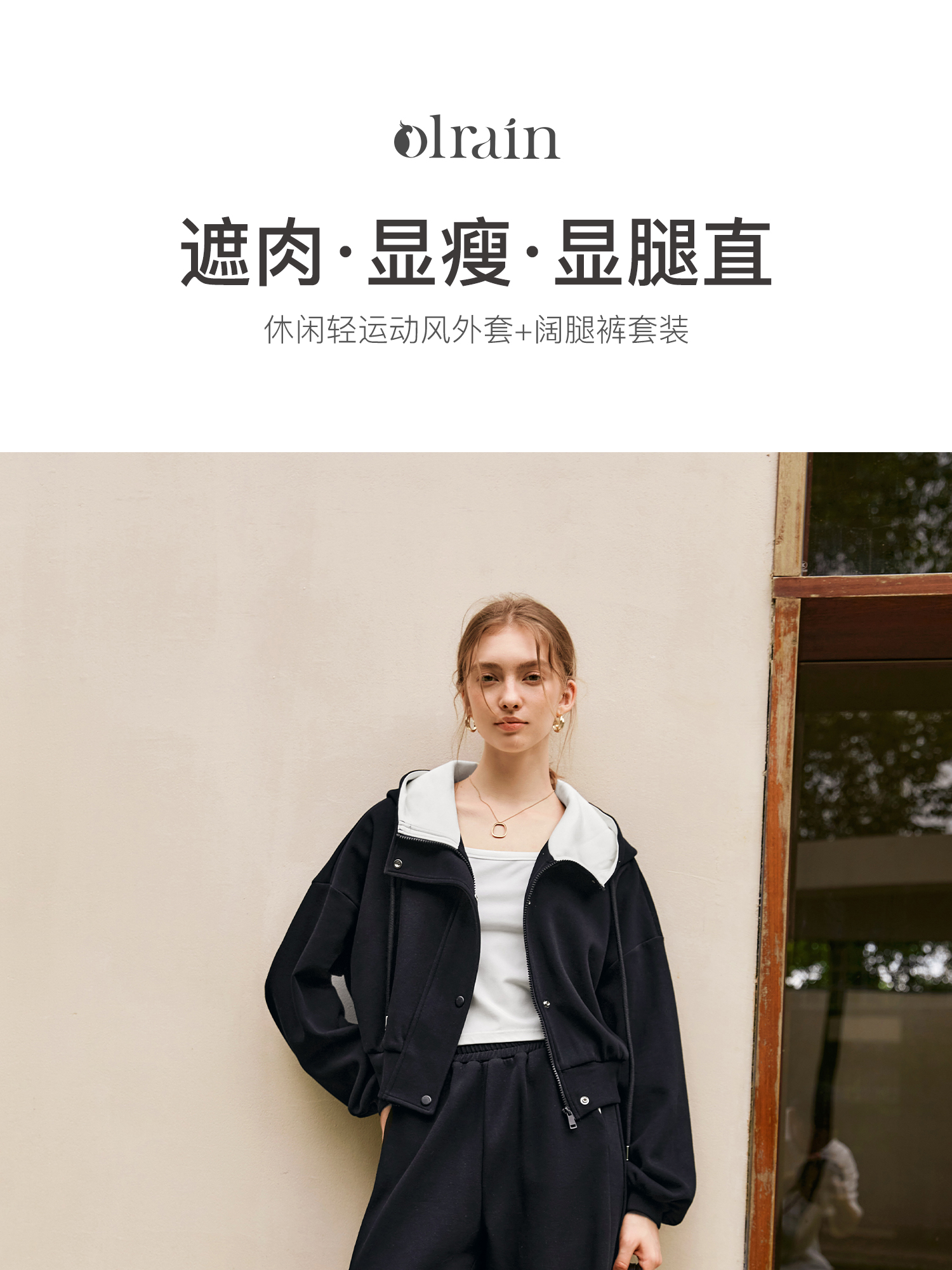OLrain欧芮儿时尚轻运动黑色套装两件套女秋季2024年新款连帽休闲