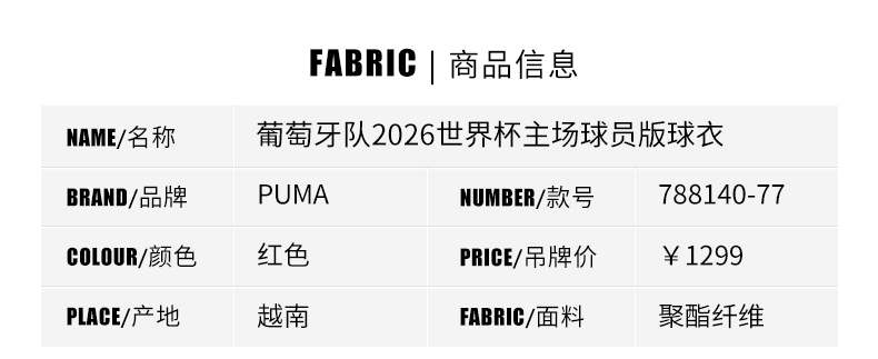 SFS彪马2026世界杯葡萄牙主场球员版C罗印号球衣足球服 788140-77