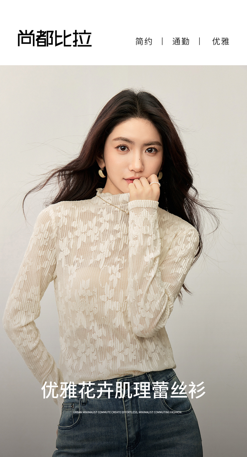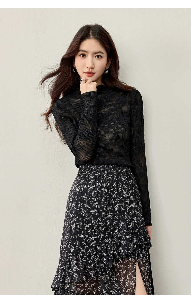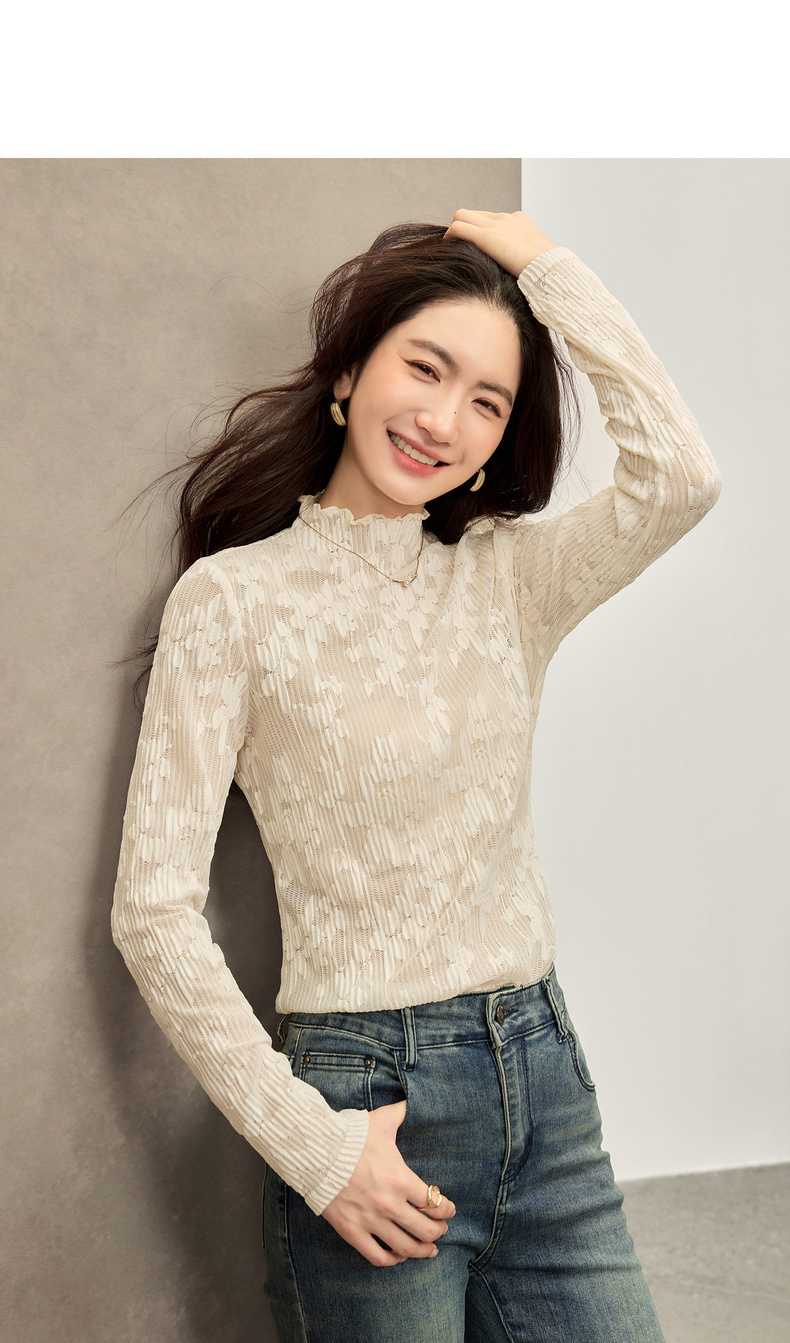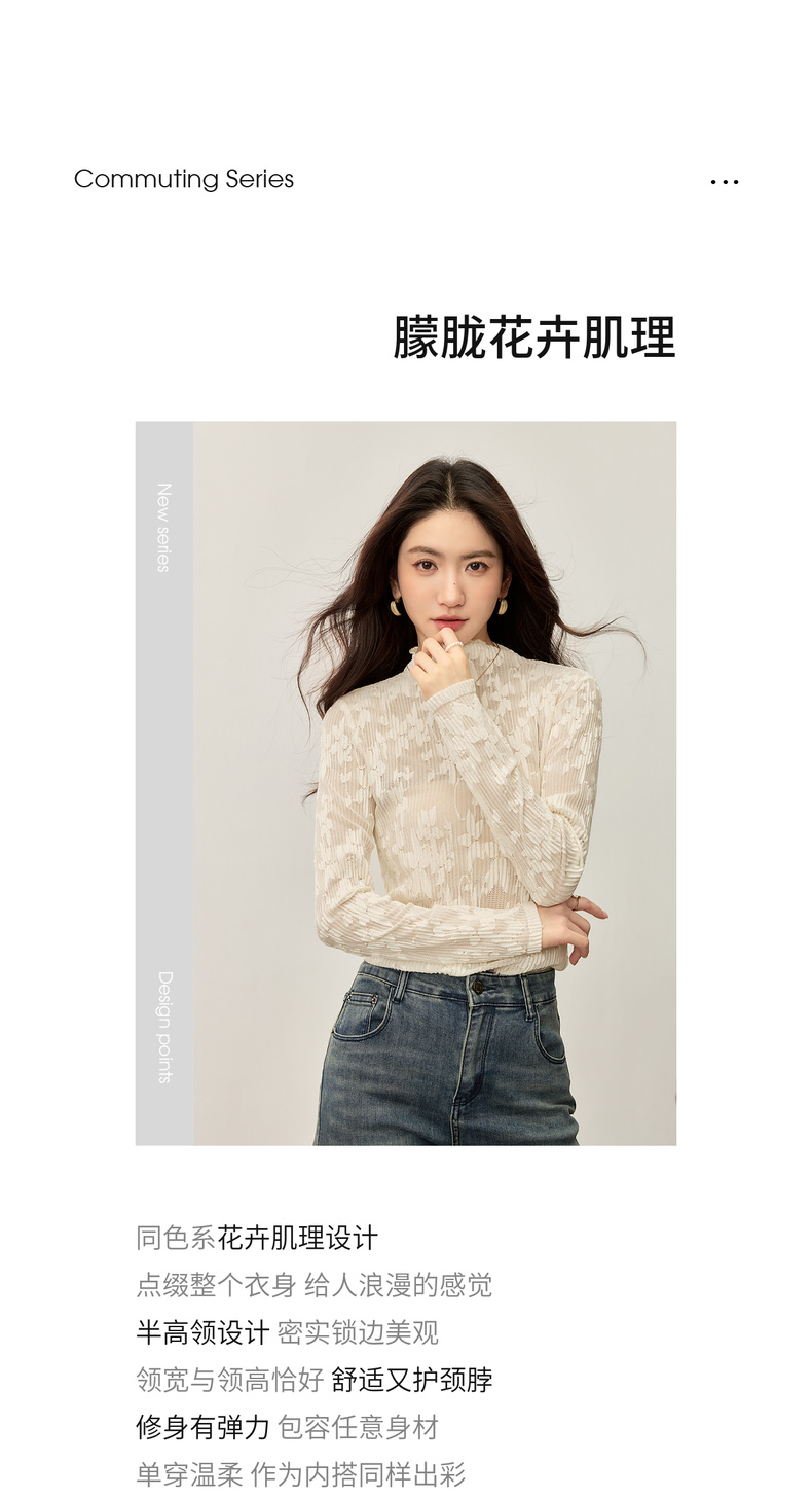 【内购】【花卉肌理】优雅通勤半高领修身弹力长袖可打底蕾丝衫-153SA2834
