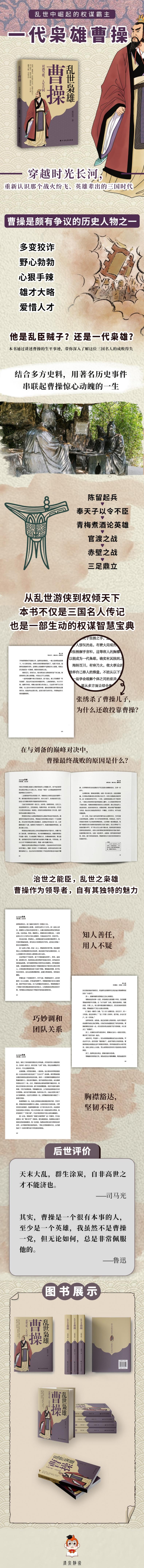 曹操作为一代枭雄,文治武功齐备,无论是政治、军事才能,还是文学、书法造诣,在历史上都不可低估,即便在当下仍具有广泛影响力。本书以恢弘的历史视角和生动的叙事手法,还原了曹操从少年任侠到统一北方的传奇一生。通过展现他在军事上的雄才大略与政治上的老谋深算,深入剖析其性格的复杂性:既有“挟天子以令诸侯”的权谋,也有“周公吐哺,天下归心”的理想;既有“宁我负人”的争议,也有“唯才是举”的胸襟。透过本书,读者可以探究曹操在乱世中崛起、受挫与重生的深层逻辑,汲取逆境破局的智慧,领悟领导力的核心本质,继而获得在现代竞争中“乐观进取、革新务实”的精神力量。