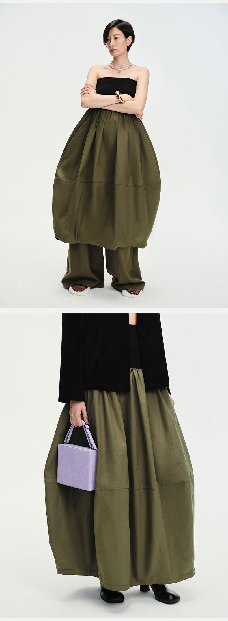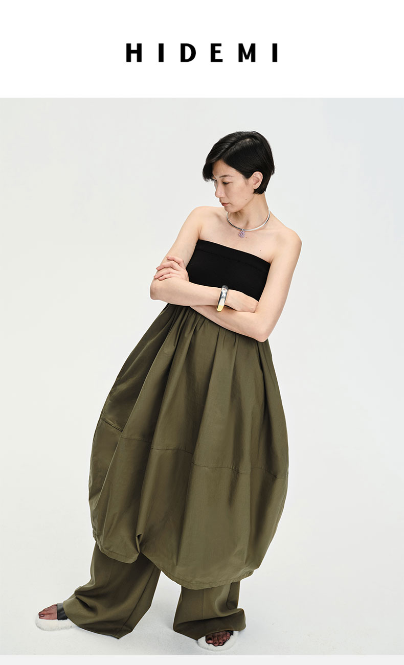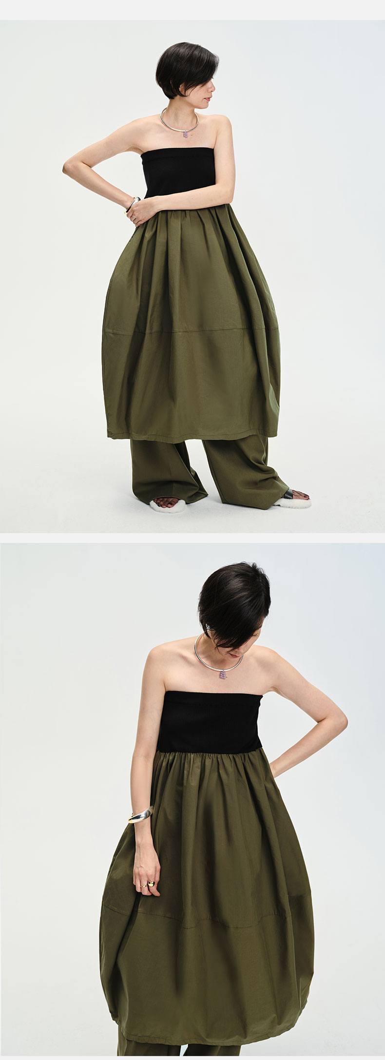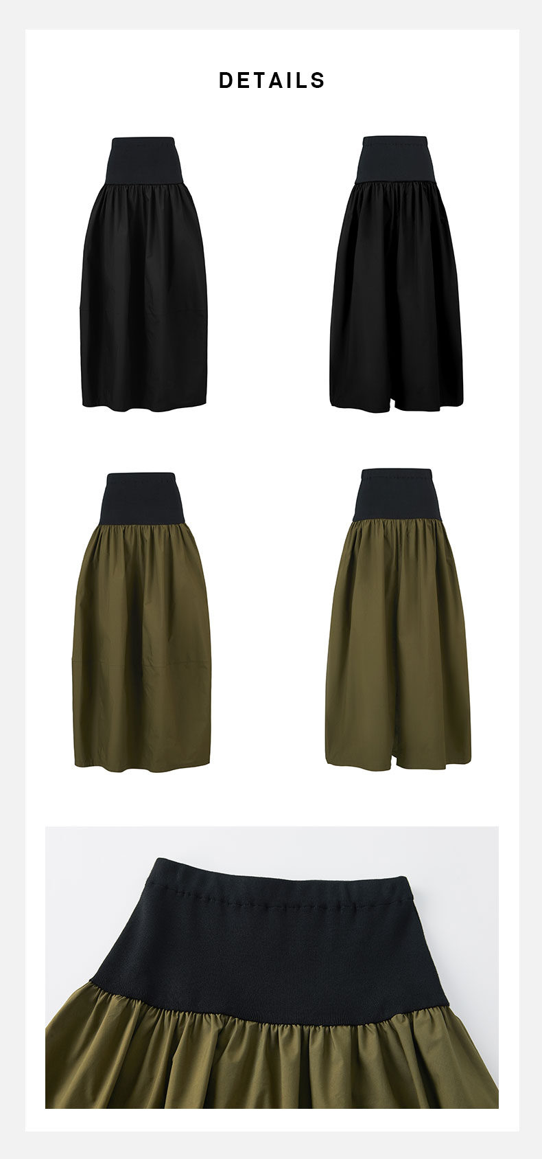 HIDEMI简约设计感弹⼒针织拼接多穿式蓬蓬裙摆茧型裙 ⿊⾊/军绿⾊