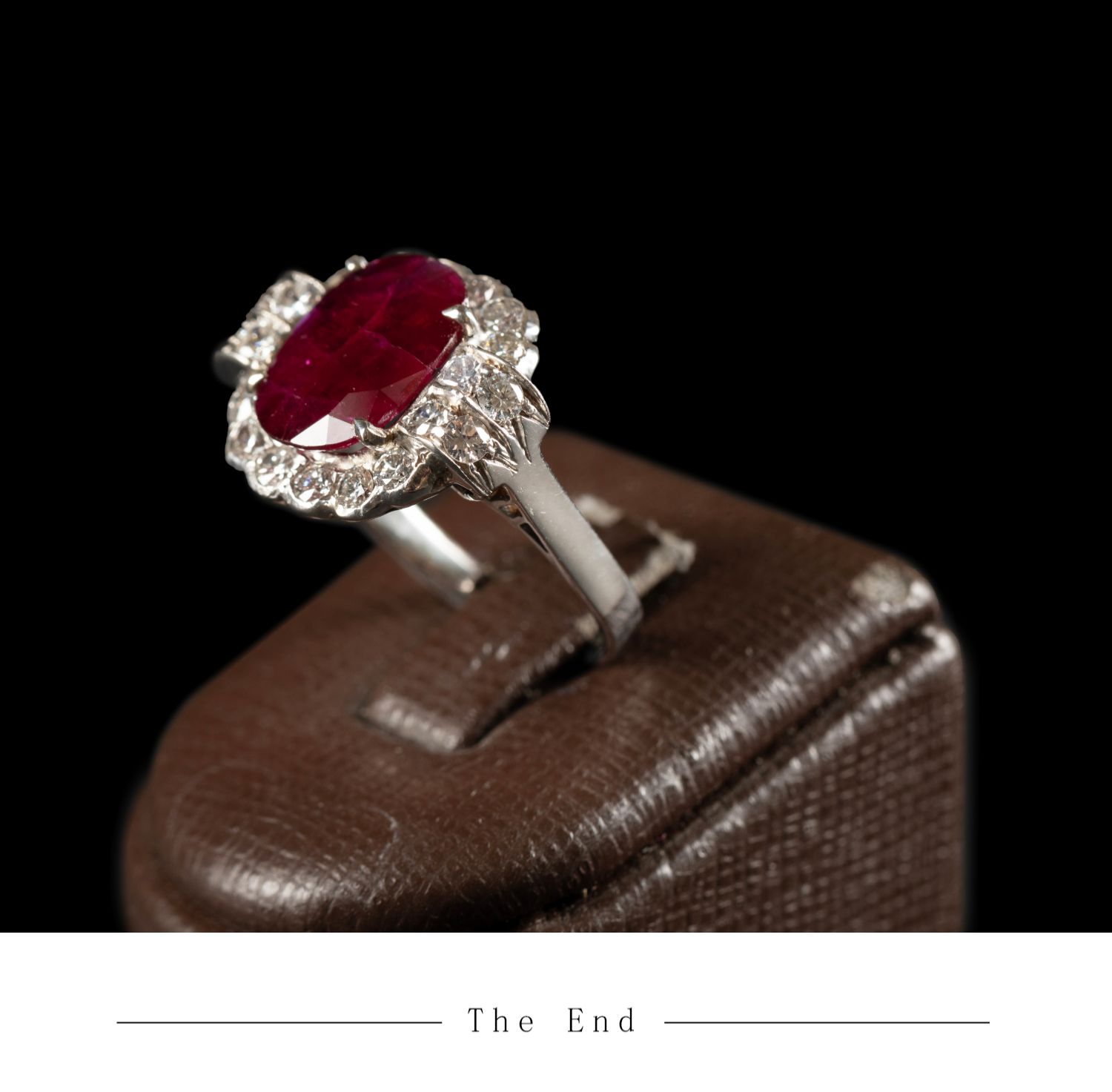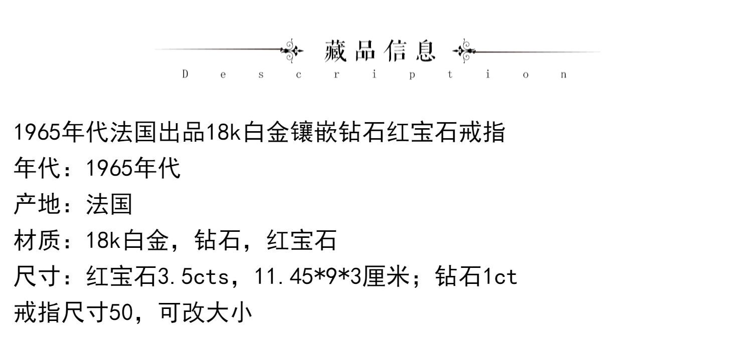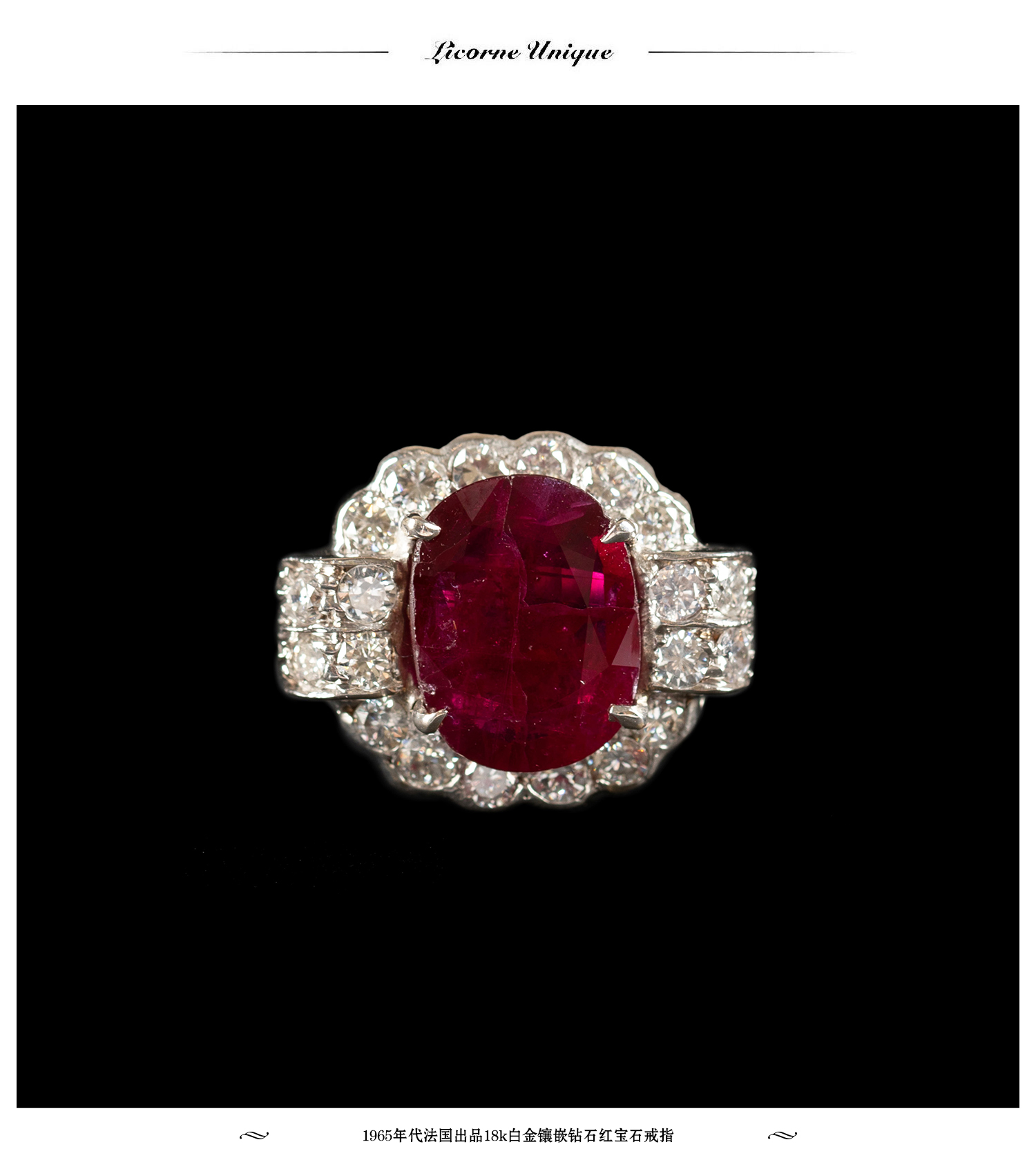 独角鹿西洋古董珠宝首饰1965年代法国18k白金镶嵌钻石红宝石戒指