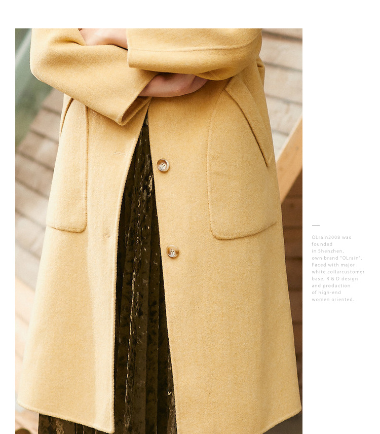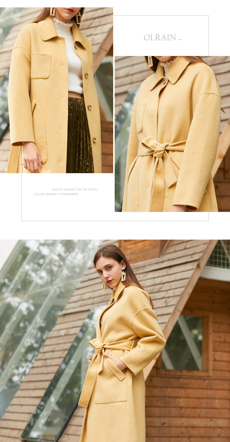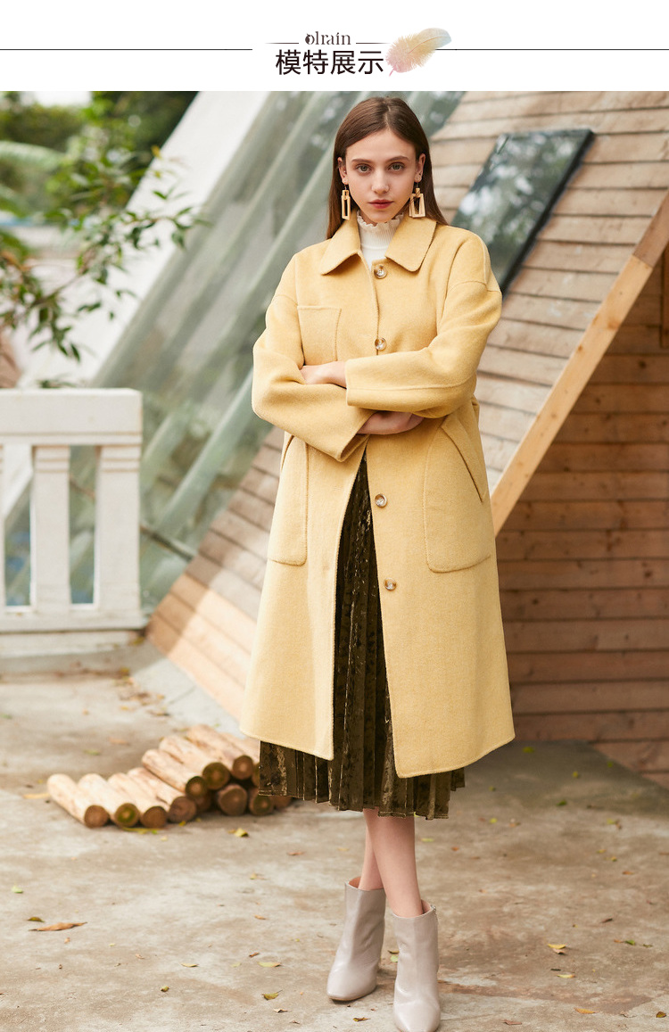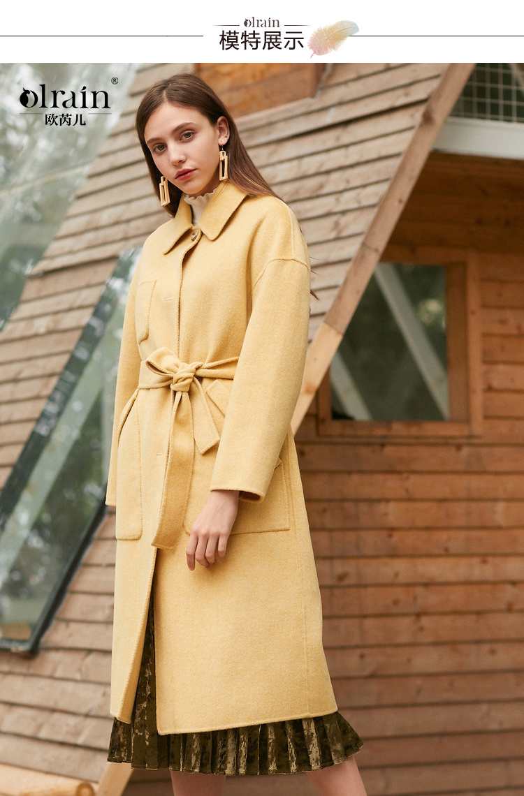欧芮儿气质翻领黄色毛呢外套女2019冬装过膝中长款呢大衣