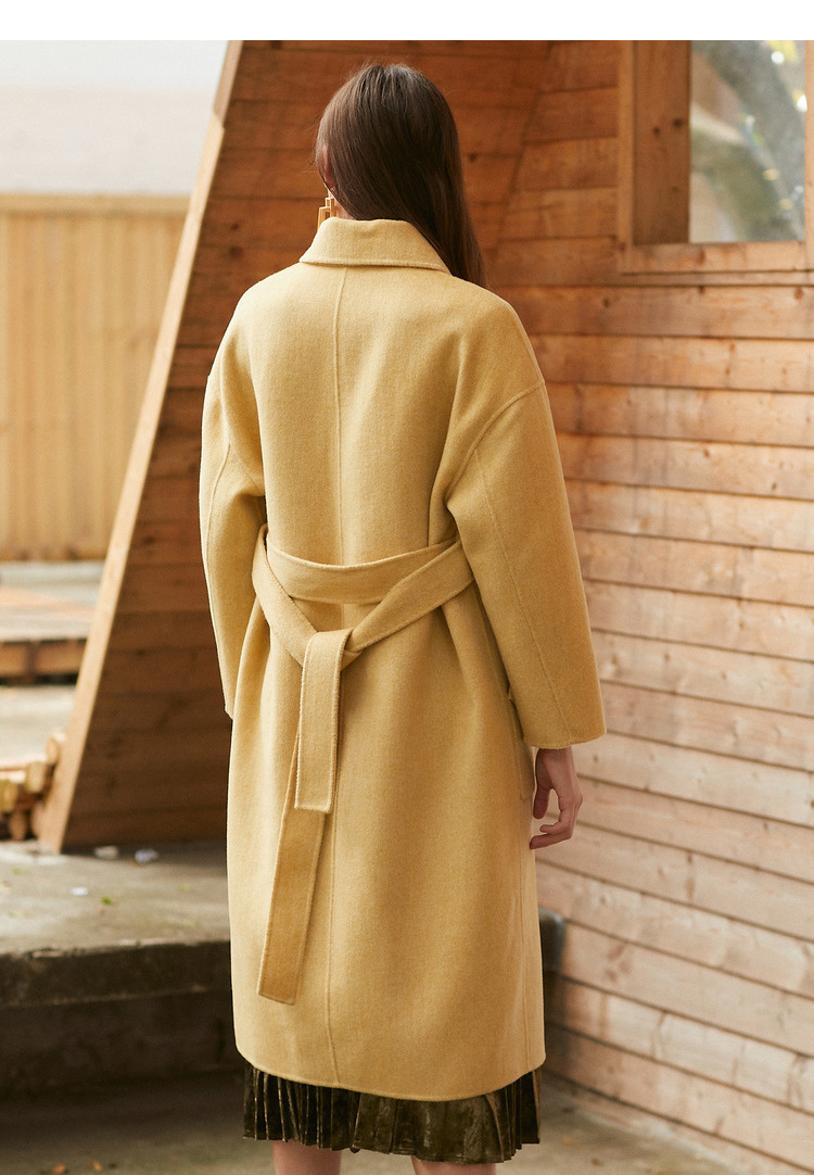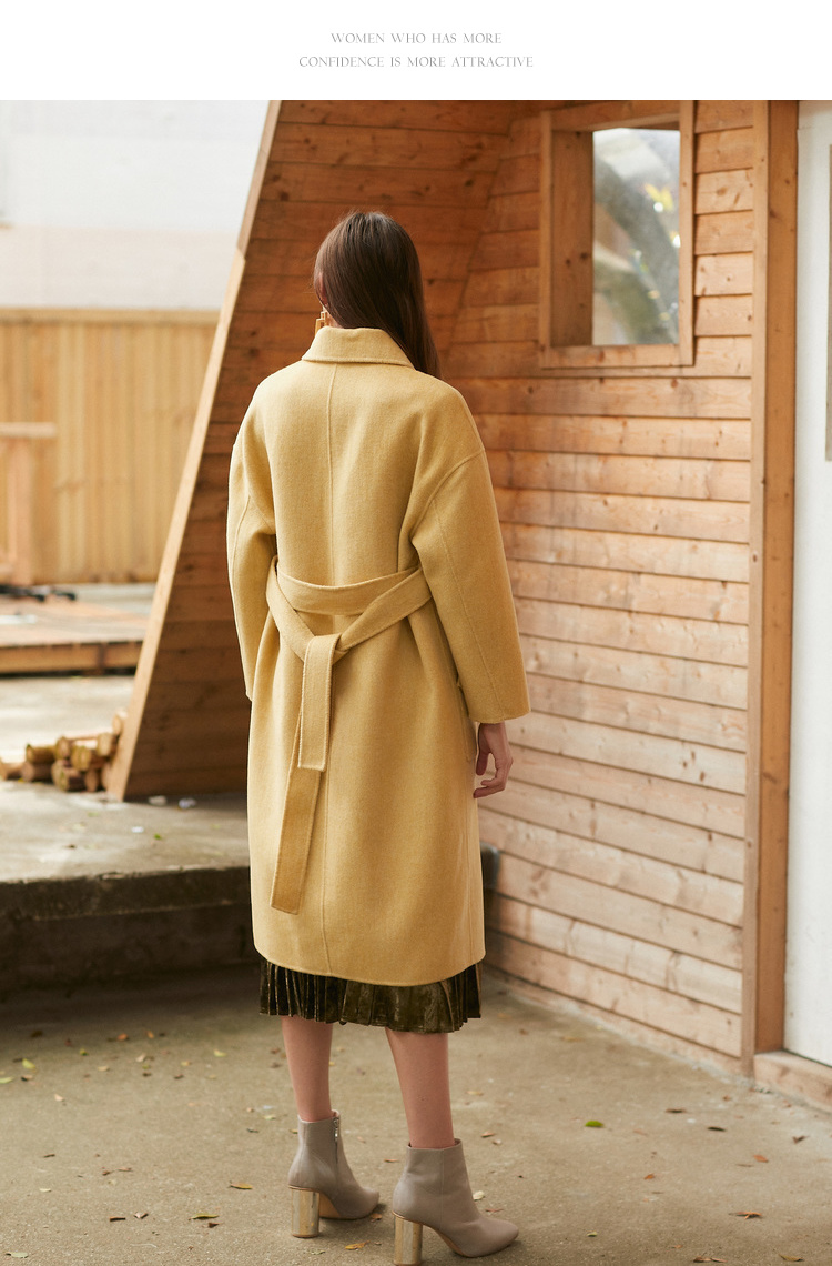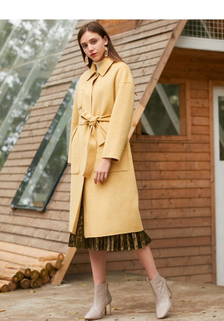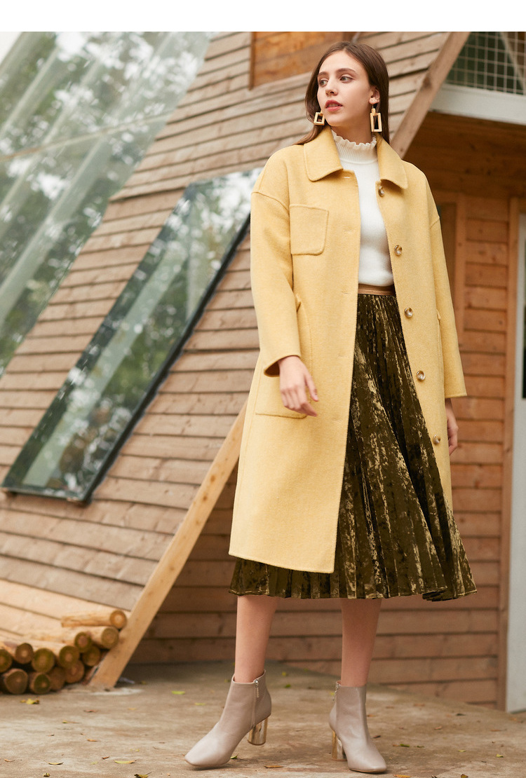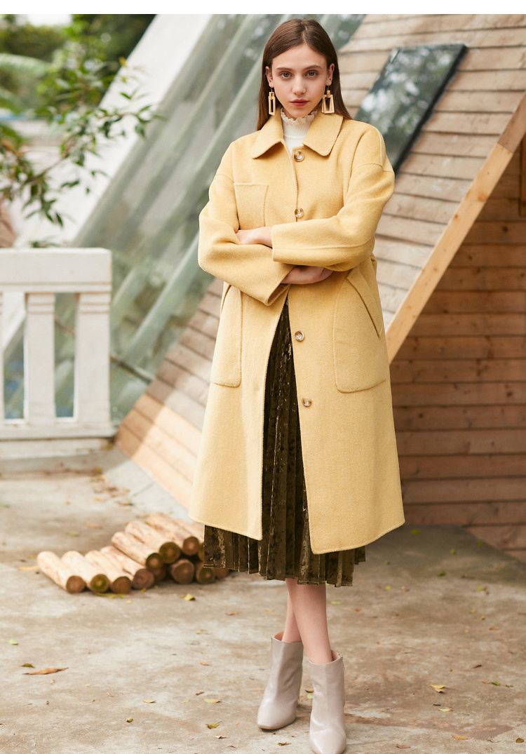 欧芮儿气质翻领黄色毛呢外套女2019冬装过膝中长款呢大衣