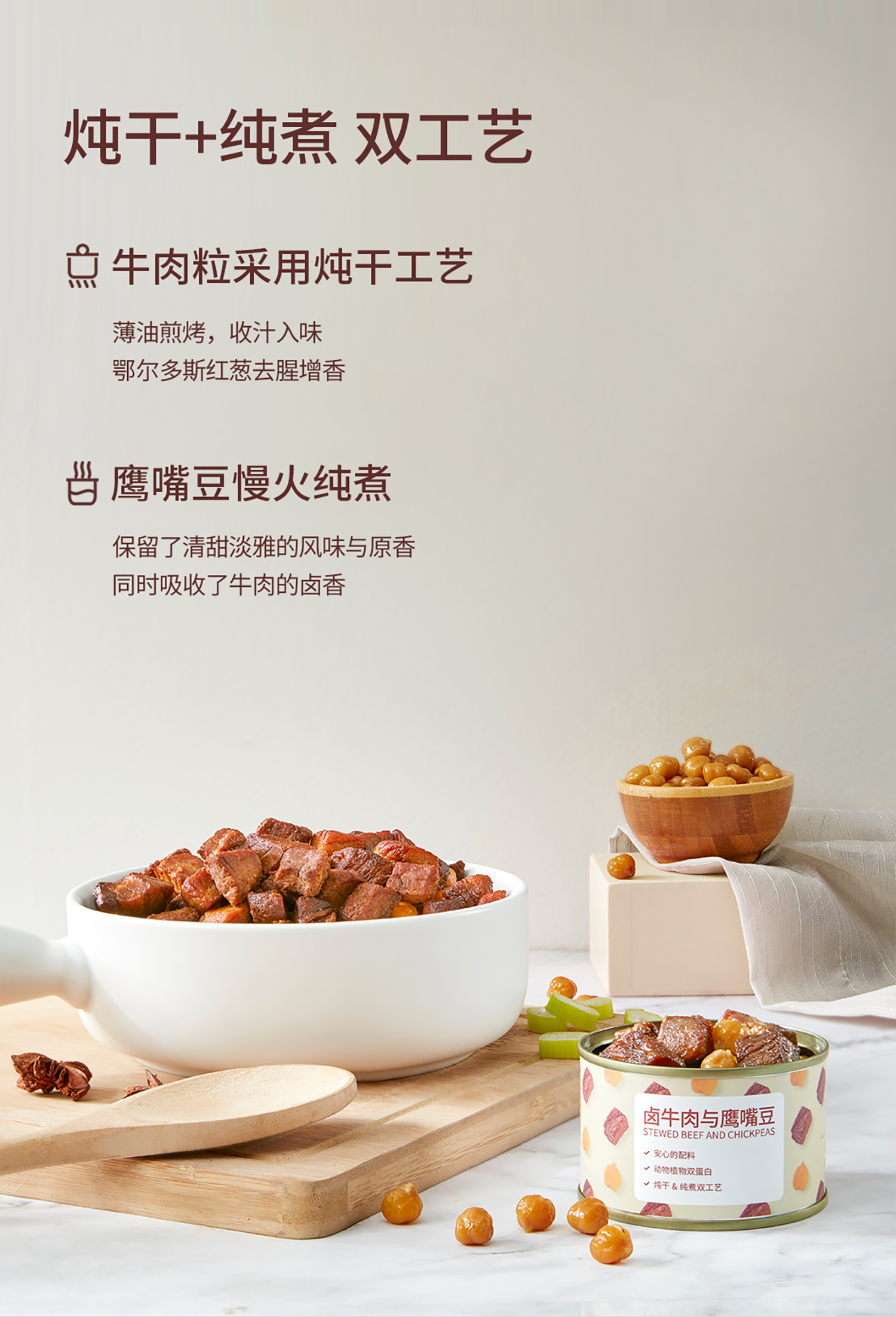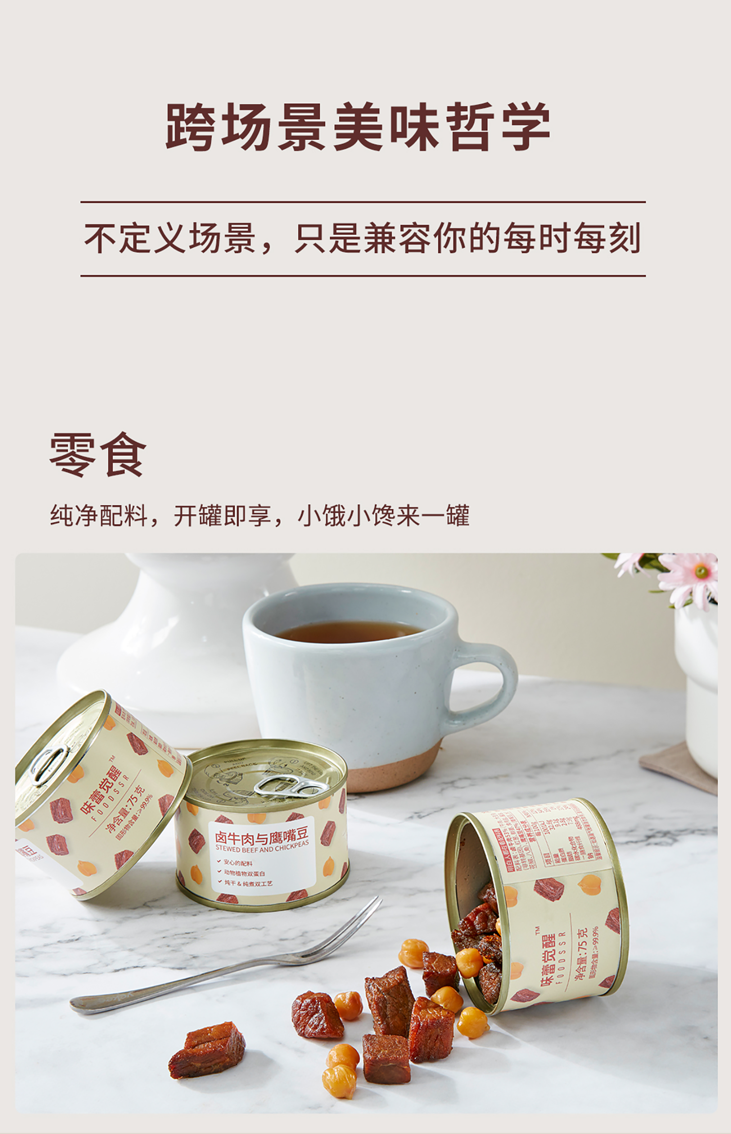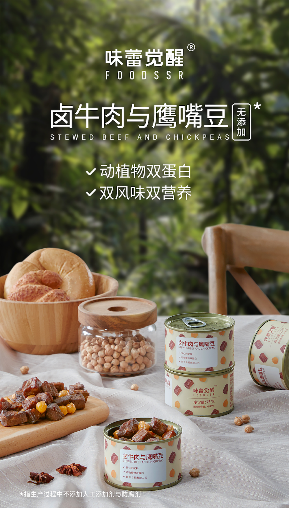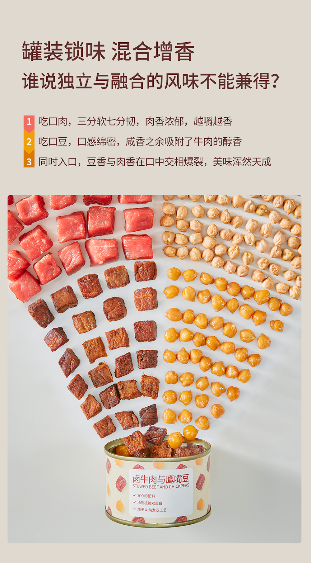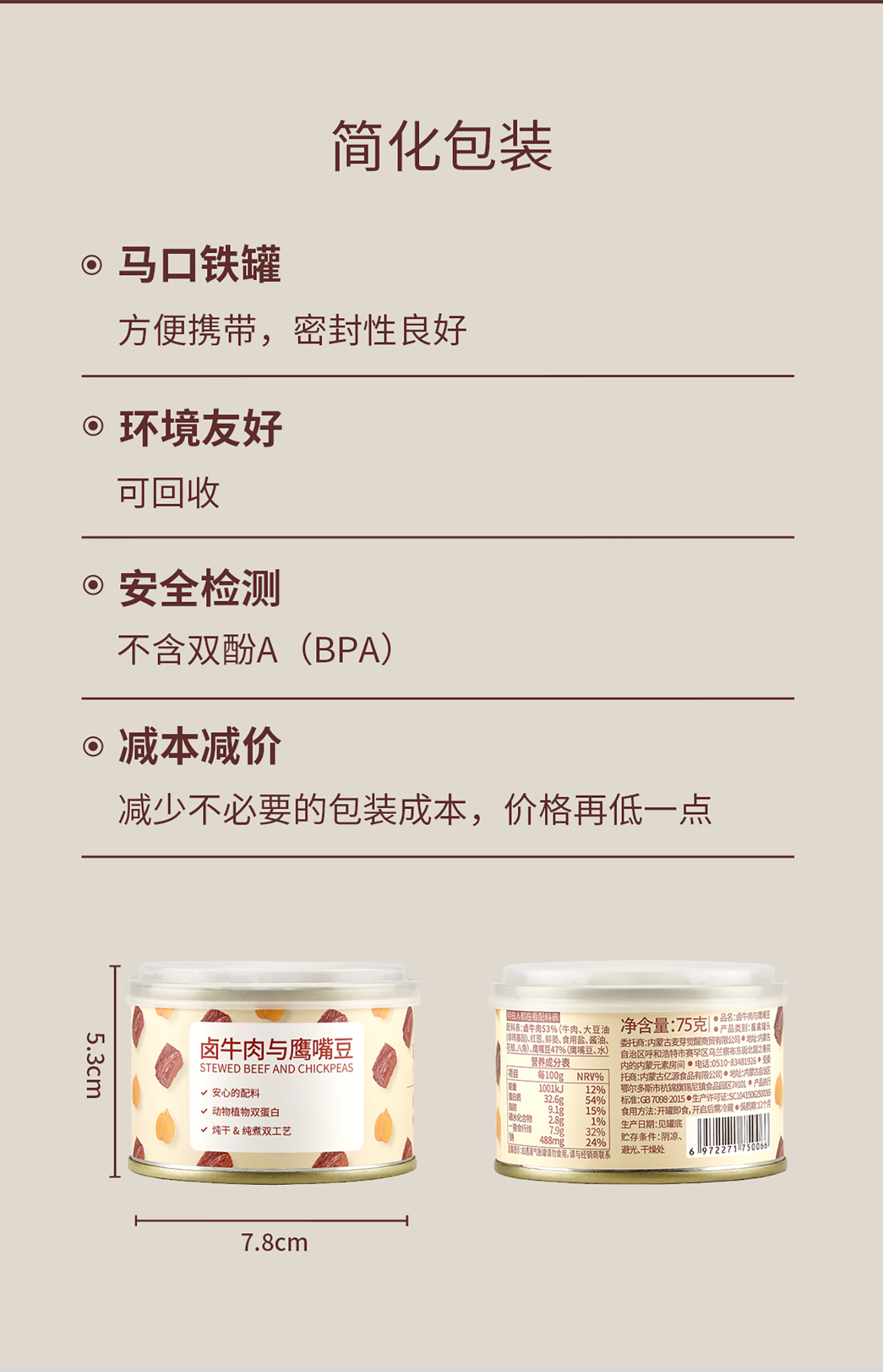 【产品规格】卤牛肉与鹰嘴豆:75g*4罐,75g*8罐;卤鸡肉与鹰嘴豆:75g*4罐,75g*8罐。