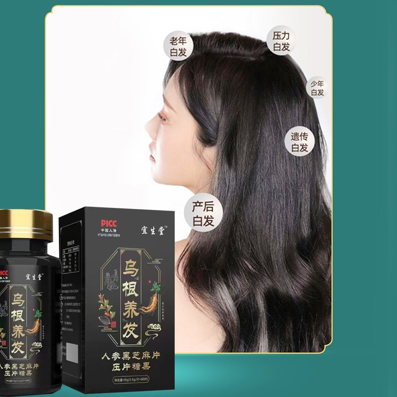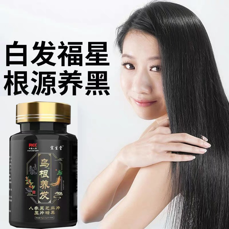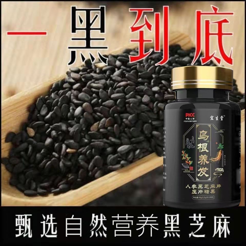 以黑养黑爆款!宜生堂乌根片 百年中医传承 古方乌根养发人参黑芝麻 养发以黑养黑药食滋补头发人参黑芝麻压片糖 少年白遗传白 中老年白发脱发断发 草本养发黑发片 60片/瓶
