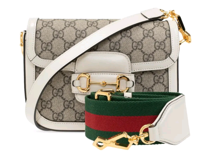 GUCCI古驰 1955 Horsebit 马街扣复古老花_ogo条纹织带 帆布拼皮革 马鞍包单肩斜挎包 迷你 乌木白色