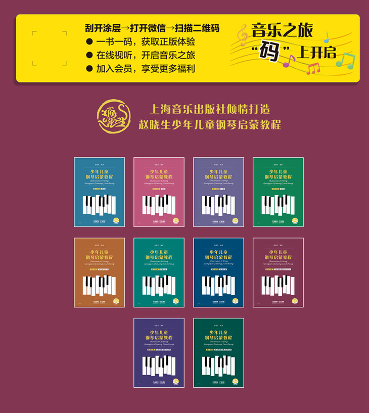 本套教程是作曲家、钢琴家、音乐教育家赵晓生教授结合自身多年的钢琴教学经验精心撰写的一套适用于少年儿童和成人的钢琴入门教程,该教程贯穿了“开启天聪,深播乐种”的基本思路,不仅教授学生钢琴演奏的基本技能,还对音程、节奏、和声、调式、调性等乐理概念进行了启发式教学,以培养学生乐感为出发点,打造了多位一体的钢琴教学模式。相信通过对本套教程的学习,钢琴学习者们可以通过开发听觉,了解音乐特性,感受音乐,从而学会音乐表达。同时,书中师生合奏如四手联弹及双钢琴演奏的教学模式可以营造轻松有趣的音乐教学氛围,极大程度地提高同学们的演奏积极性,体会钢琴学习的无限乐趣。