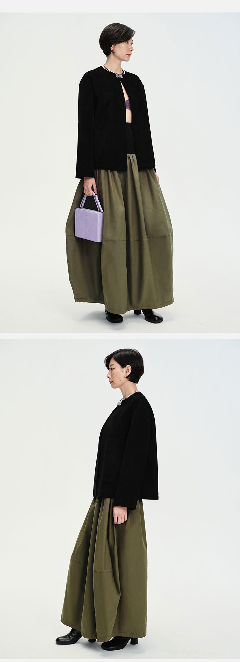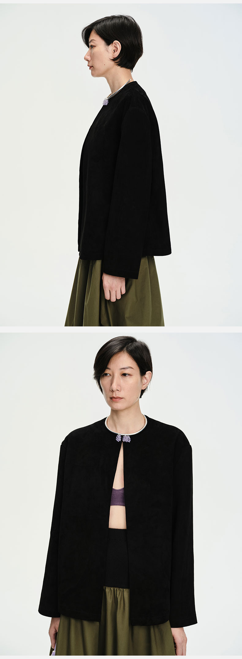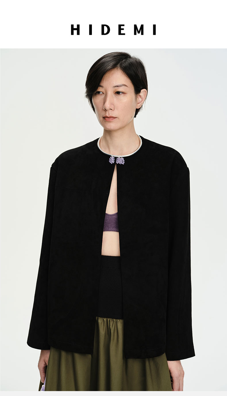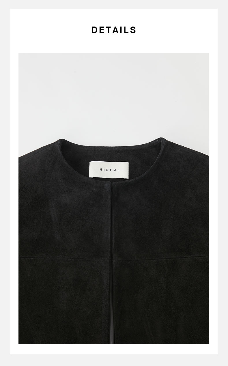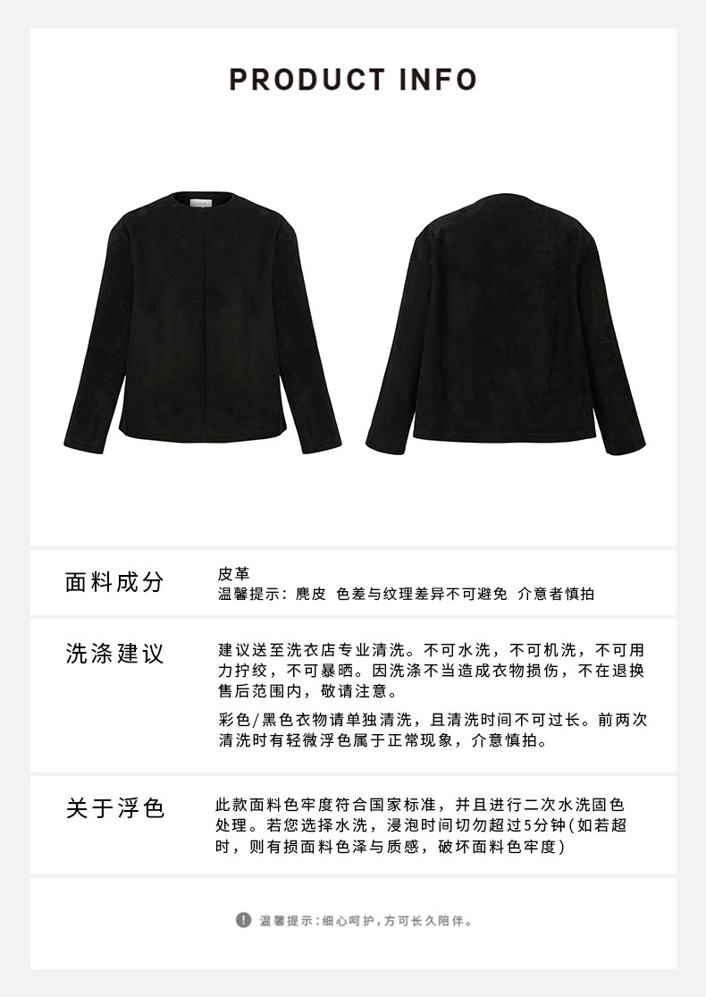 HIDEMI 黑色极简圆领麂皮中短款皮衣外套