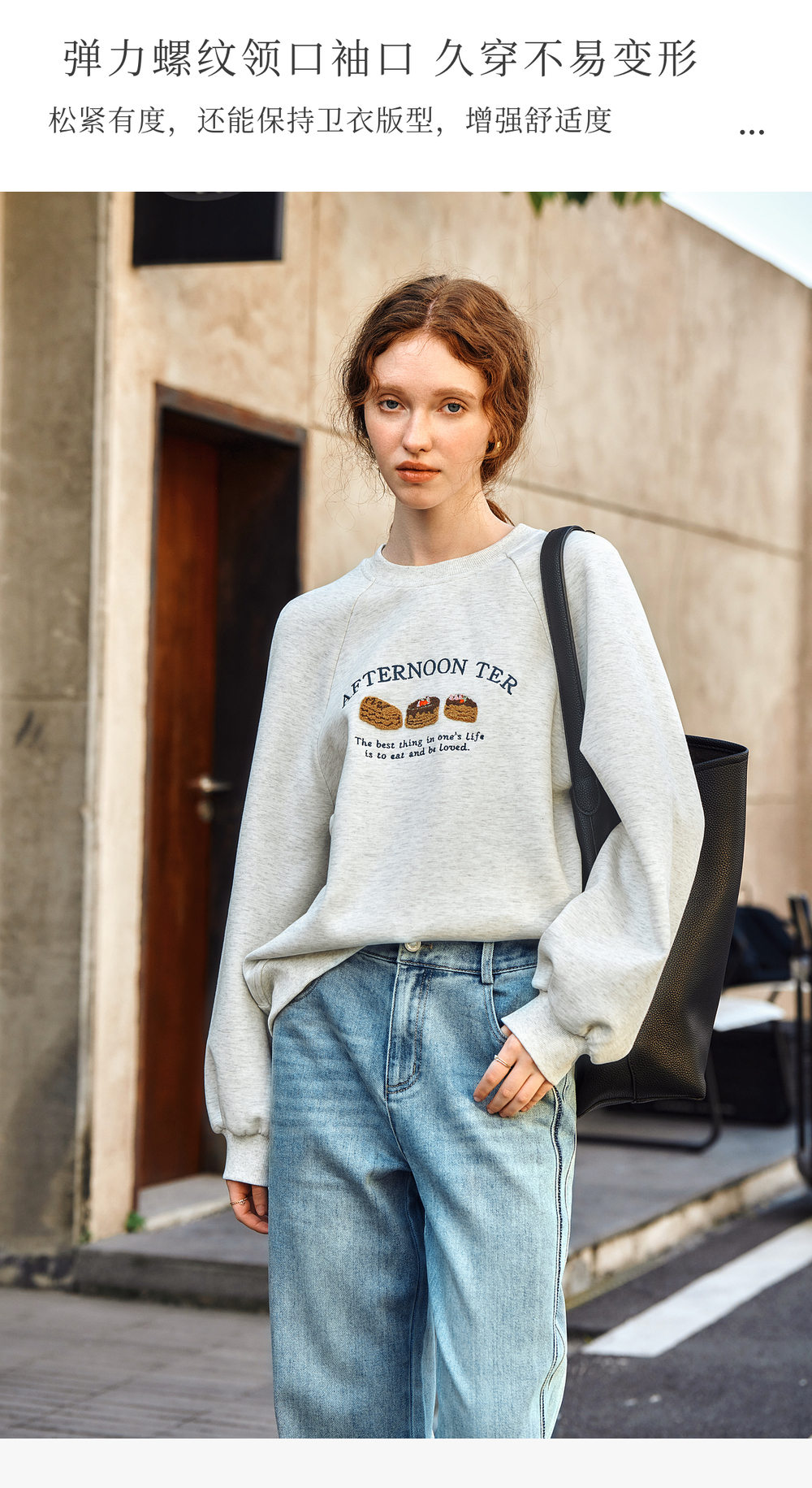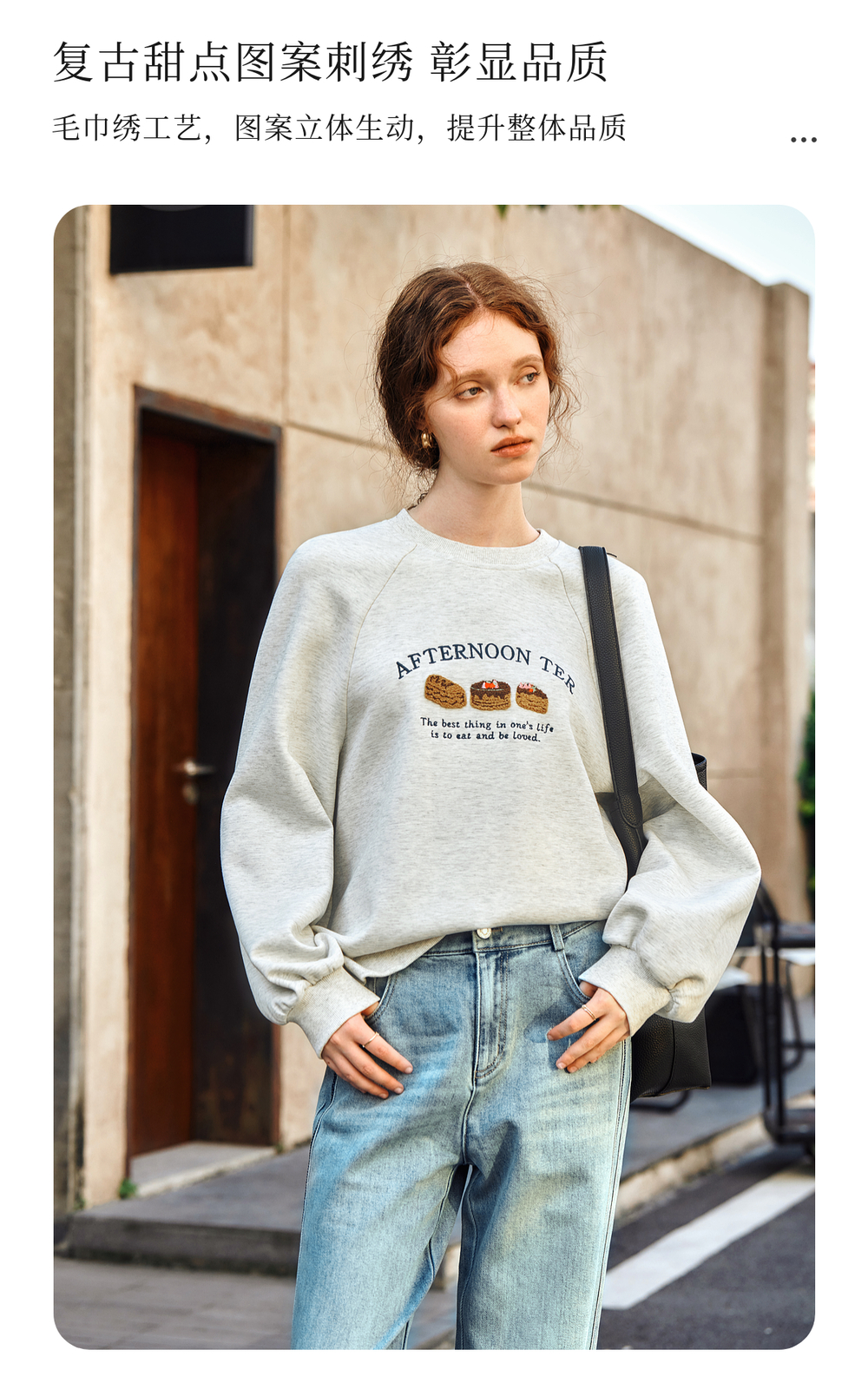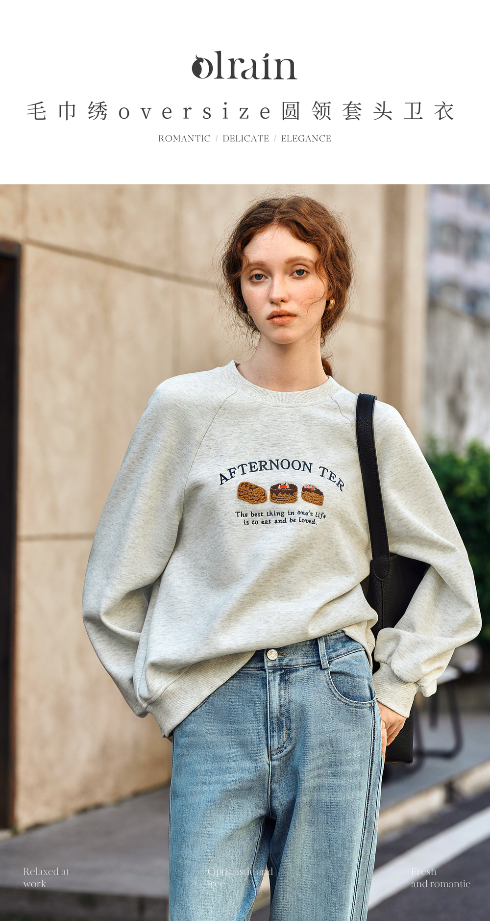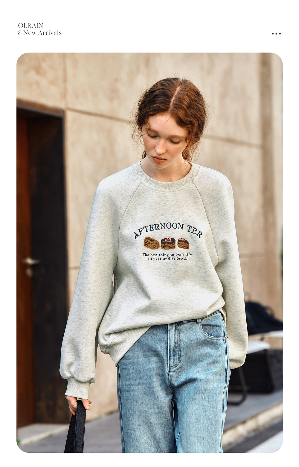 OLrain欧芮儿花灰色休闲卫衣女春季2025新款复古宽松圆领套头上衣