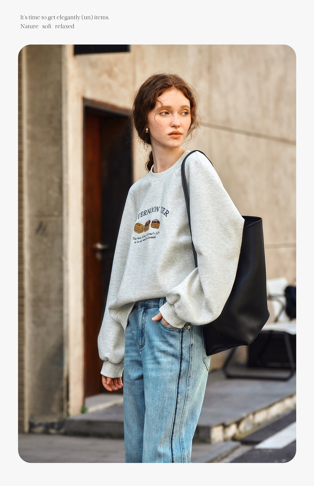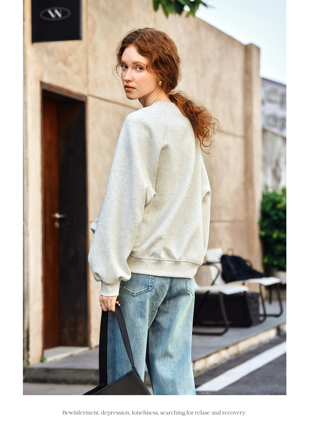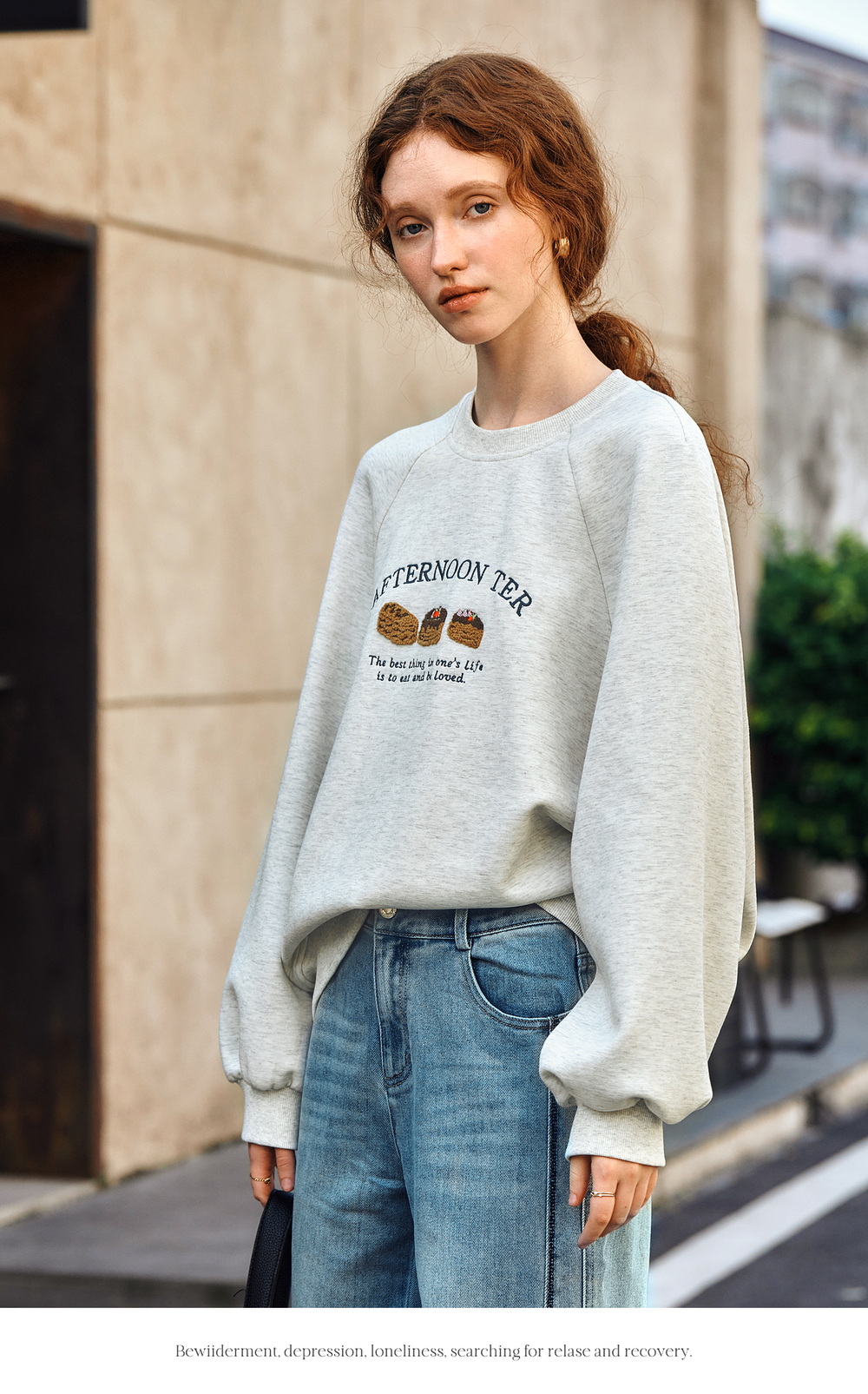 OLrain欧芮儿花灰色休闲卫衣女春季2025新款复古宽松圆领套头上衣
