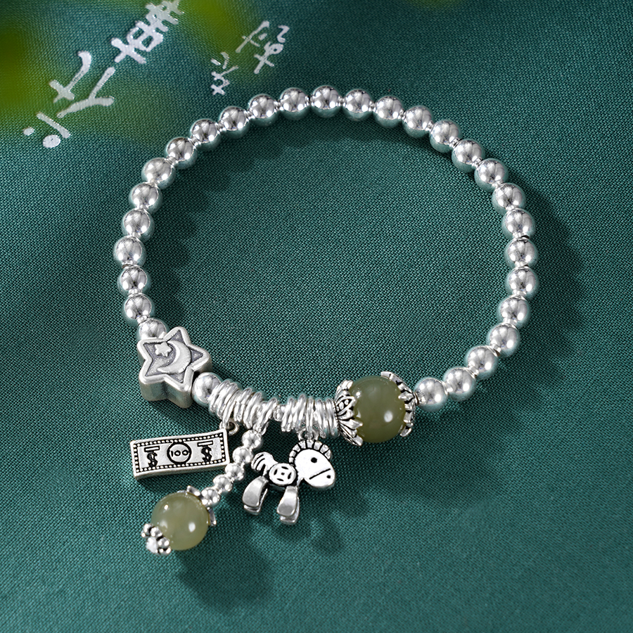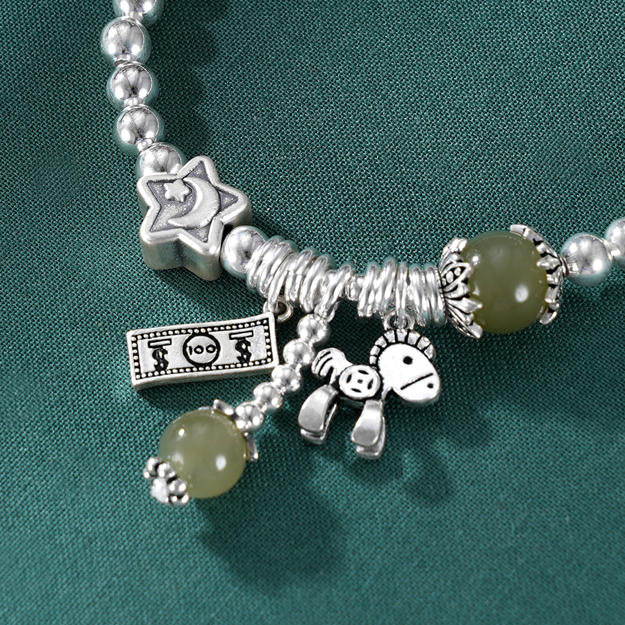 【寓意】:手串融合小马与钞票元素,纯银小马寓意“以梦为马”,钞票象征物质富足。青玉圆珠的融入更添青春活力。整条手串寓意物质与精神双丰收。