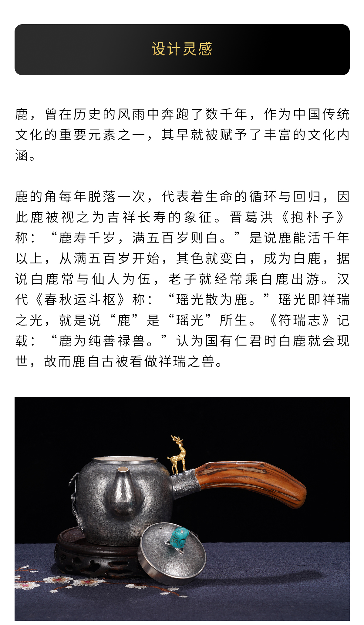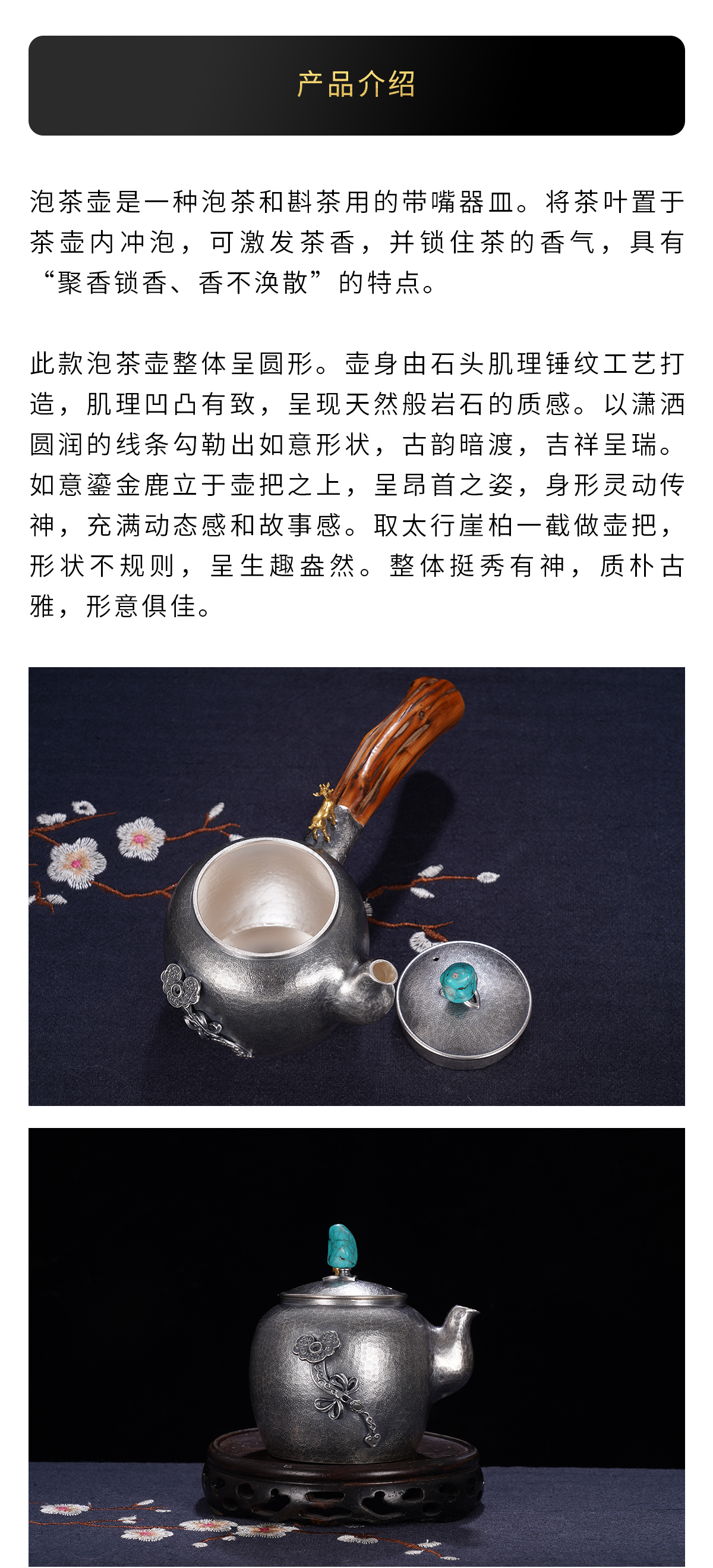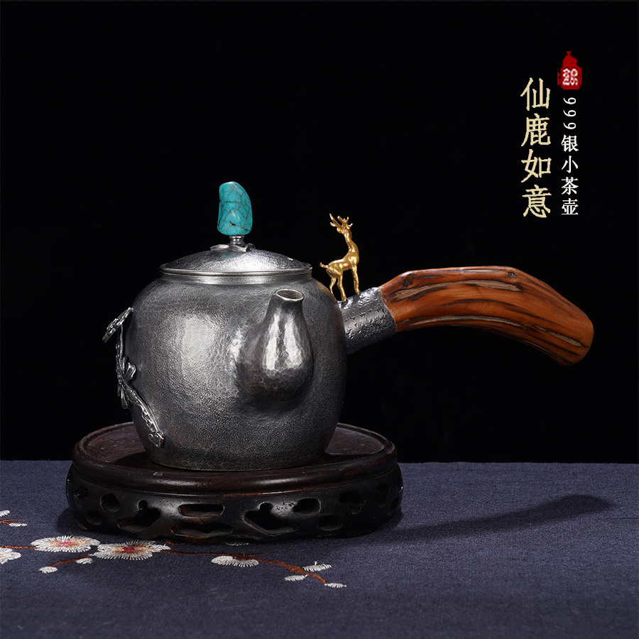 子佩集S999银+崖柏【仙鹿如意】小茶壶摆件【TG0012】2403