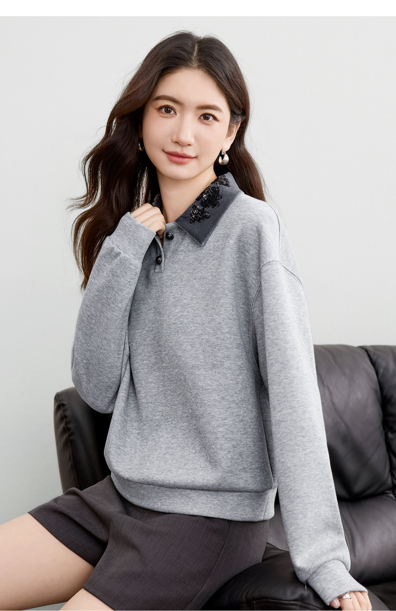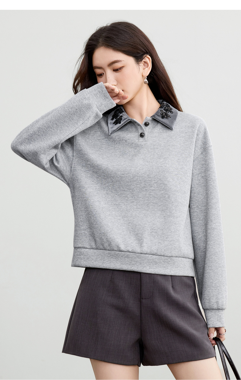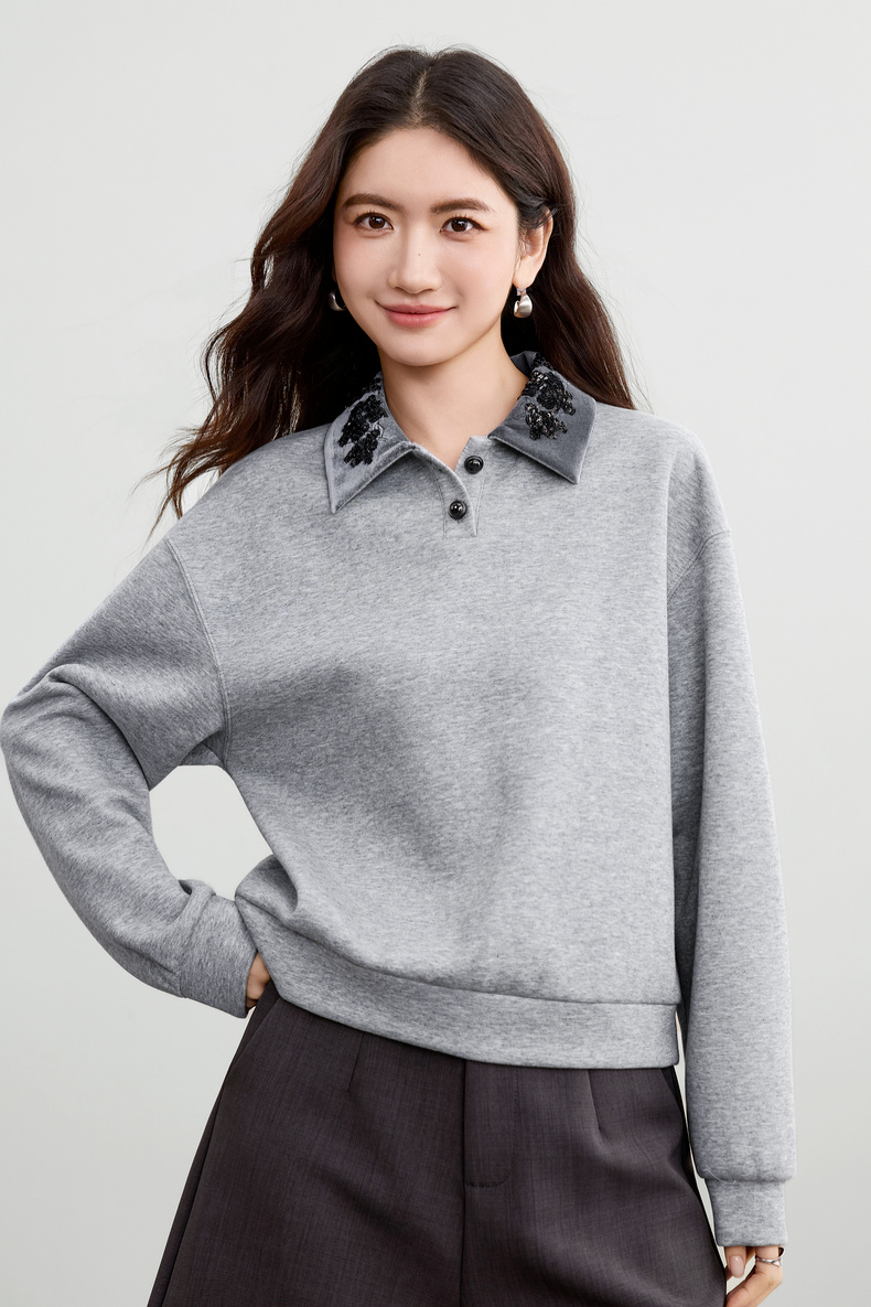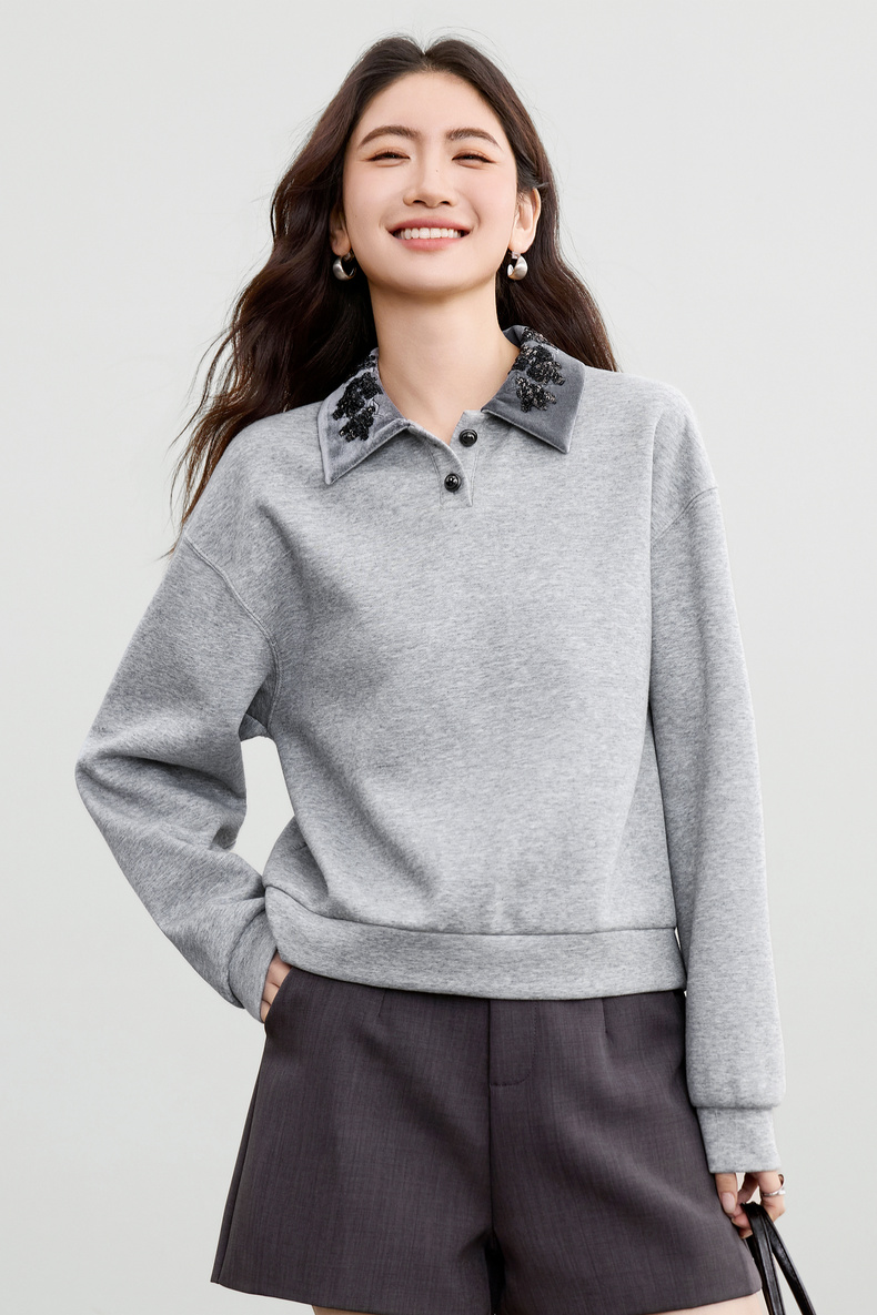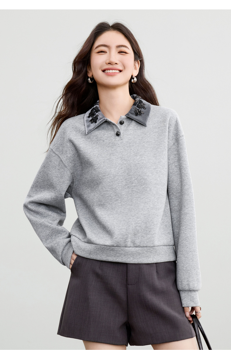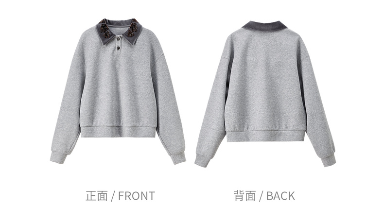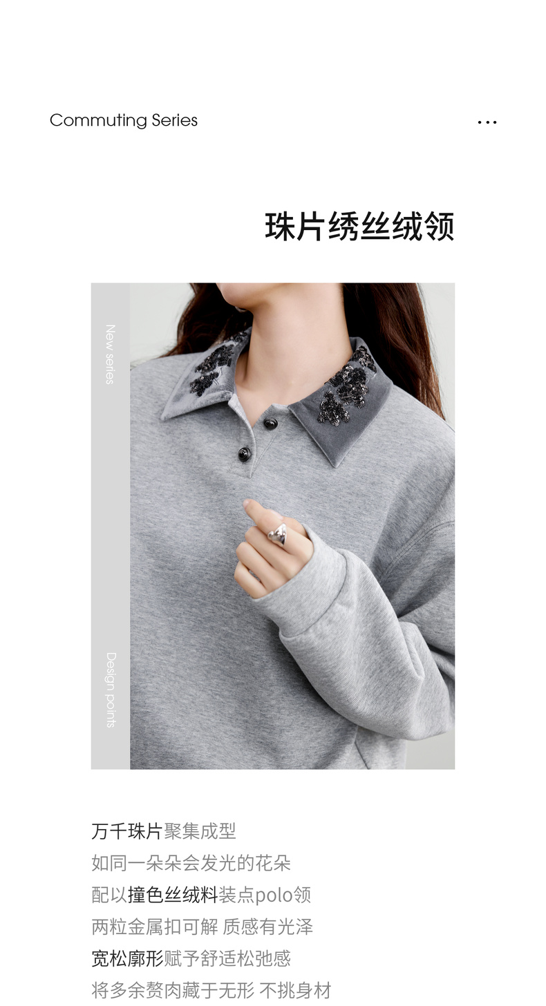 【内购】【珠片绣】设计感撞色丝绒polo领半开襟宽松显瘦长袖针织卫衣-153AK2011