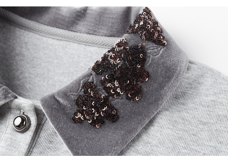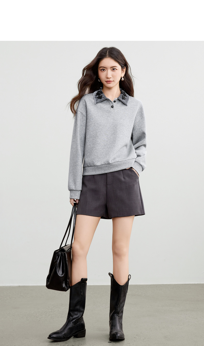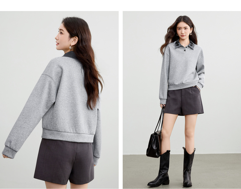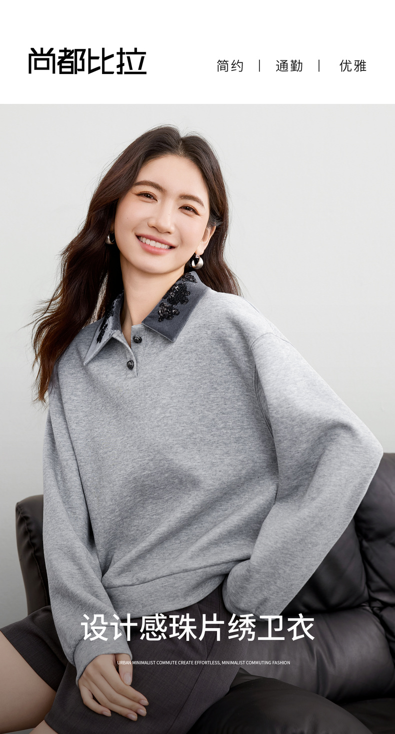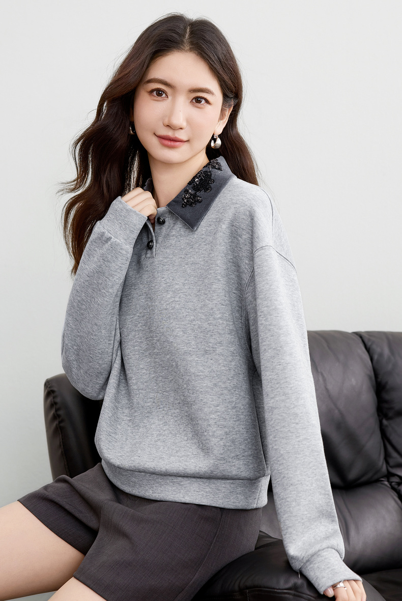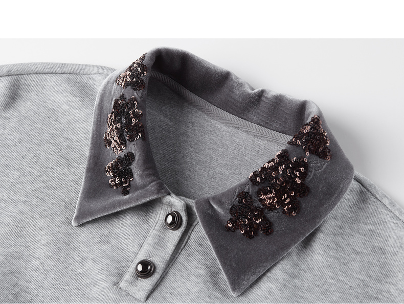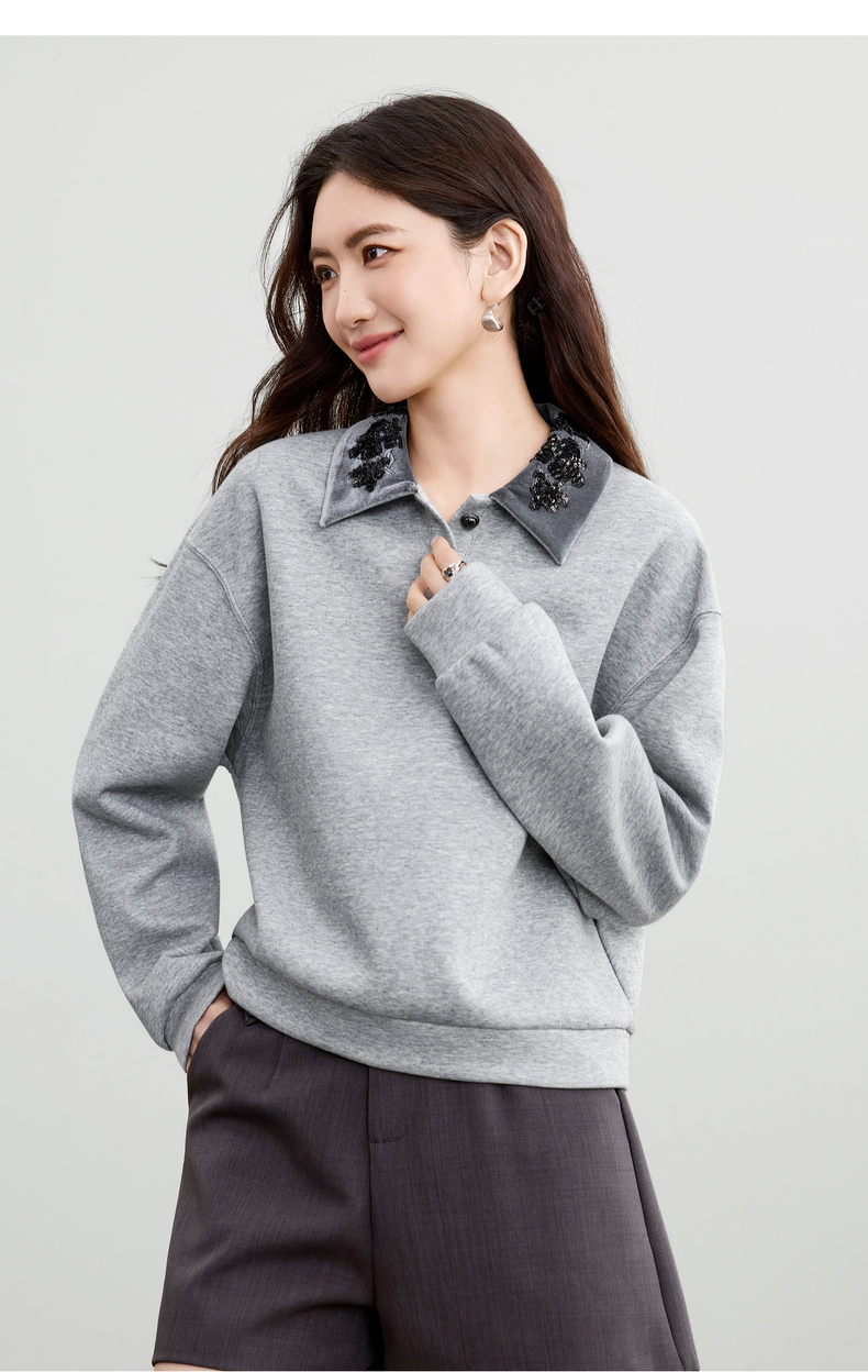 【内购】【珠片绣】设计感撞色丝绒polo领半开襟宽松显瘦长袖针织卫衣-153AK2011