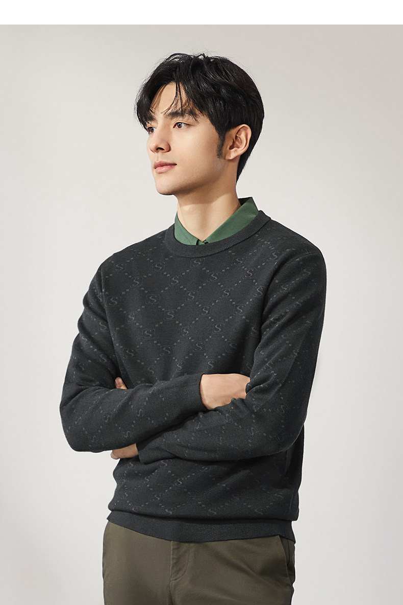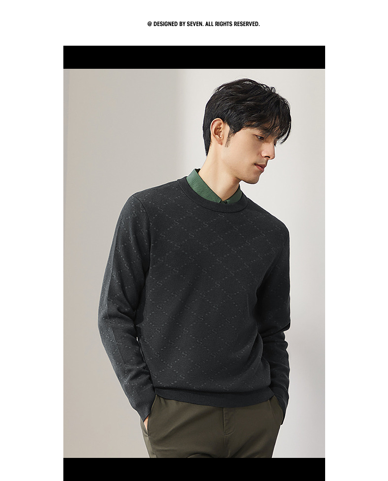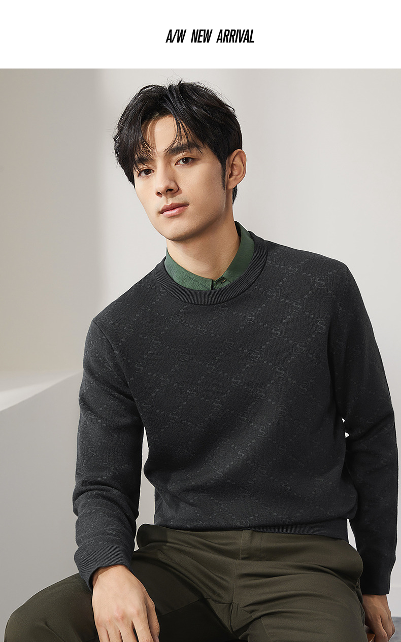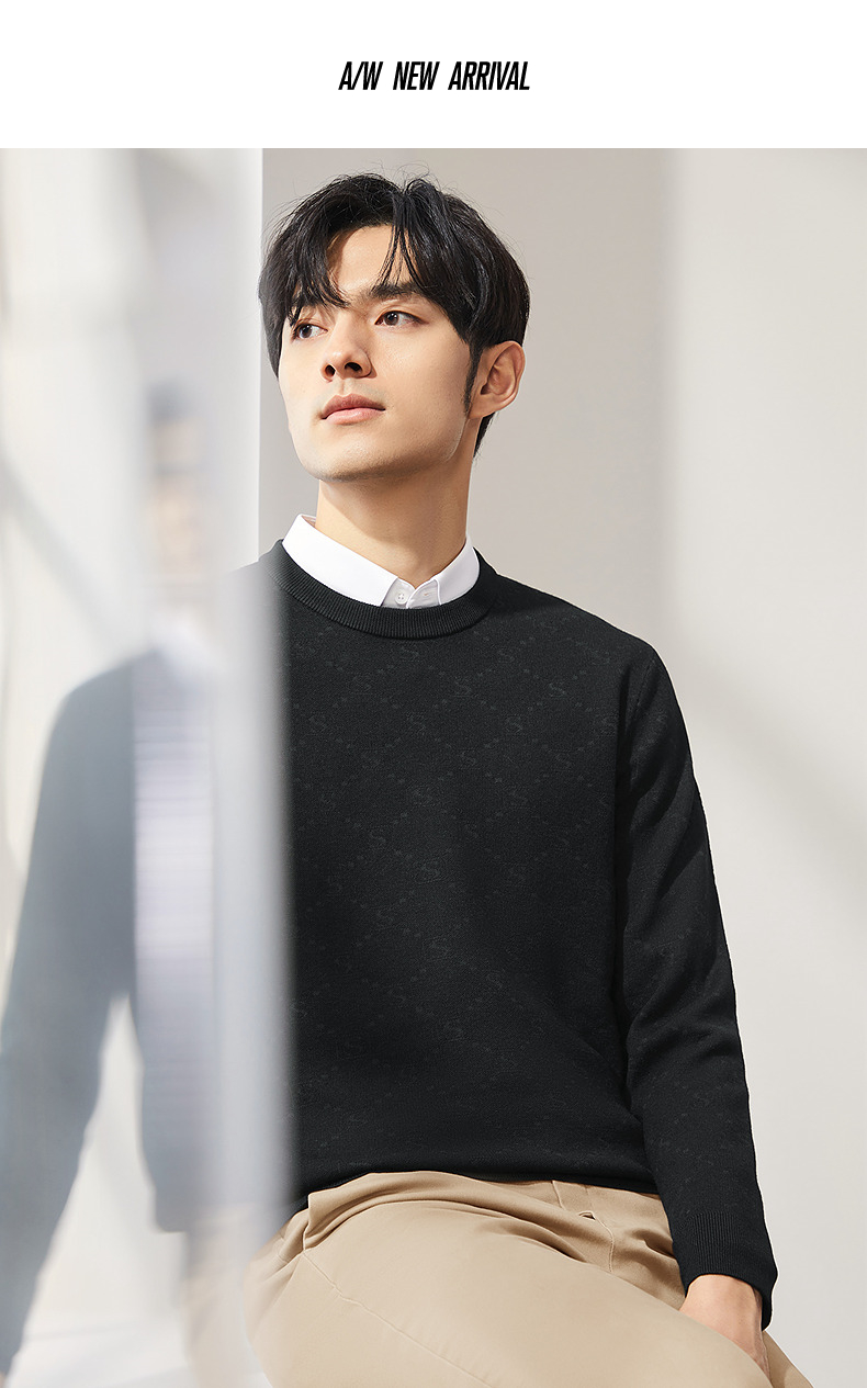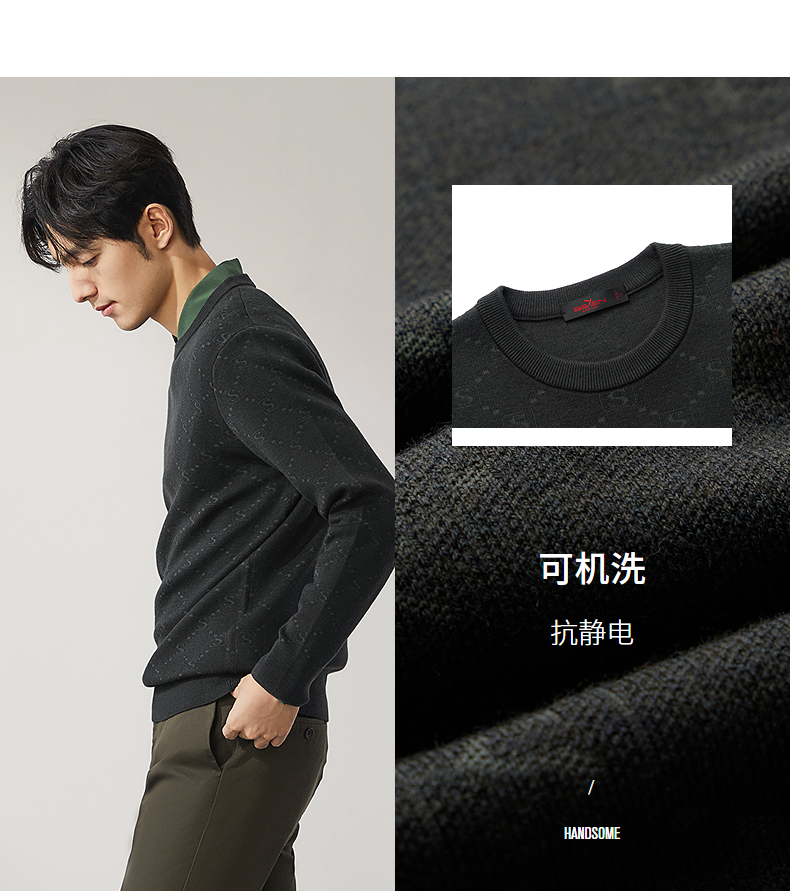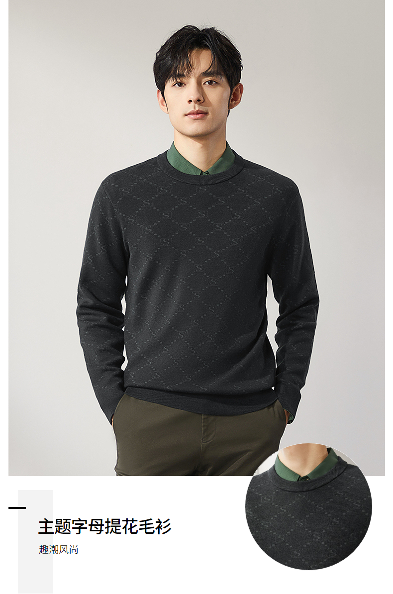【抗静电】柒牌可机洗毛衣男秋冬新品时尚字母提花含羊毛圆领毛衫 127Y70390