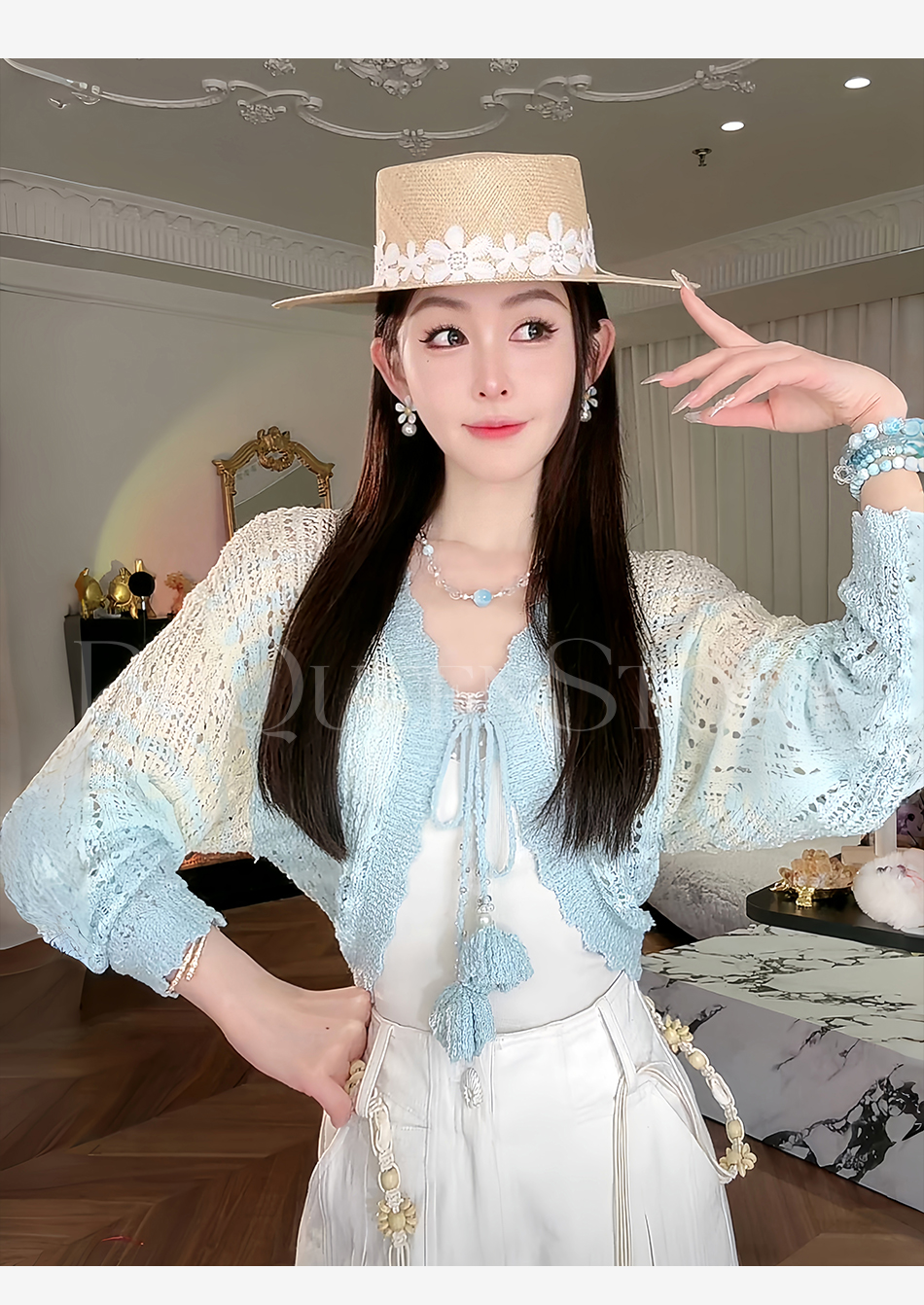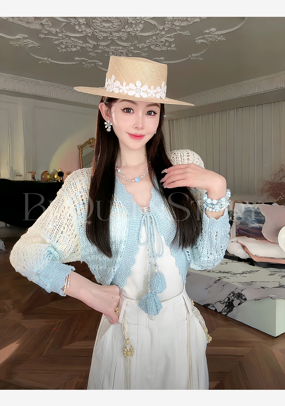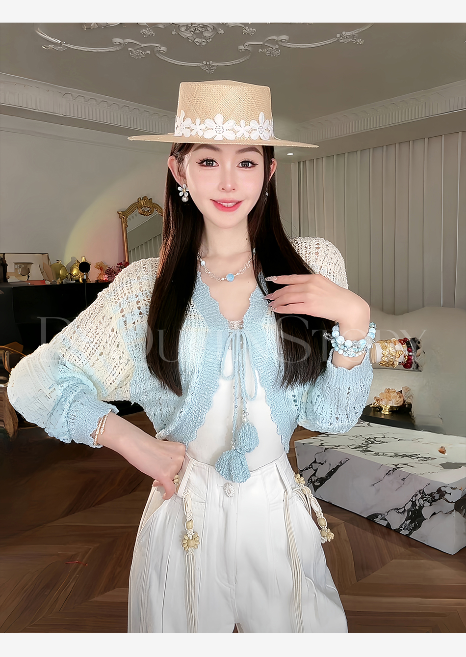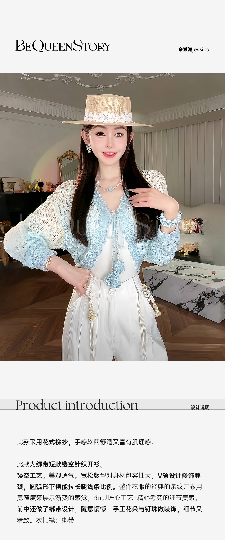 余潇潇【奶油浪花】百搭绑带短款镂空设计V领针织开衫2025春季新款
