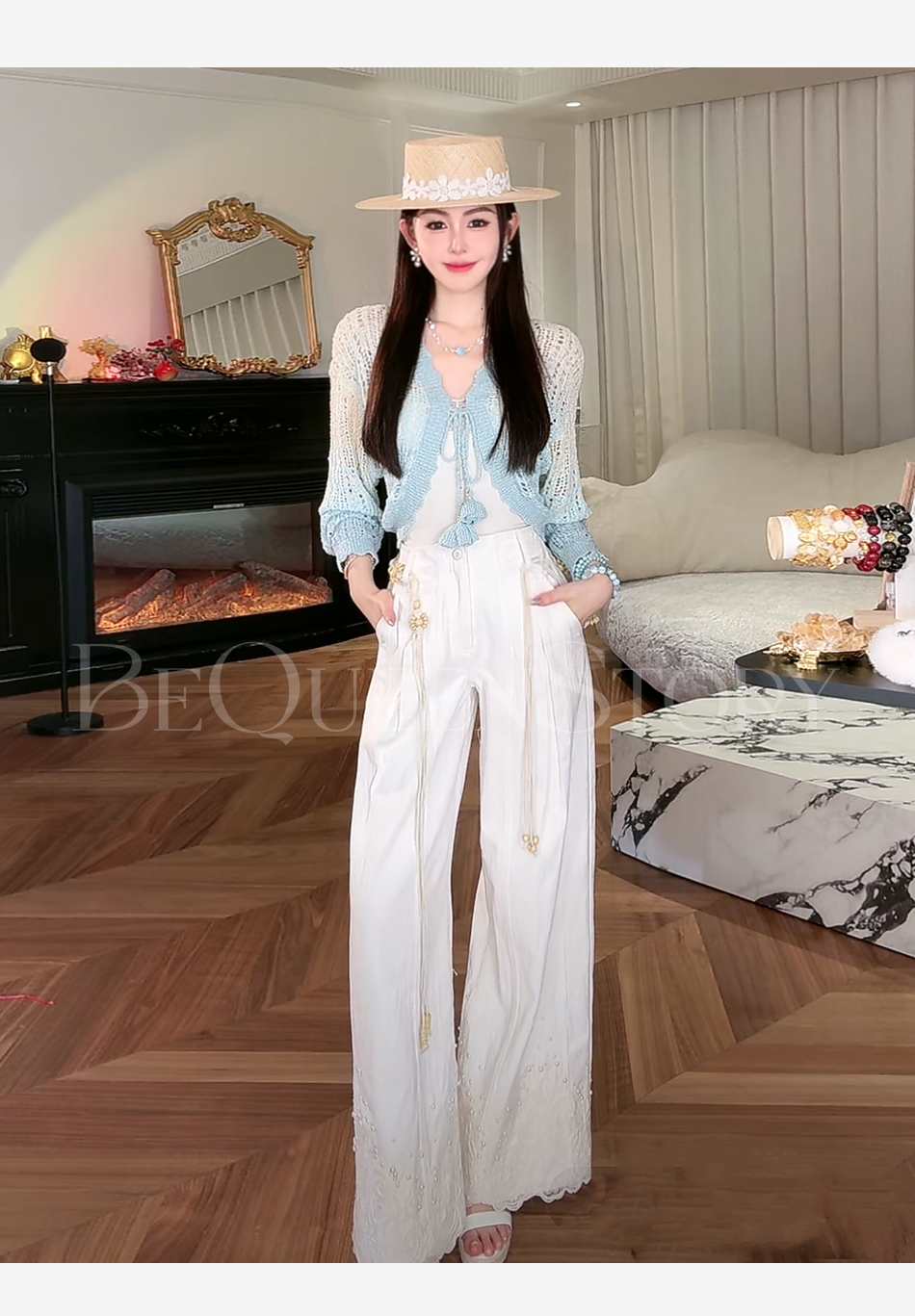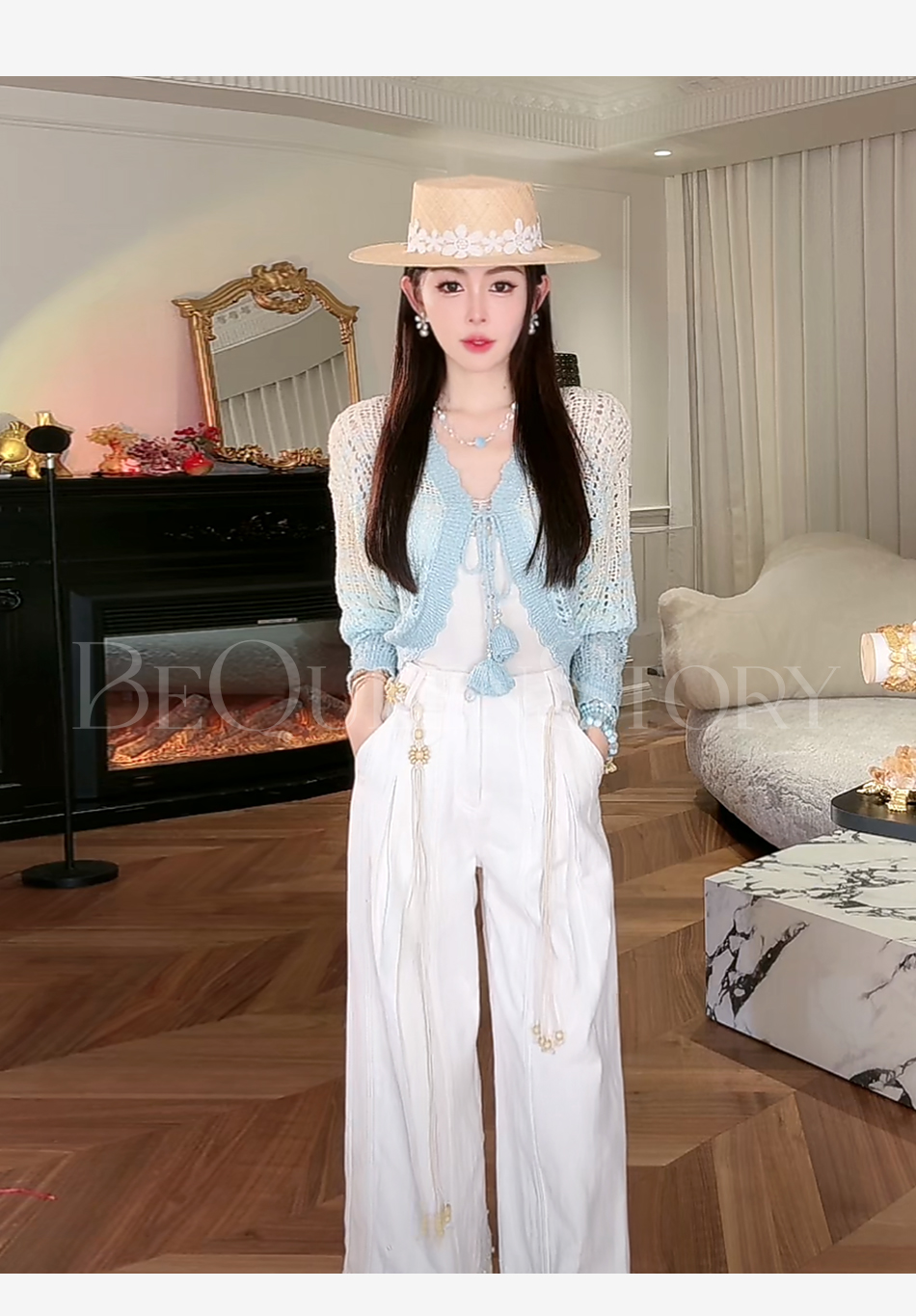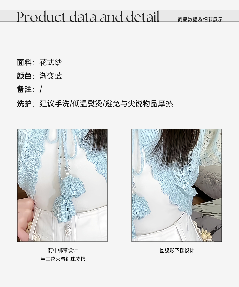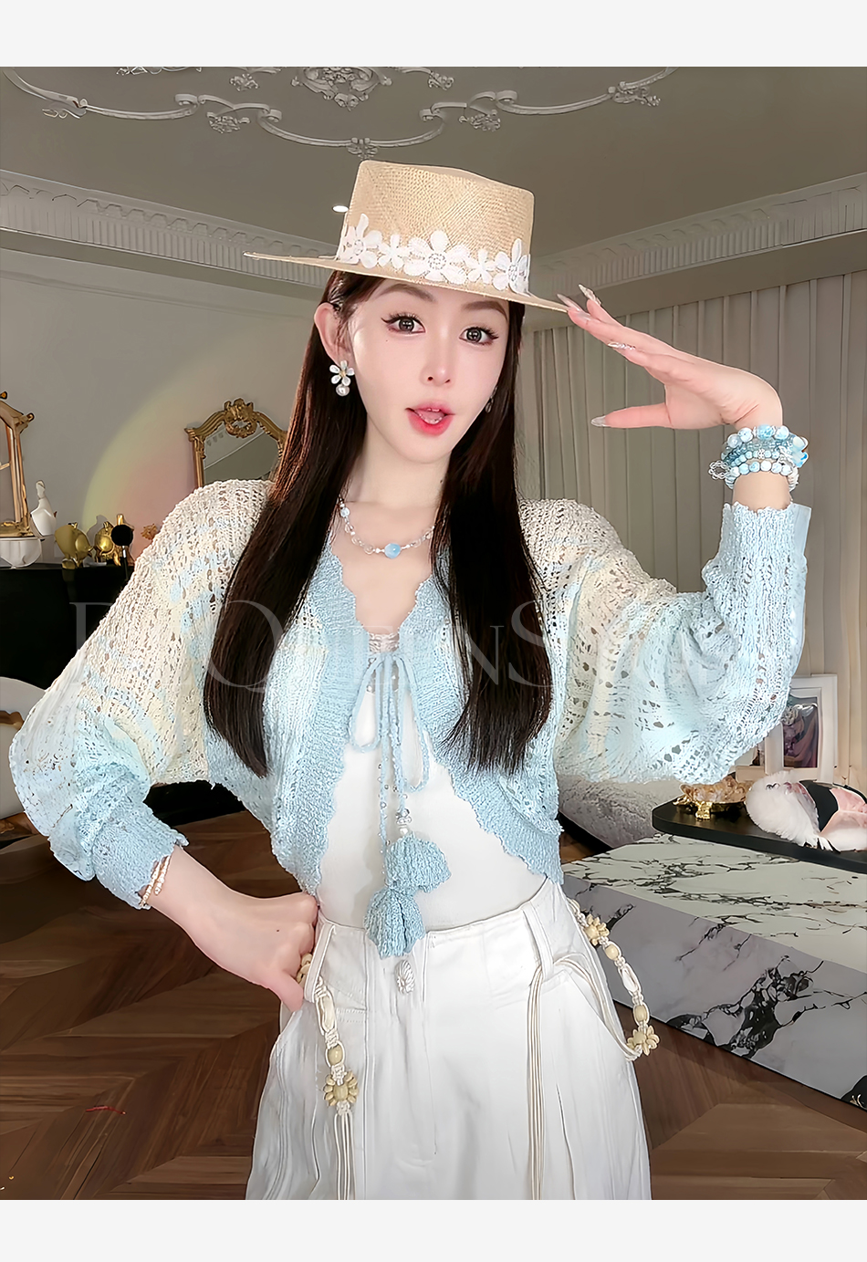 余潇潇【奶油浪花】百搭绑带短款镂空设计V领针织开衫2025春季新款
