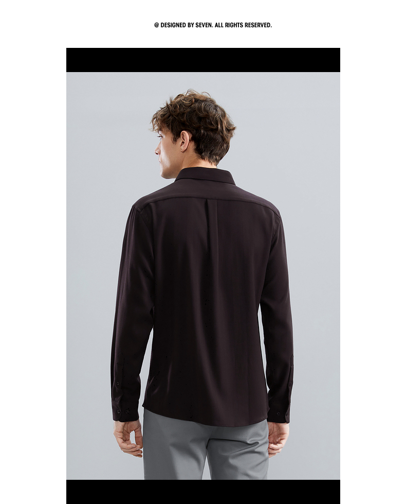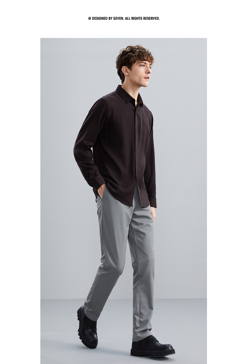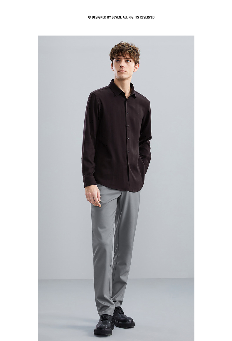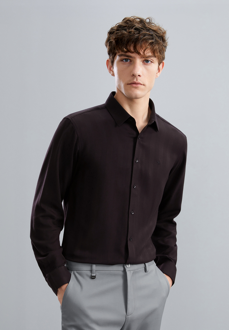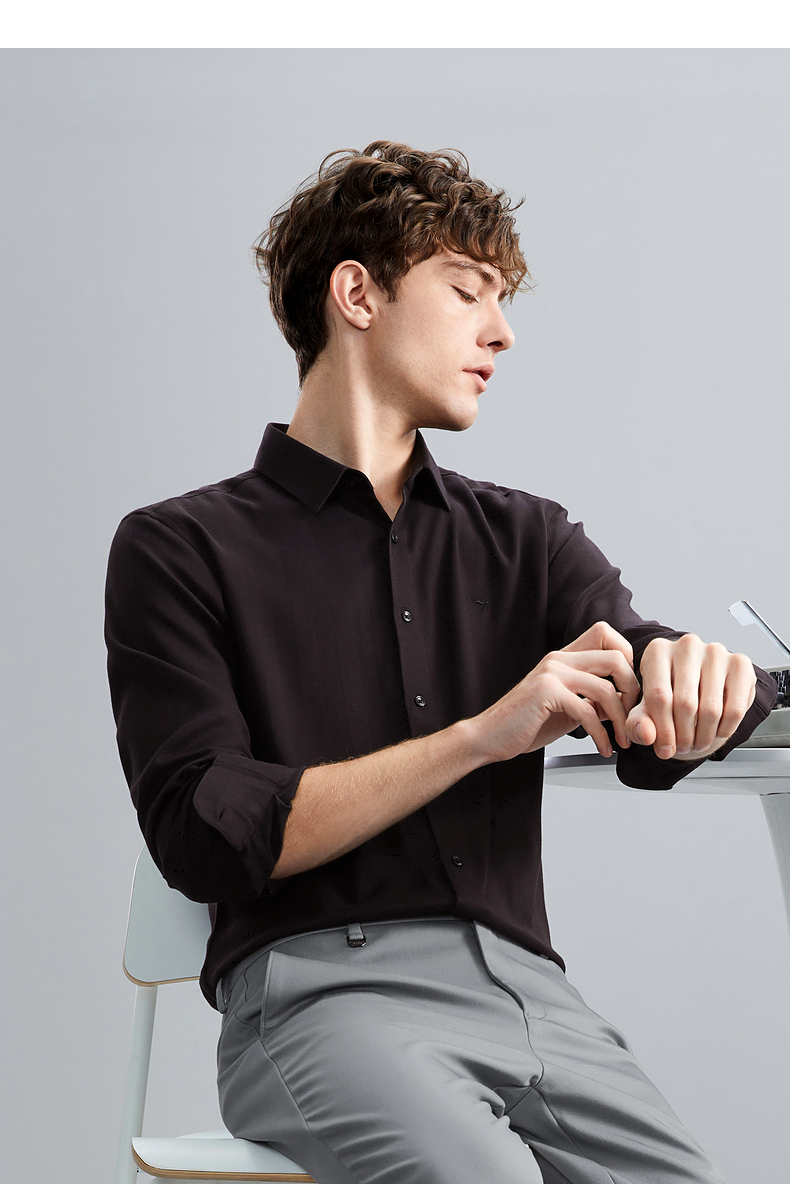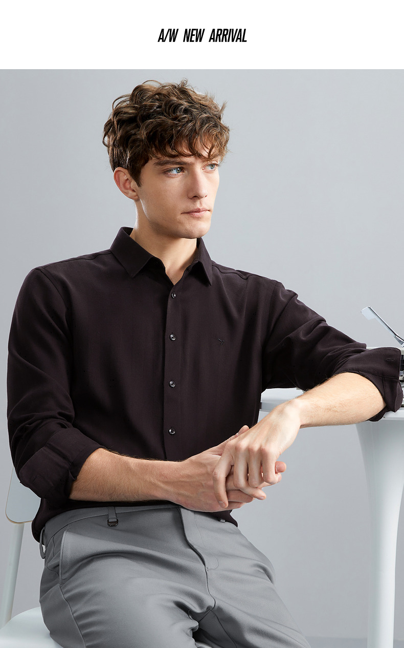 【含羊毛】柒牌男装长袖衬衫男秋冬新款条纹提花撞色黑色翻领衬衣 125A70050