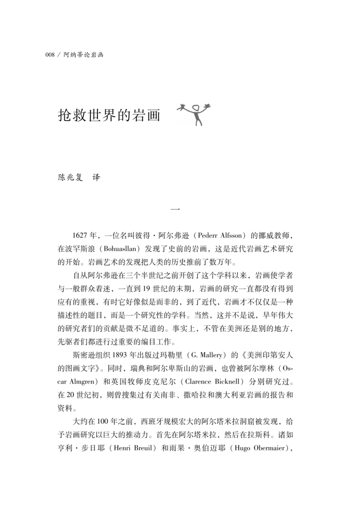 本书的第一篇《抢救世界的岩画》译于1985年,第二篇《世界岩画研究概况—一份送交联合国教科文组织的报告》也译于1985年,两篇文章合在一起由中央民族学院少数民族文学艺术研究所以《世界岩画研究概况》为书名在1985年作为内部资料刊行了。20世纪80年代,正是我国的岩画点如雨后春笋一般从一些地区冒了出来,岩画的大量出现,使人们迫切想去了解岩画究竟是怎么一回事。所以这本内部资料的印行可以说是适逢其时的。就我所知,这本资料是我国第一本介绍外国岩画理论的翻译著作,当时只印了100本,在岩画界同仁中颇为流行。后来我在意大利的卡莫诺史前研究中心的图书室里也看到过这本书。
