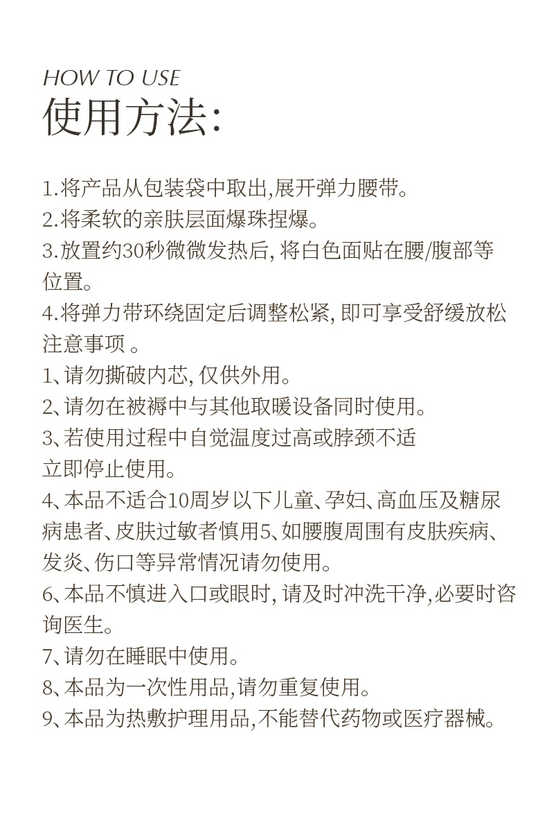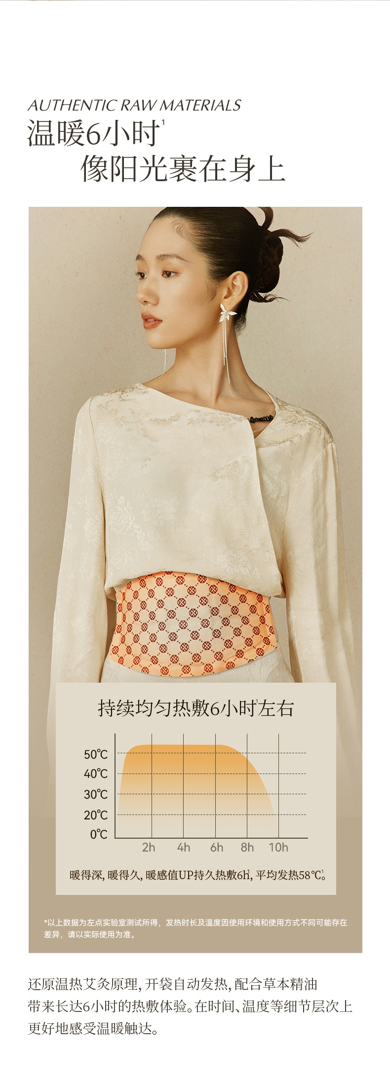 【材质】:材质:魔术贴、水刺无纺布、医用针刺棉、亲肤弹力带,成分:艾草、藏红花提取物、香附、川芎、生姜、海盐、天竺葵爆珠精油、铁粉、水、活性炭