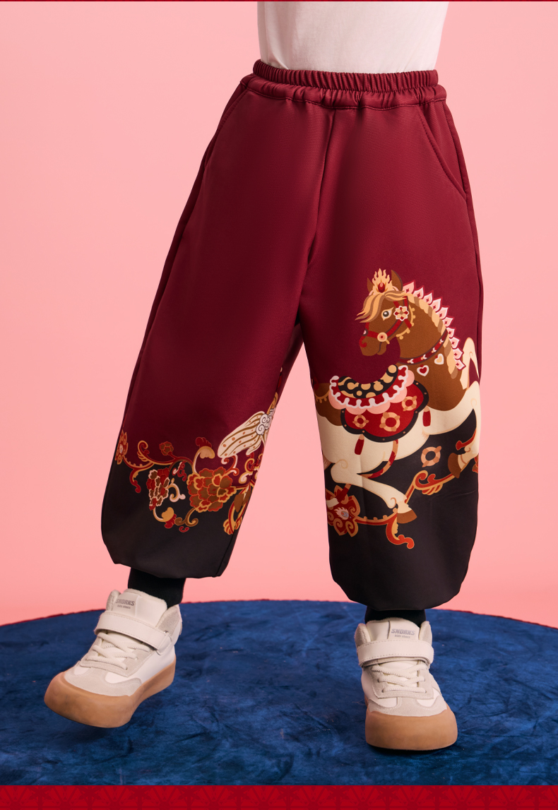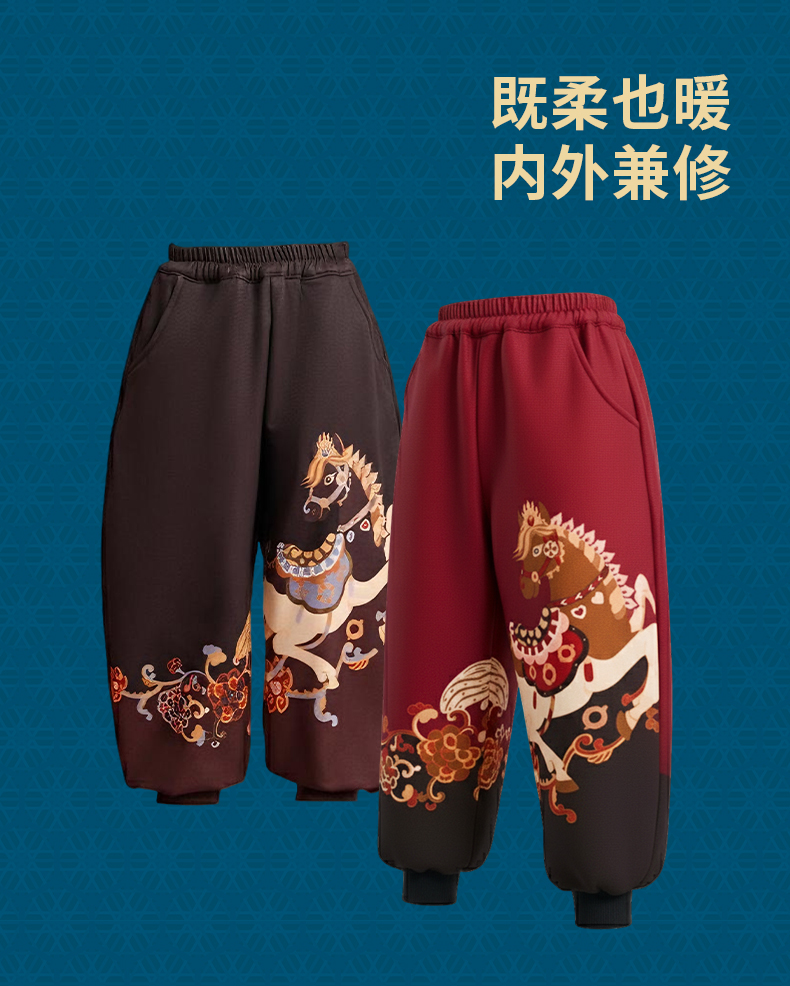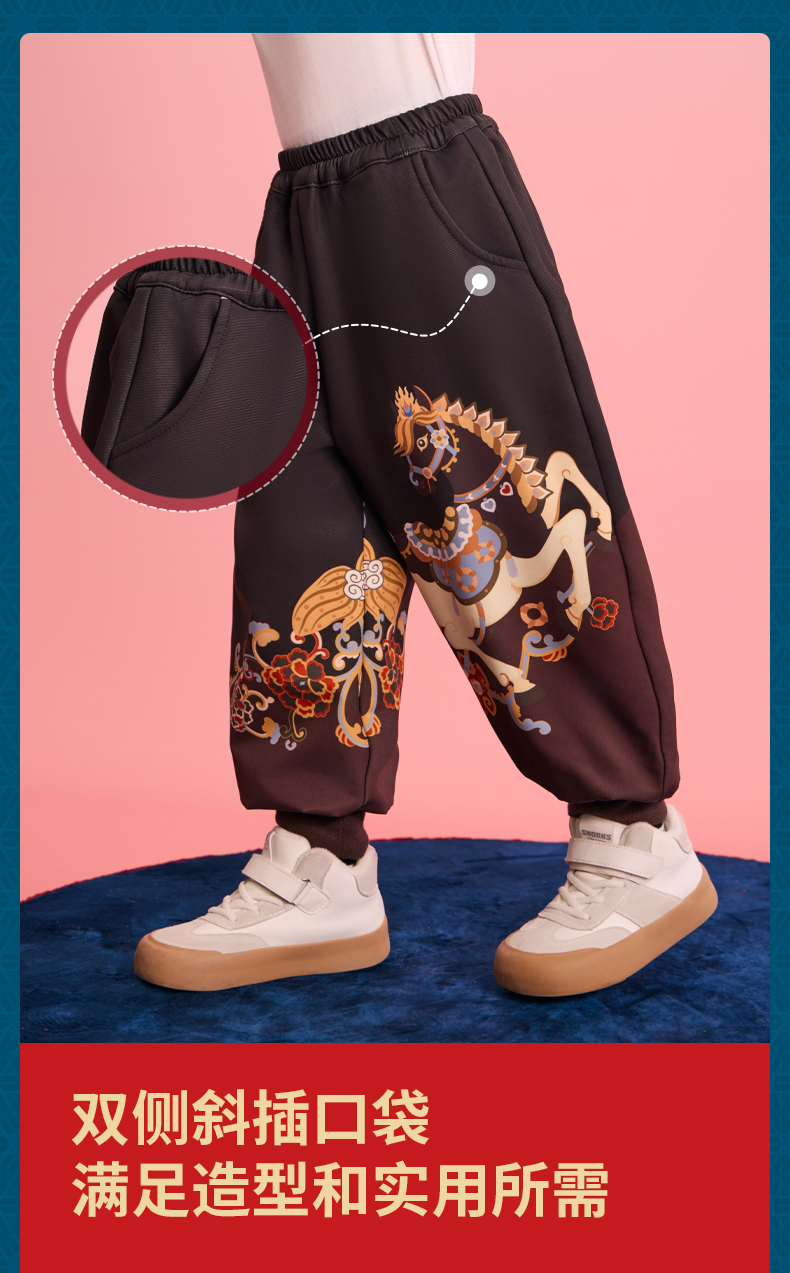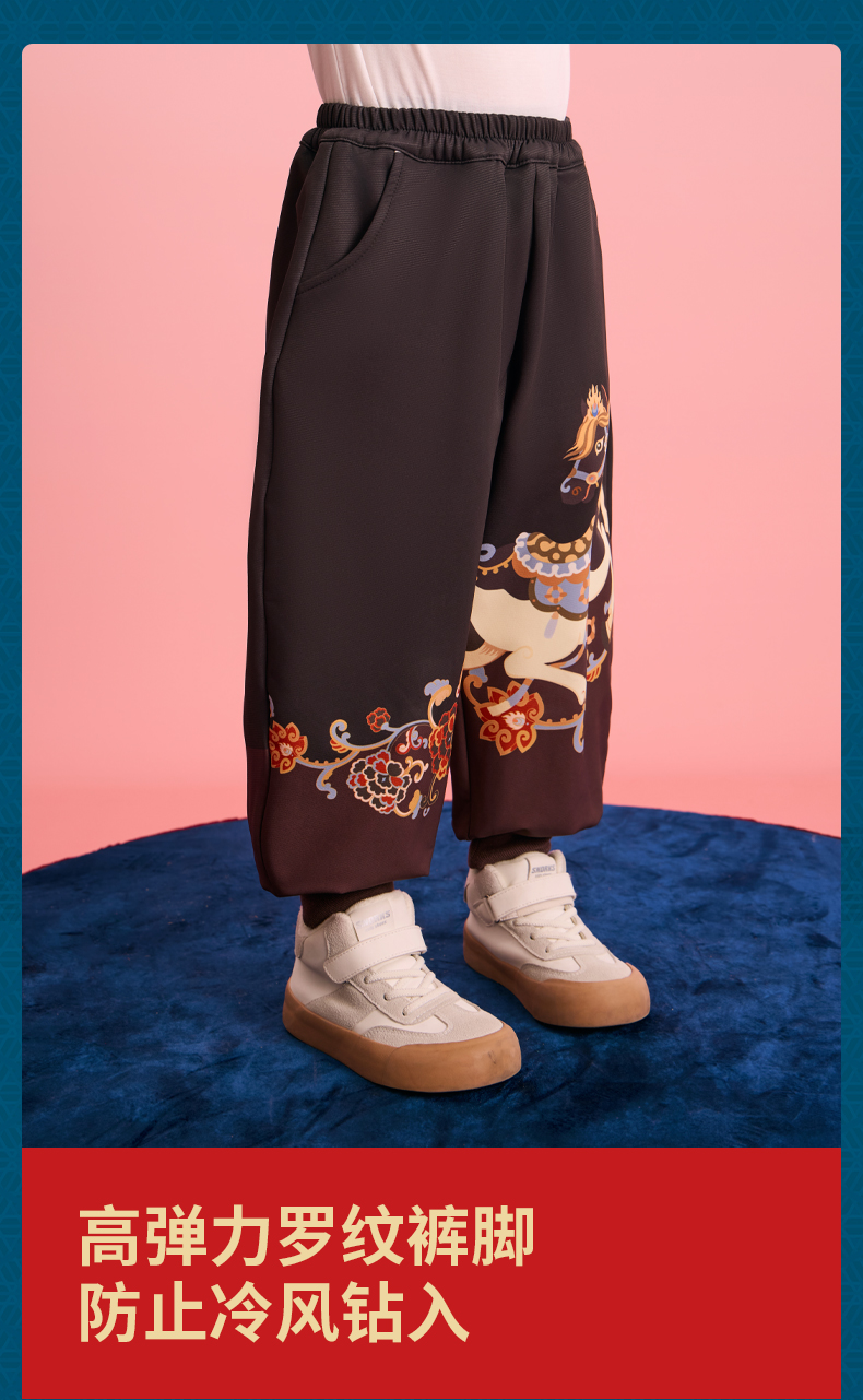 年衣童装儿童加绒长裤冬季新款男童运动裤女童跃马新程加绒长裤