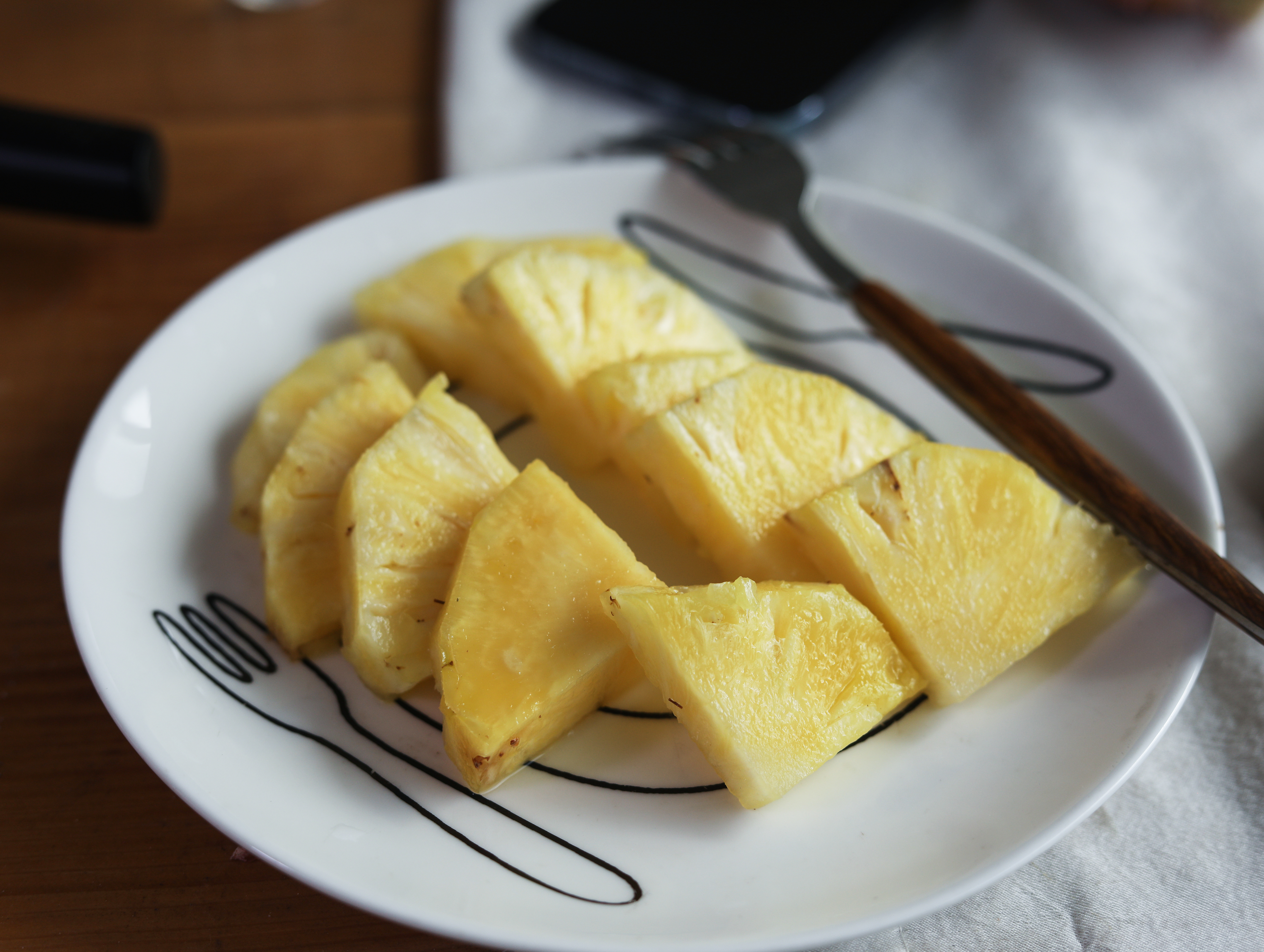 果肉非常新鲜,每一块都饱含着汁水,不是用水泡大的那种。咬一口,果肉立马化渣,鲜甜的果汁迸裂进口腔,天然不掺水的凤梨果汁,让人欲罢不能~