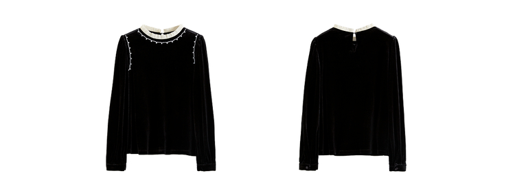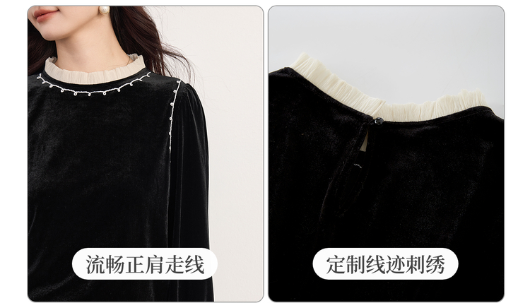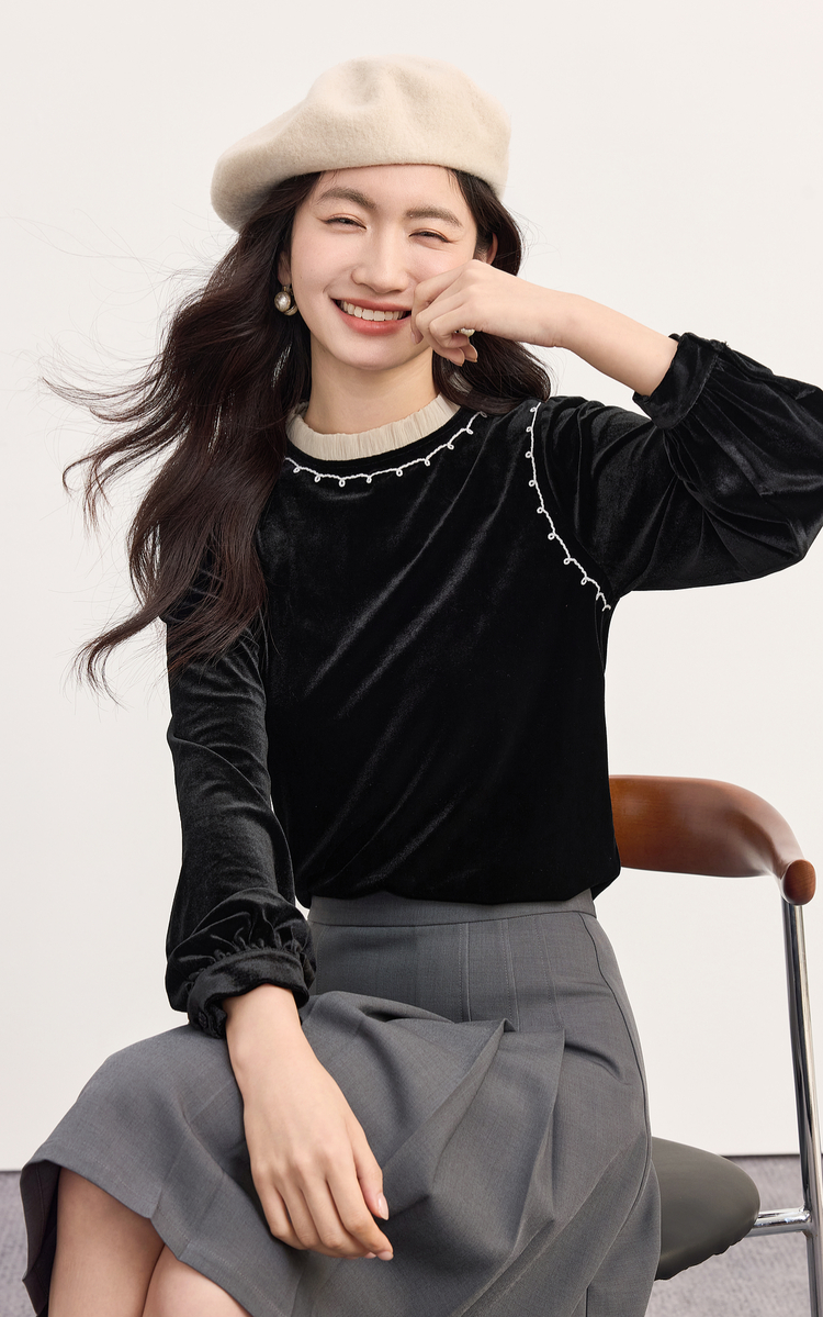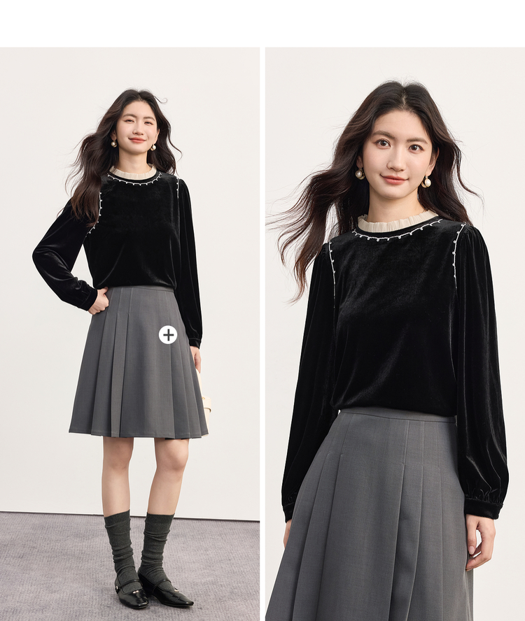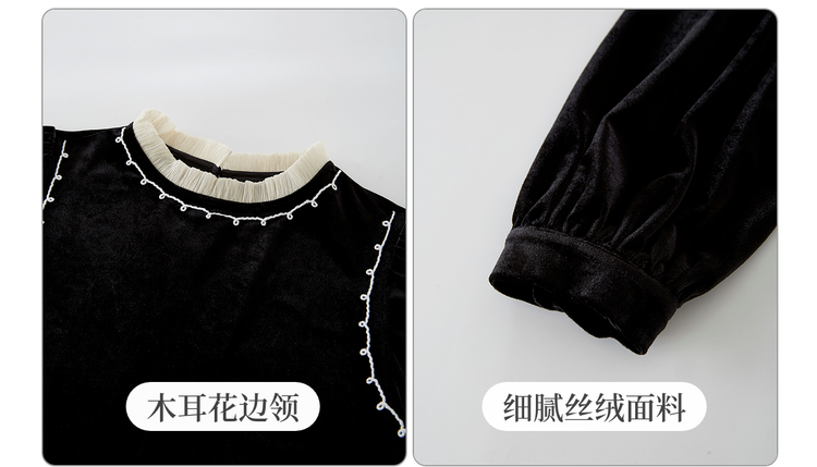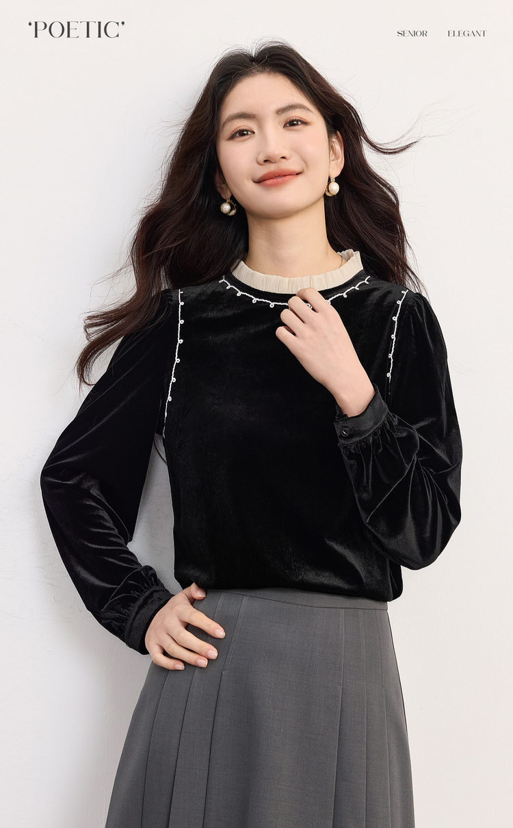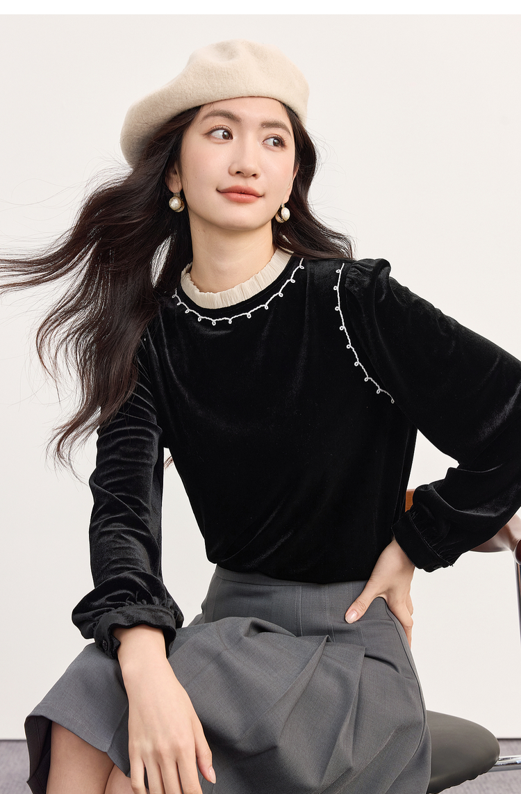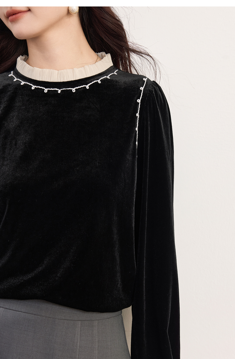 【10/1新品】熙世界法式千金风黑丝绒衬衫女秋冬高级感优雅赫本木耳边长袖上衣