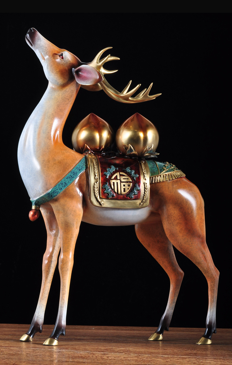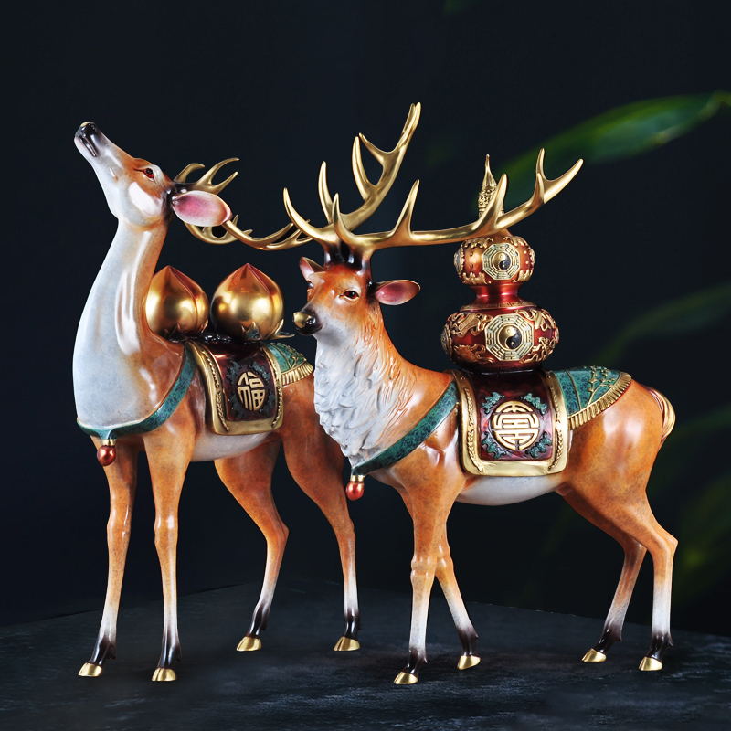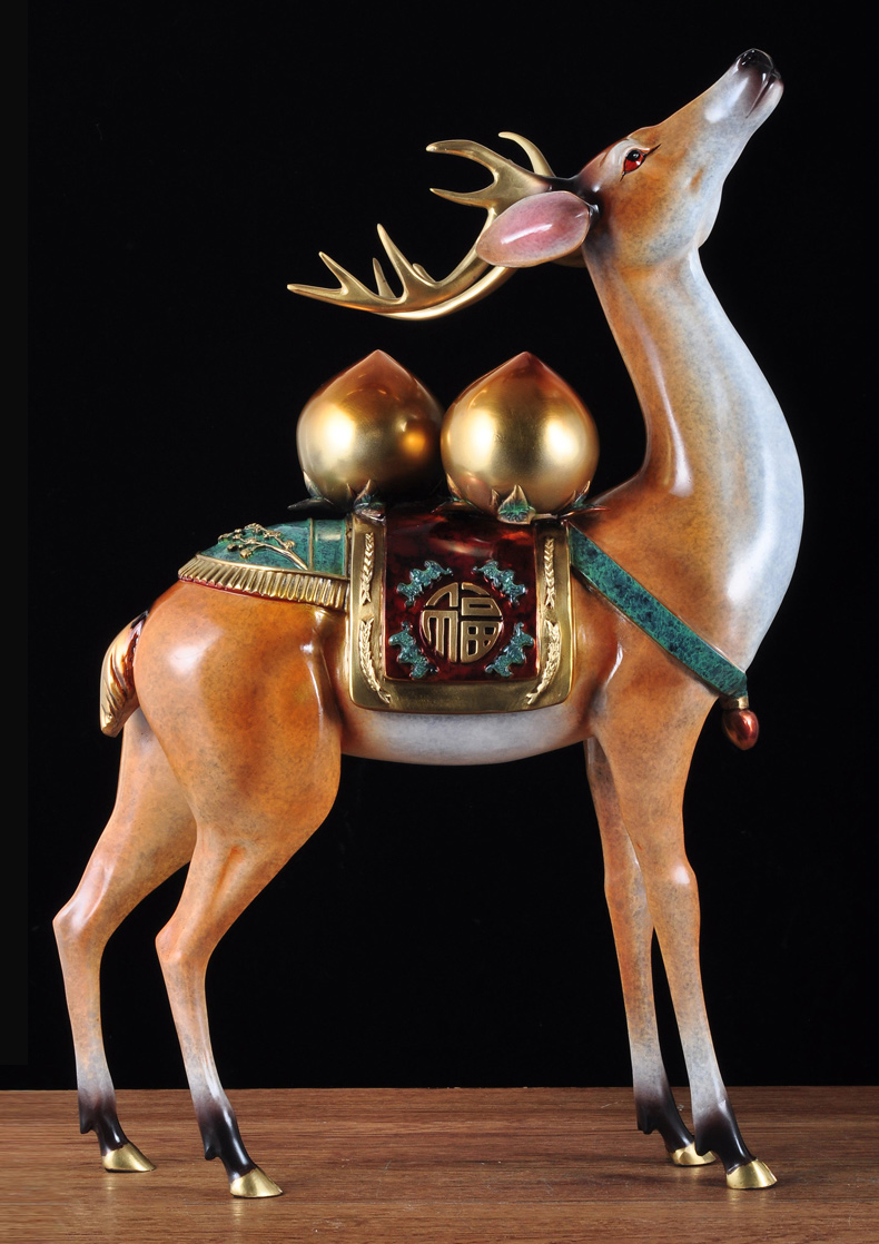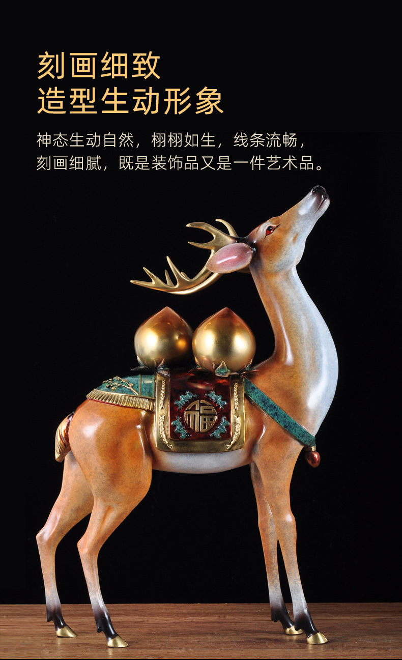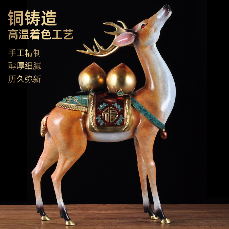 彩铜福鹿招财鹿摆件客厅中式风水铜鹿工艺品家居玄关电视柜装饰品福寿铜鹿(寿桃) 彩铜工艺 39*12*63 大号
