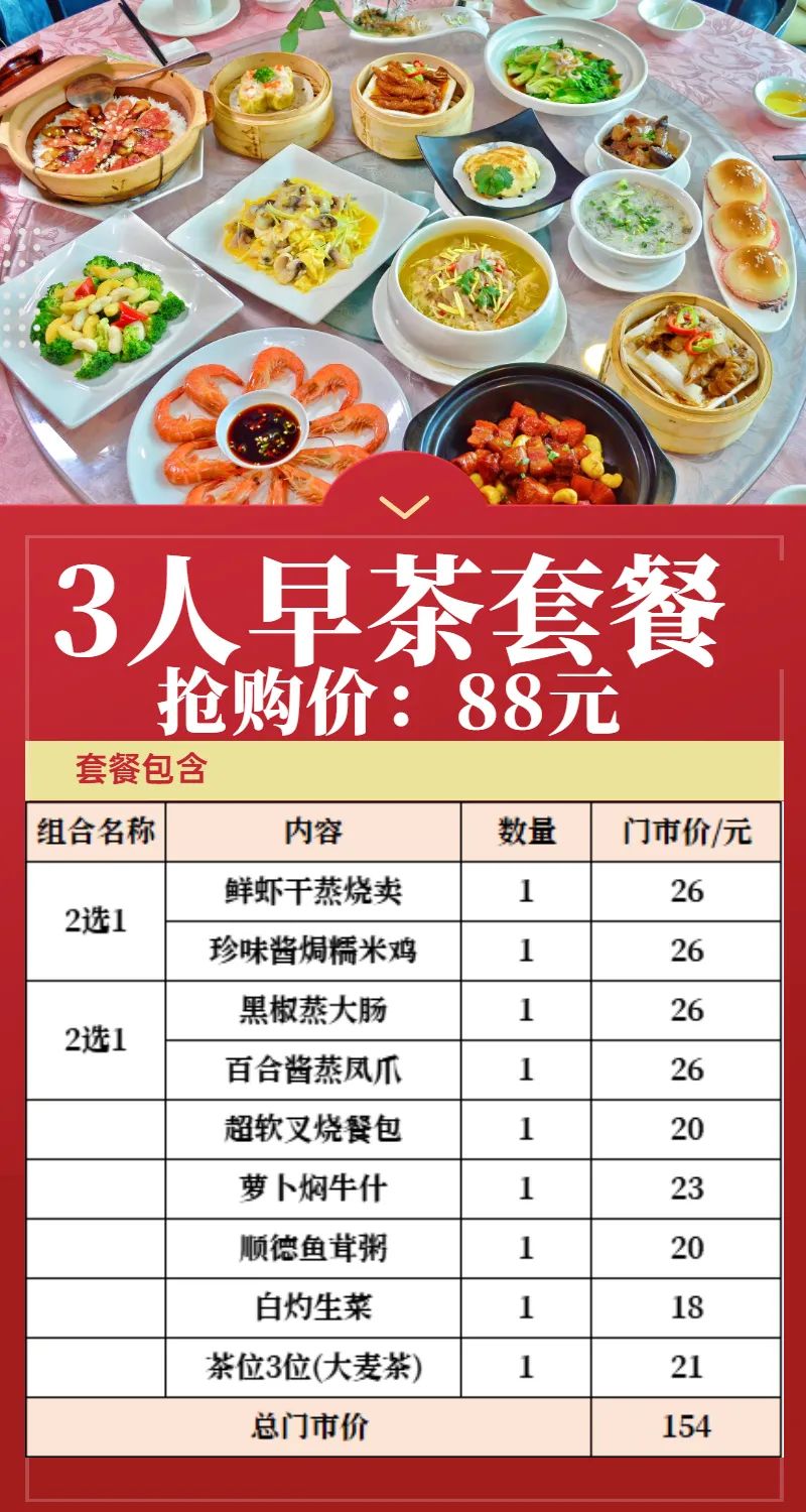 3人早茶套餐抢购价:88元
