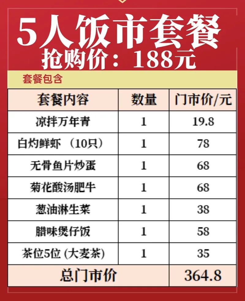5人饭市套餐抢购价:188元