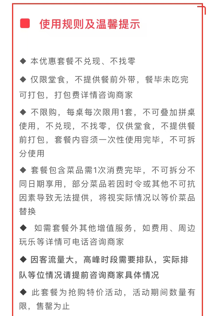 ◆ 套餐不可拆分,菜品须一次性消费完毕,不可与商家其它优惠活动同享