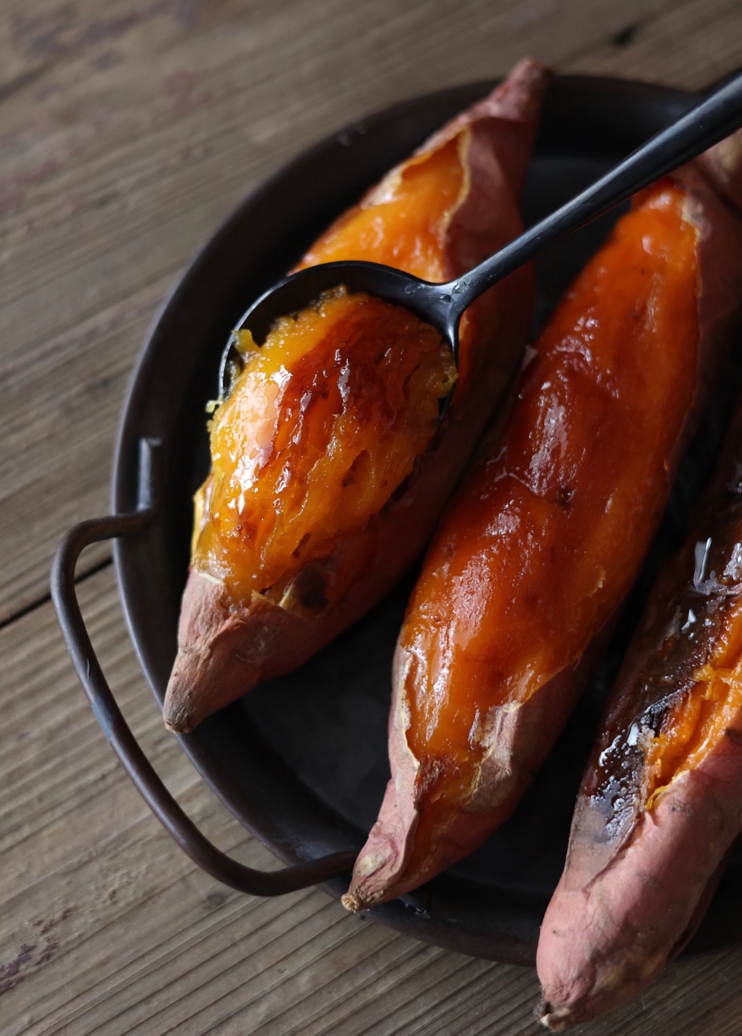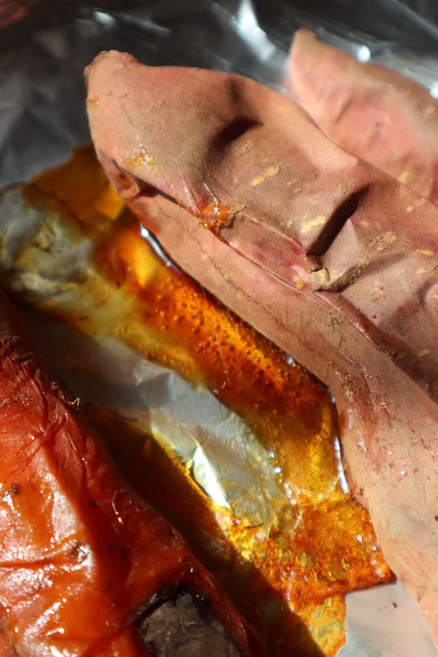 【烤食方法】烟薯水分大,适合用烤箱或者空气炸锅烤着吃,烤出来的烟薯,比蒸煮的水分要少很多糖分转化成蜜汁,随着时间在烤箱里升腾满屋飘香,甜蜜四溢