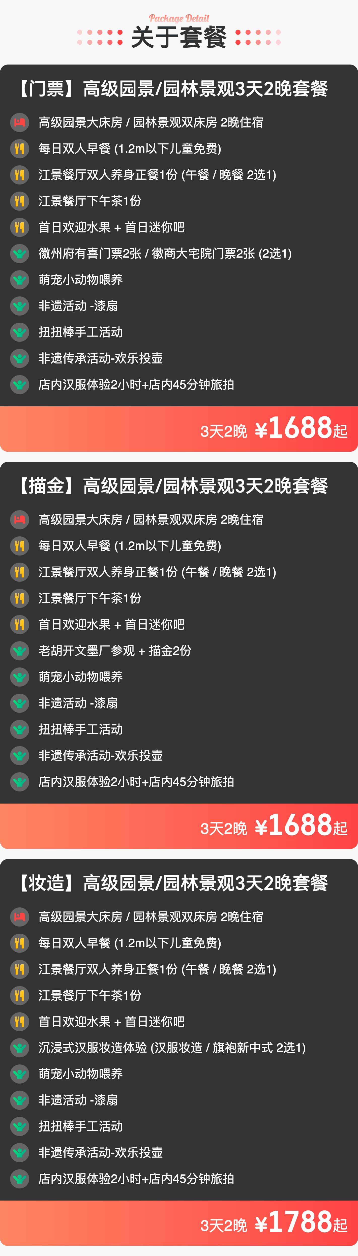3天2晚【黄山紫阳烟雨度假酒店】周末不加价!含正餐、下午茶、门票/徽墨描金/沉浸式妆造、店内活动、汉服旅拍等,畅享12000㎡大型徽派园林景观酒店建筑群~