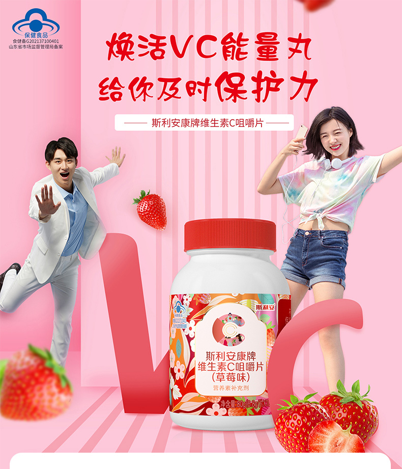 斯利安维生素c咀嚼片男女补充vc维他命C含片100片草莓味甜橙味