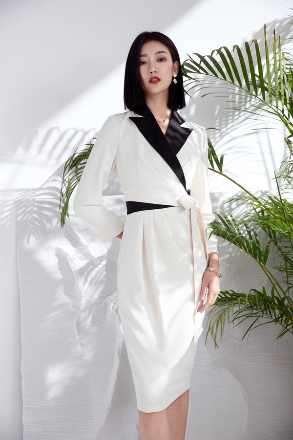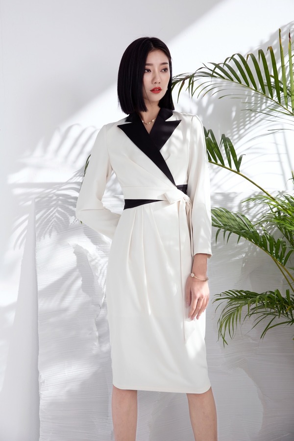 Le Malene 黑白拼接西装领系带连衣裙 15784