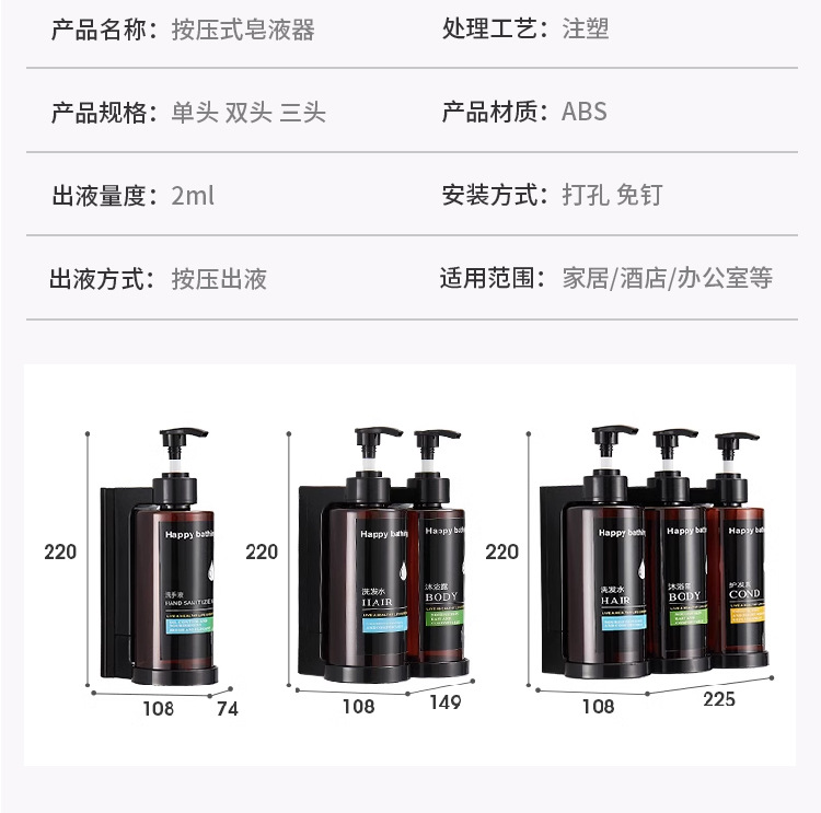 免打孔壁挂式酒店浴室厨房给皂器洗手液沐浴露洗发露按压式皂液器