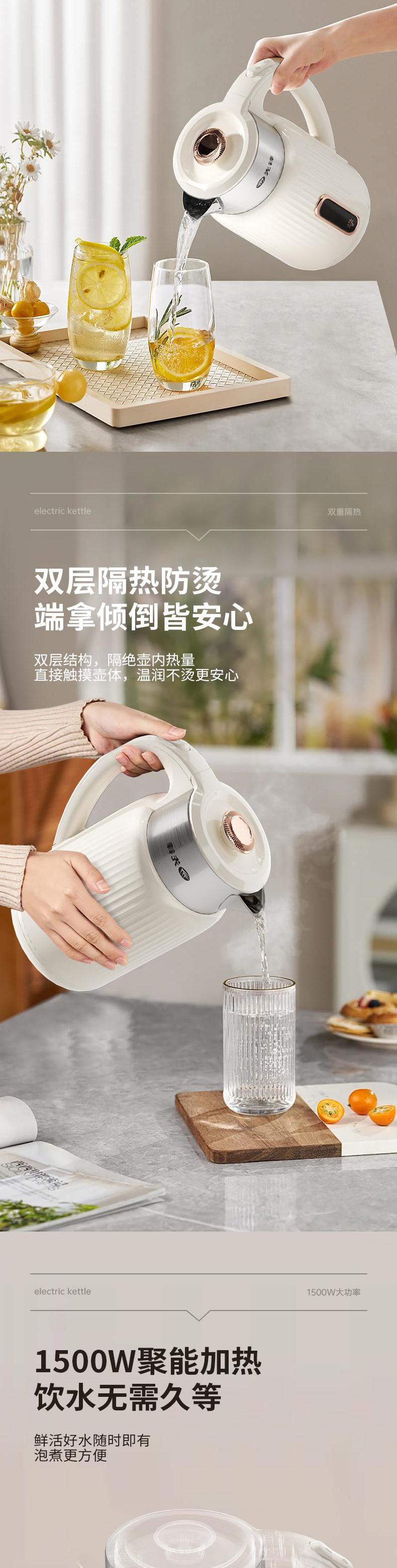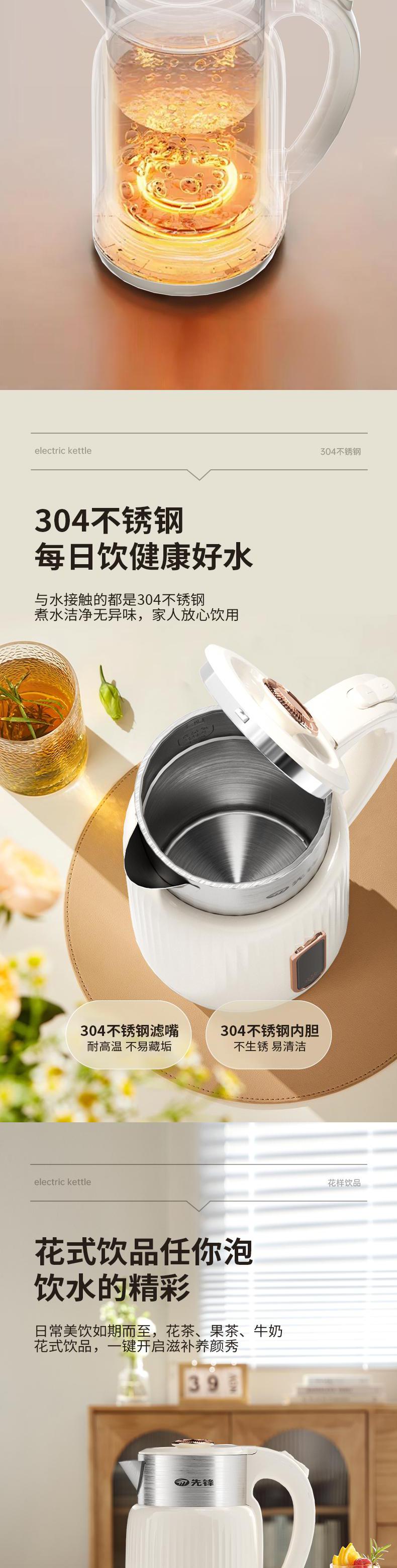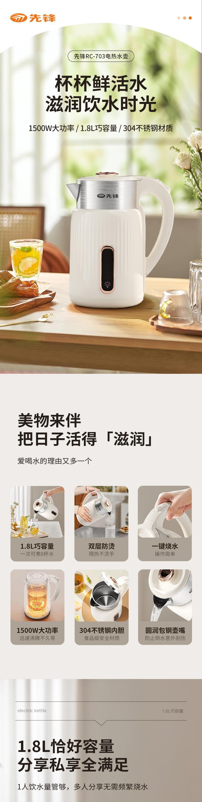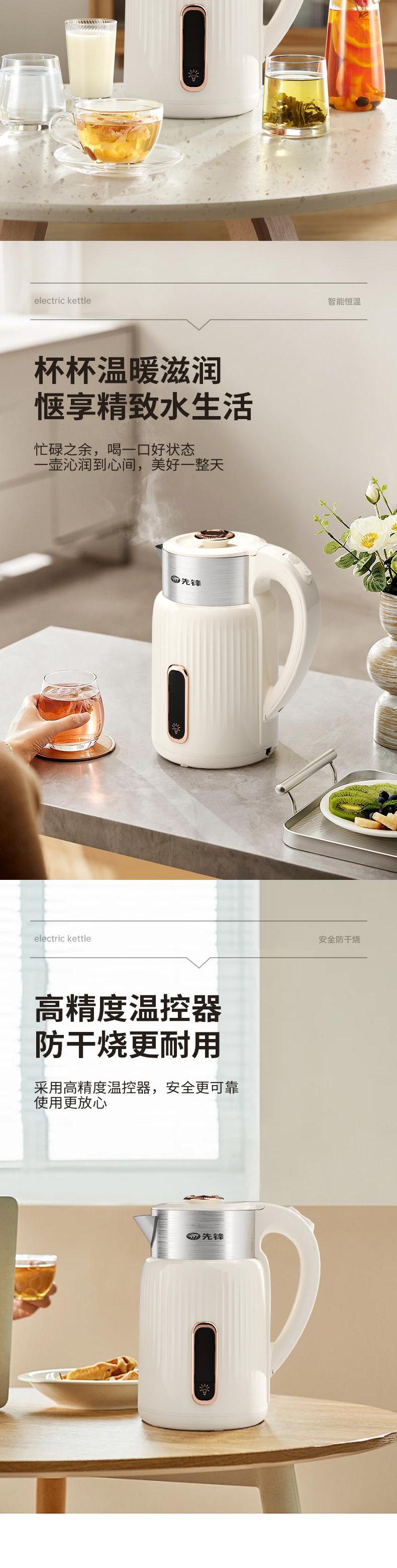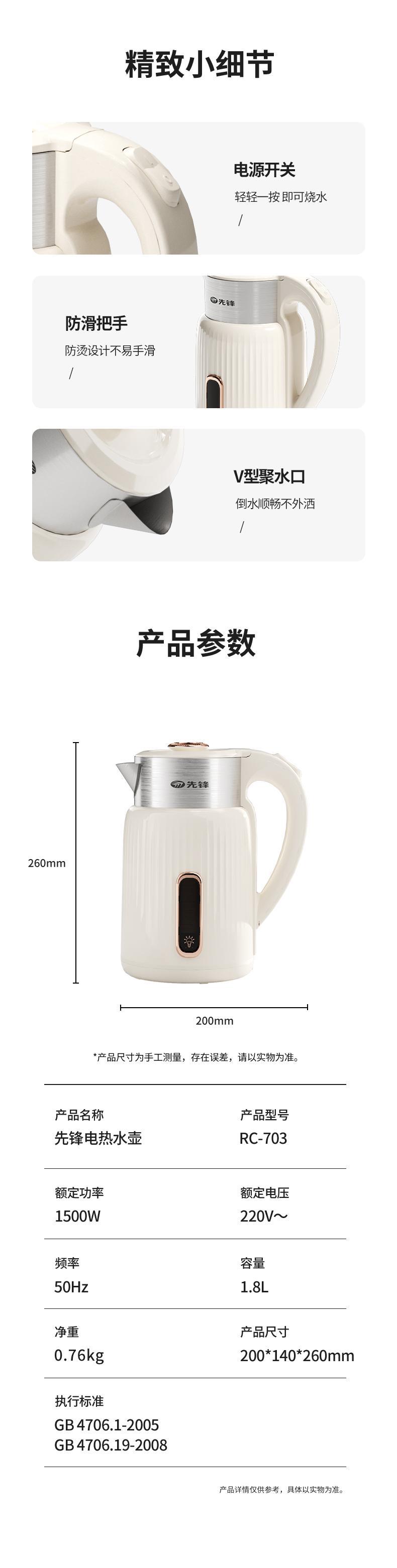 【自营】先锋1500W电热水壶RC-703快速烧水壶自动断电食品级不锈钢防烫大功率沸腾